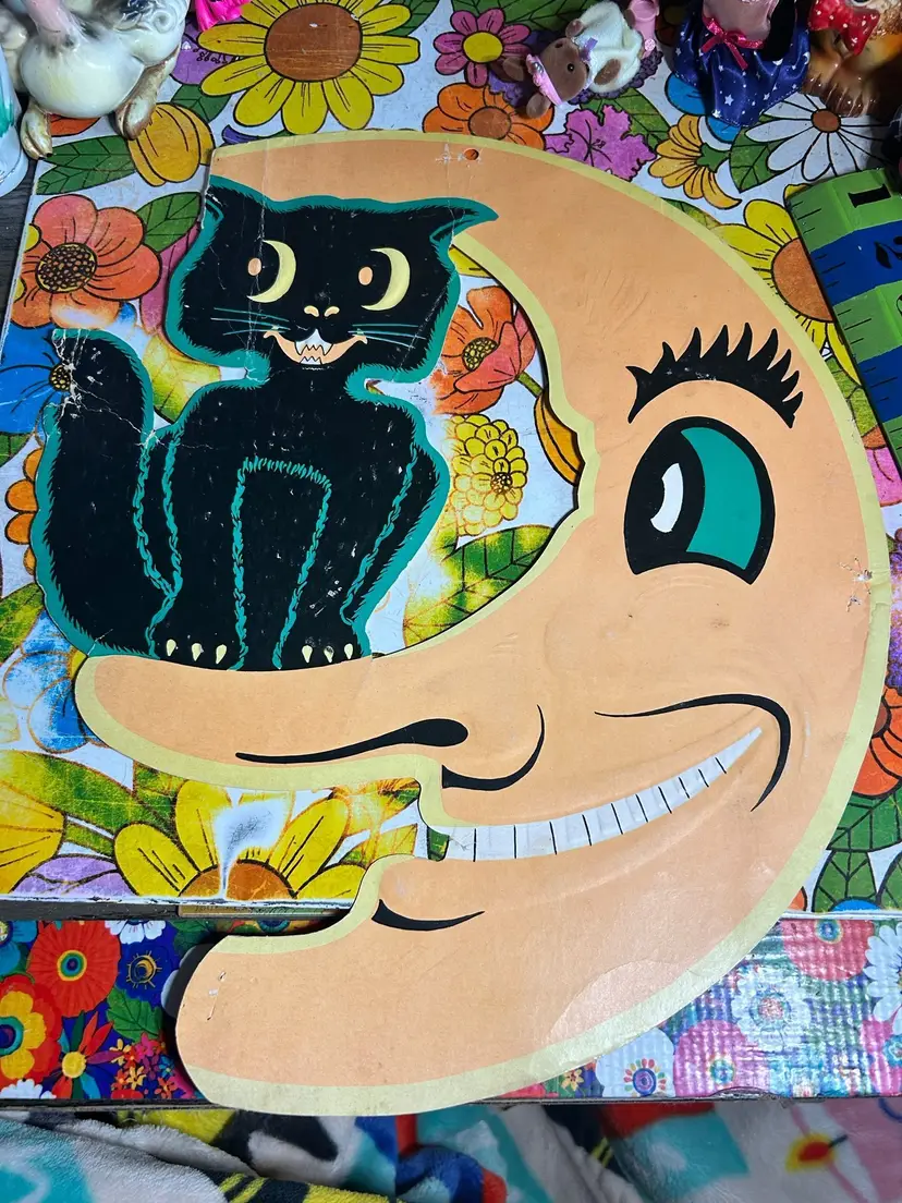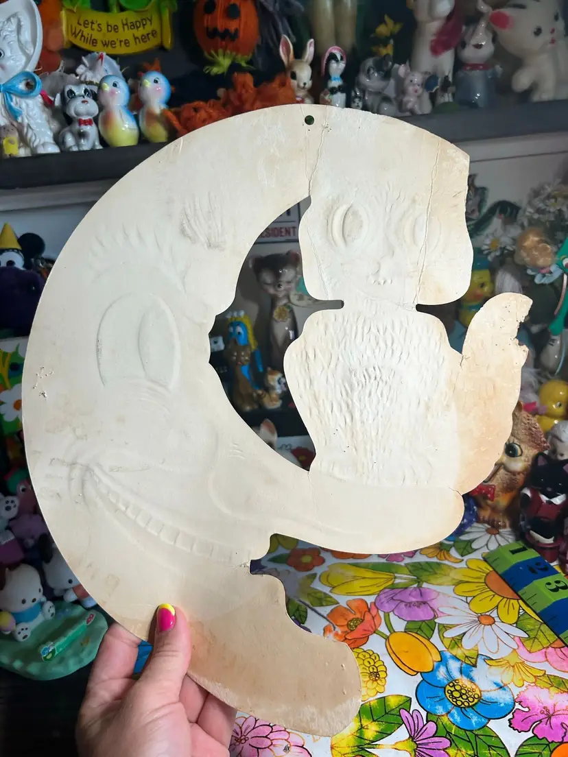For sale! Vintage Biestle Moon and Cat Diecut. Faded! Holes and bending of paper. One sided. 13.5 x 12 inches.