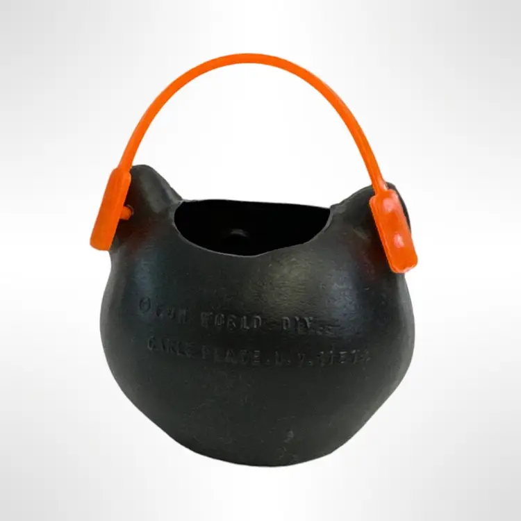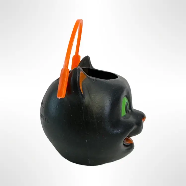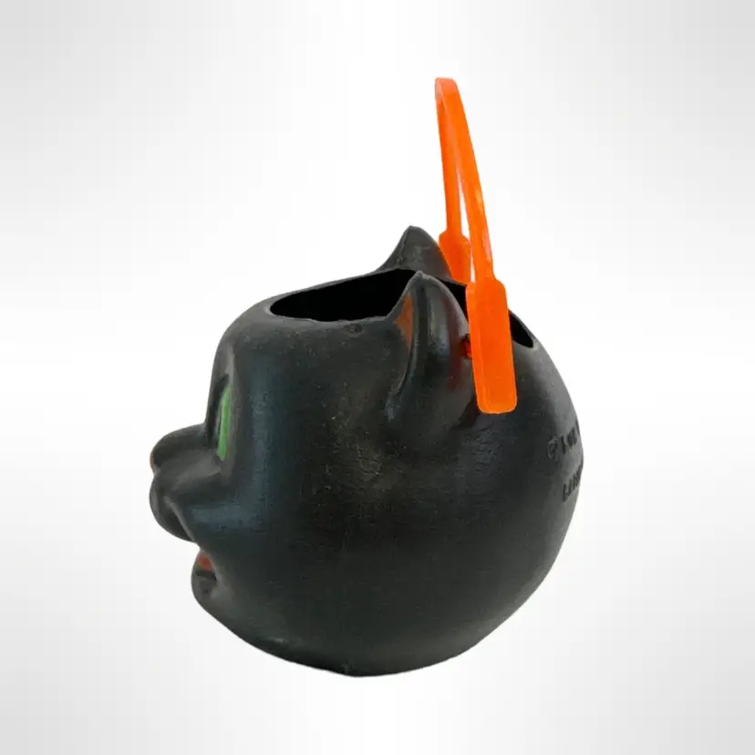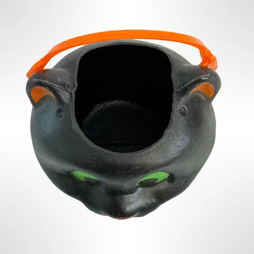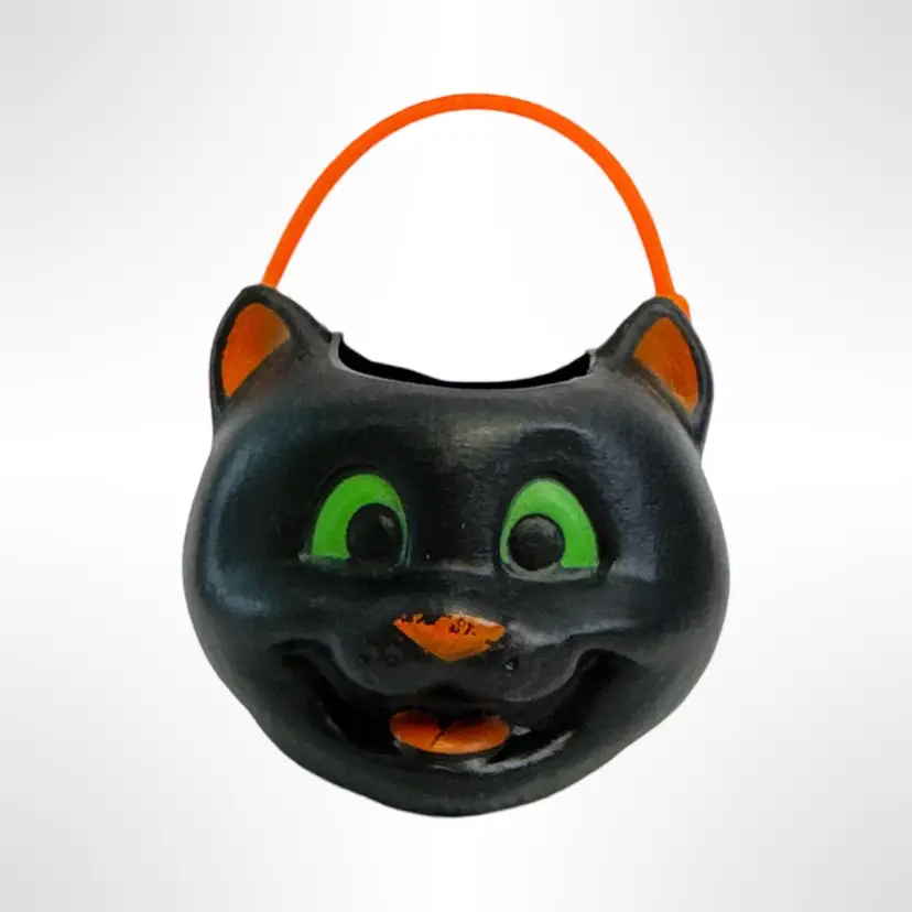 Get into the spooky spirit with this vintage Vintage Miniature Halloween black cat candy bucket! Featuring a charmingly mischievous cat face with bright green eyes and an orange handle, this bucket is perfect as a festive decoration. It's a nostalgic piece that brings back the fun of Halloween from years past. In great condition with no cracks or damage.