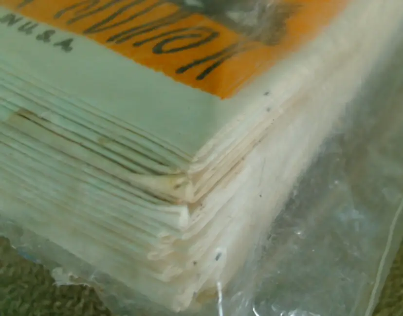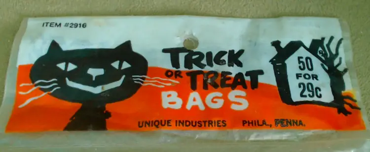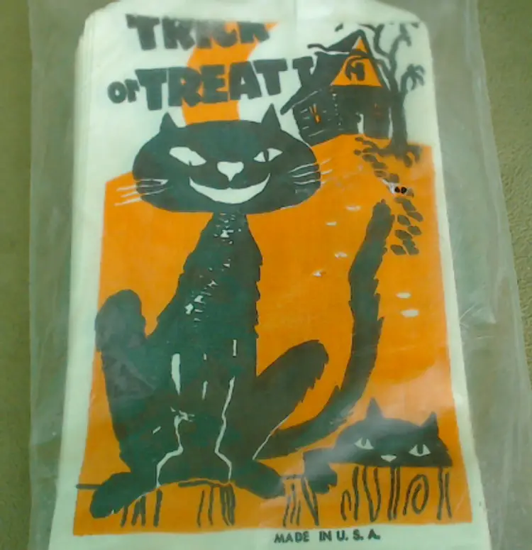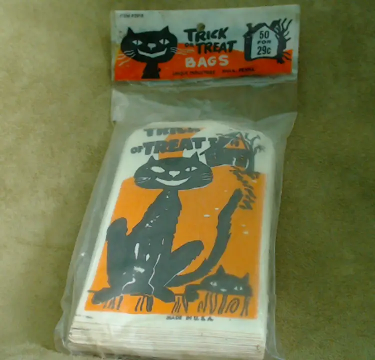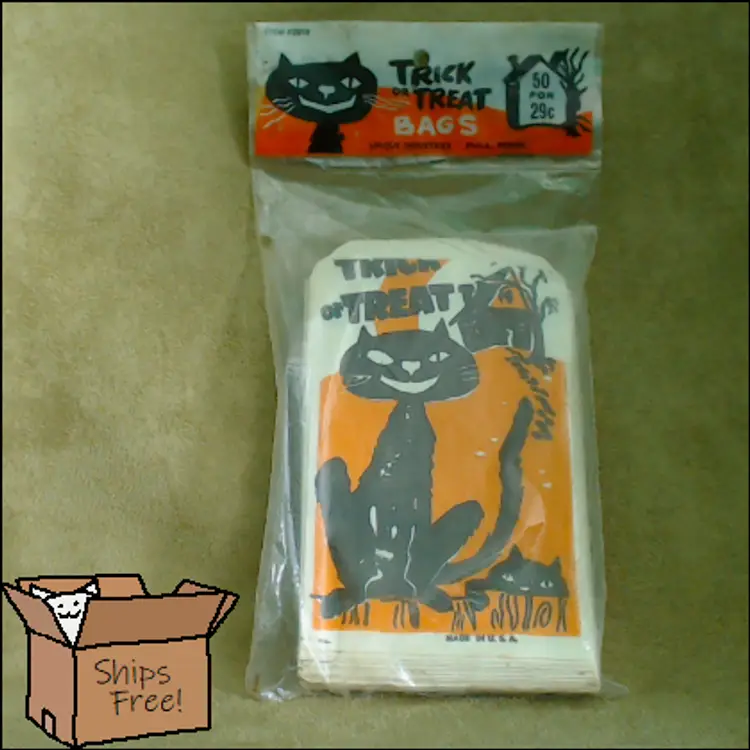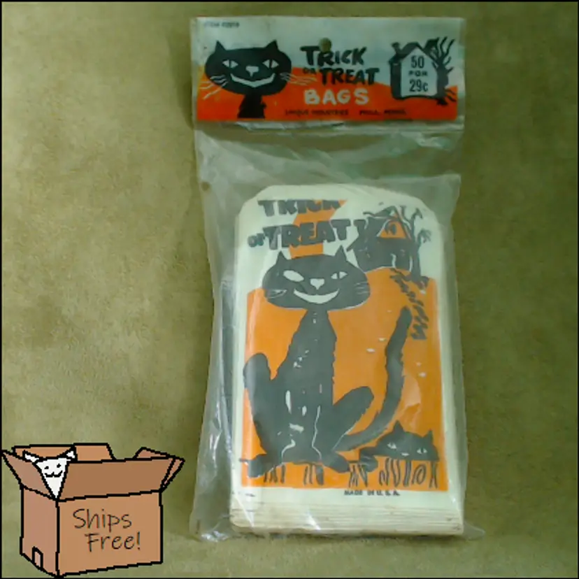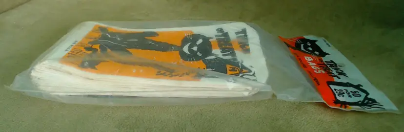 This is a vintage package of paper Halloween treat bags! Made during the early 1970s, by Unique Industries, these bags are still sealed in their original package. The prominent black cat on orange, and the little haunted house in the background, are so classically Halloween. Personally, I like that he has a not-so-scary little buddy cat peeking over the fence! This set would be GREAT for crafting, and of course they'd also be very useful in a vintage treat bag trade. Yes, those are a thing! Condition: This set is in Very Good shape! As stated, the package is still sealed, so all of the baggies should be present. There is wear to the outer plastic bag, but no large tears, just the original punched holes and a little bit of scratch through. The paper bags inside are still nice and bright, without light damage. There is a little bit of browning on the very edge of a few of the bags. It looks like ambient moisture to me - none of the bags are stuck together, there is no smell of mildew, and the browning doesn't extend to the design on any of the bags. I did try to take a picture of the extent of it, but as they're sealed, it was quite difficult to get an angle. Size: The bags measures about 3½" and are about 5½" tall.