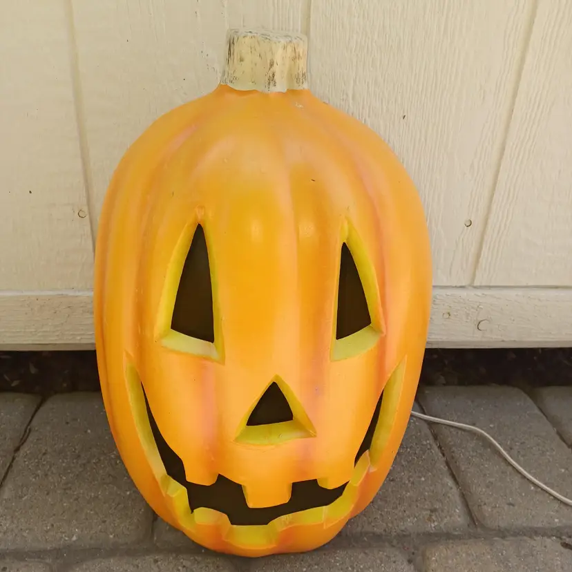 Vintage Halloween Blow Mold Jack O Lantern Pumpkin with Light 16” inch TESTED and is working PREOWNED in good condition wear and tear some scratches and scuffs some nicks paint fading PLEASE REFER TO PHOTOS FOR CONDITION SPECIFIC PICTURES