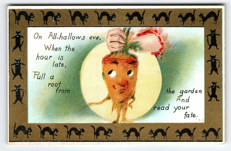 This charming vintage Halloween postcard features a whimsical illustration of a hand pulling a root vegetable with a mischievous human-like face, set against a glowing full moon. The image is bordered by a pattern of black cats with bright blue eyes, enhancing the spooky holiday theme. The card's text reads, "On All-hallows eve, when the hour is late, pull a root from the garden and read your fate," evoking early 20th-century Halloween folklore and traditions.
