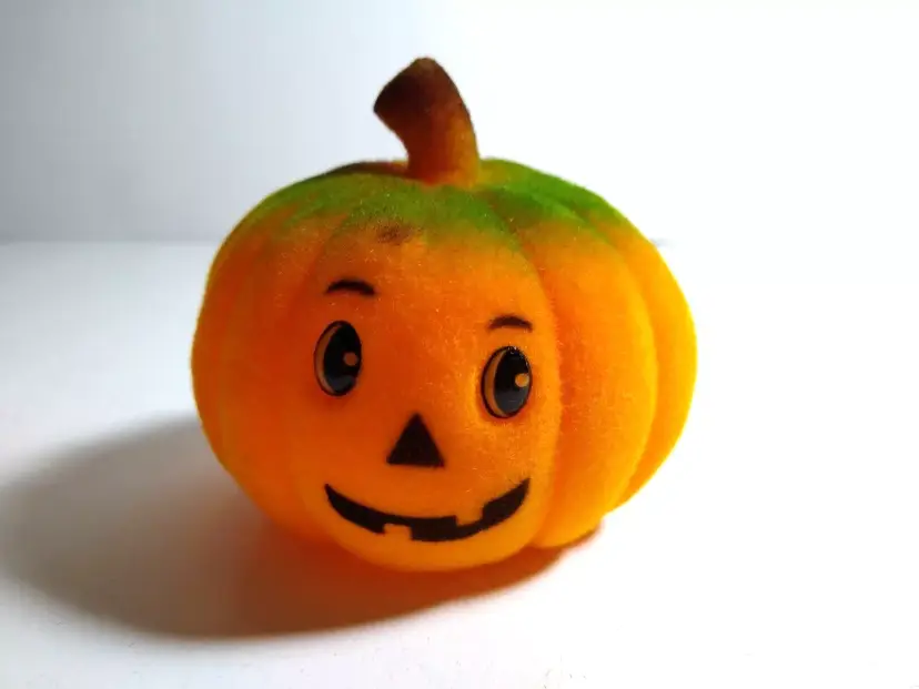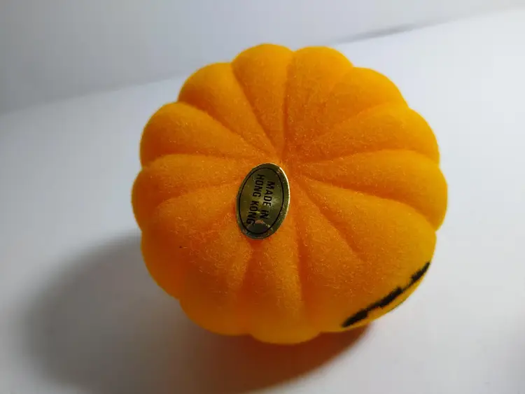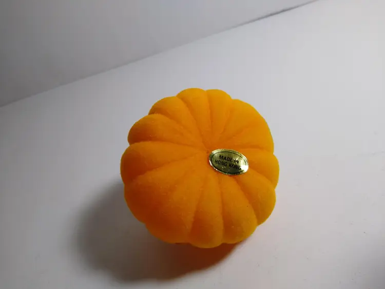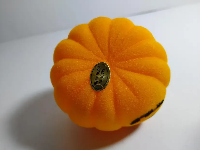 Vintage Halloween JOL pumpkin toy. This is a old new old stock flocked fabric hard toy decoration. Has tag on base reads "Hong Kong". Cute and collectible. Great gift idea. 2.5" x 2.25". Orders are shipped with care.