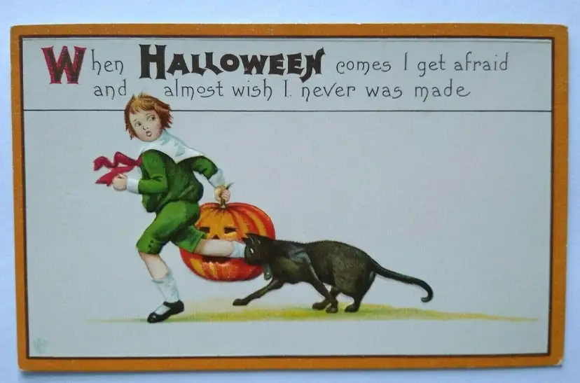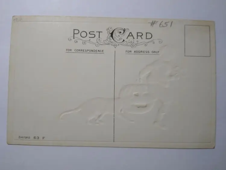 Antique vintage original Halloween postcard. Clean card with light age wear. This is a variation of the Stecher series 63 card as it has a different logo with artists initials James E. Pitts on front left as shown. Back has writing but was never posted. See photos. Stock #377.