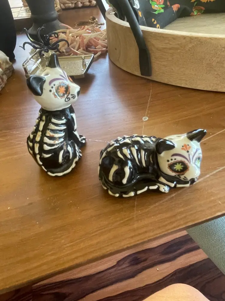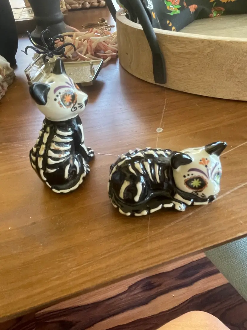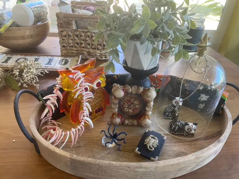 Keep together as vignette or separate and sell items separately. Most items are vintage and value is between $200- $225. Set includes: -Large wood tray (not vintage) -Small piece of vintage Halloween fabric -small vintage glass cloche -vintage cat salt n pepper -vintage scorpion belt buckle -vintage acrylic owl napkin holder -vintage Ann Klein necklace -vintage coral necklace (a few pieces are broken) -vintage glass octopus unsigned