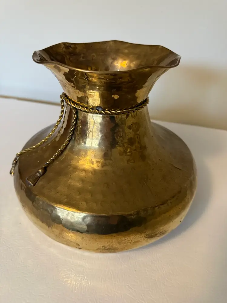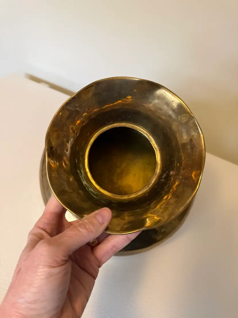 This vintage hammered brass vase features a round body with a flared wavy edge neck.