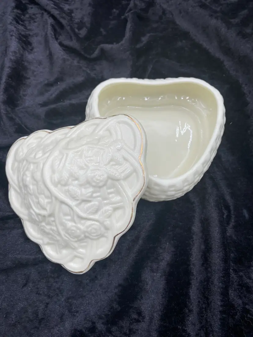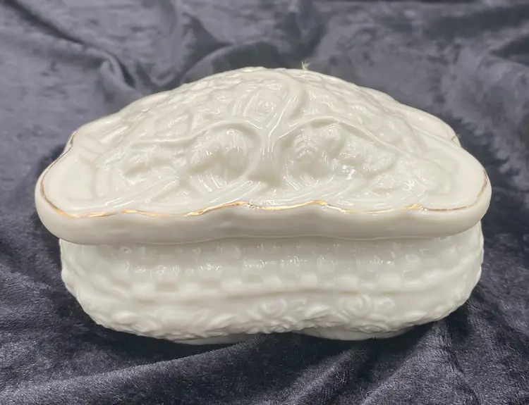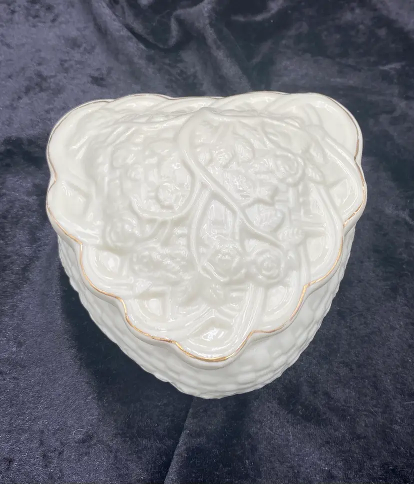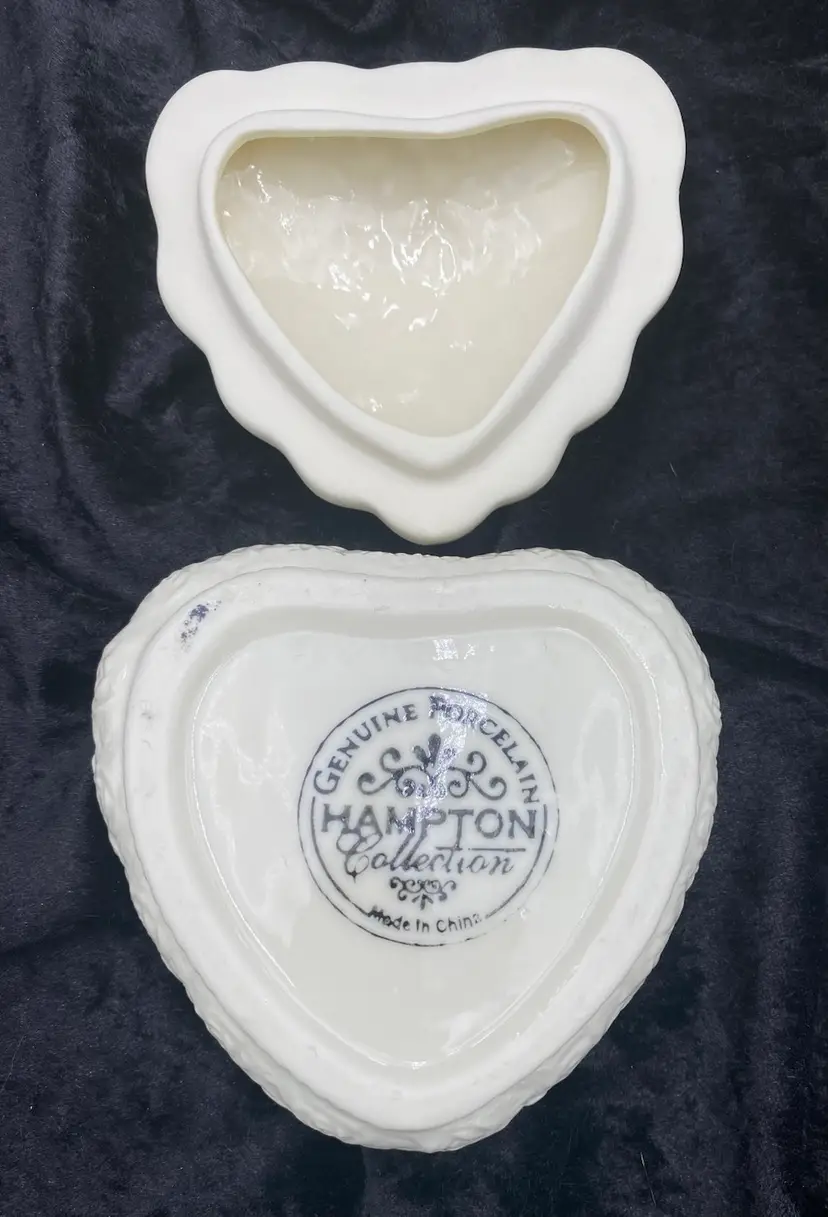 Discover elegance with this Hampton Collection embossed porcelain trinket box, a charming keepsake perfect for safeguarding your small treasures. The ivory heart-shaped box is beautifully adorned with an intricate basketweave pattern and embellished with delicate twining roses, accented by a rich gold trim that exudes a timeless sophistication. Crafted from high-quality porcelain, this medium-sized trinket box, originating from the 1990s, is not only a visual delight but also a functional piece with a secure lid. Measuring 4.5 inches in length, 2.6 inches in height, and 4.8 inches in width, it's sized just right for any room or occasion, making it a versatile addition to your home or a thoughtful gift for someone special.