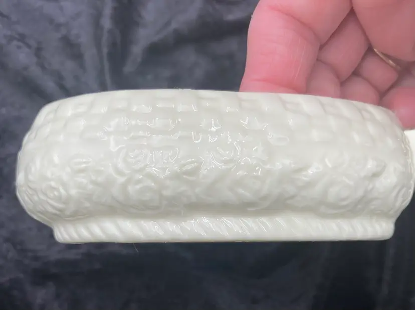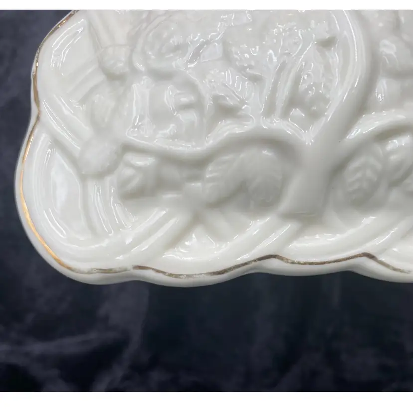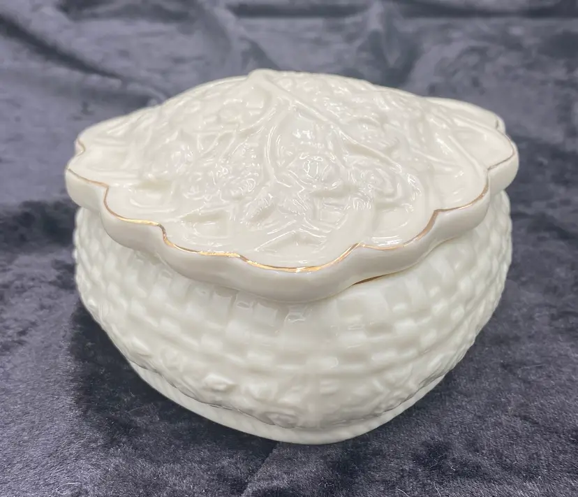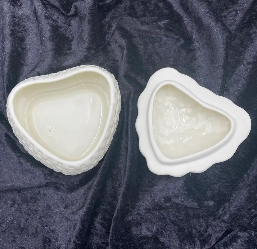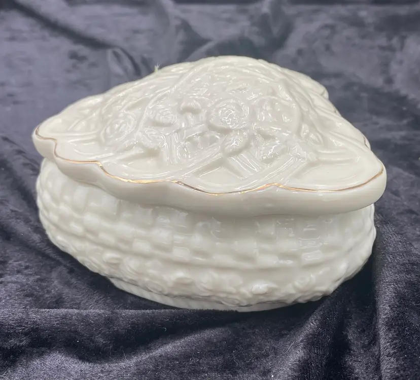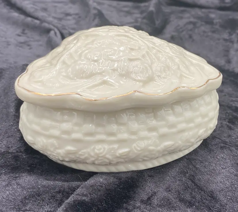 Discover elegance with this Hampton Collection embossed porcelain trinket box, a charming keepsake perfect for safeguarding your small treasures. The ivory heart-shaped box is beautifully adorned with an intricate basketweave pattern and embellished with delicate twining roses, accented by a rich gold trim that exudes a timeless sophistication. Crafted from high-quality porcelain, this medium-sized trinket box, originating from the 1990s, is not only a visual delight but also a functional piece with a secure lid. Measuring 4.5 inches in length, 2.6 inches in height, and 4.8 inches in width, it's sized just right for any room or occasion, making it a versatile addition to your home or a thoughtful gift for someone special.
