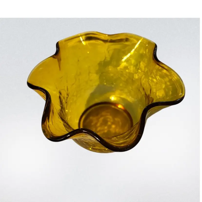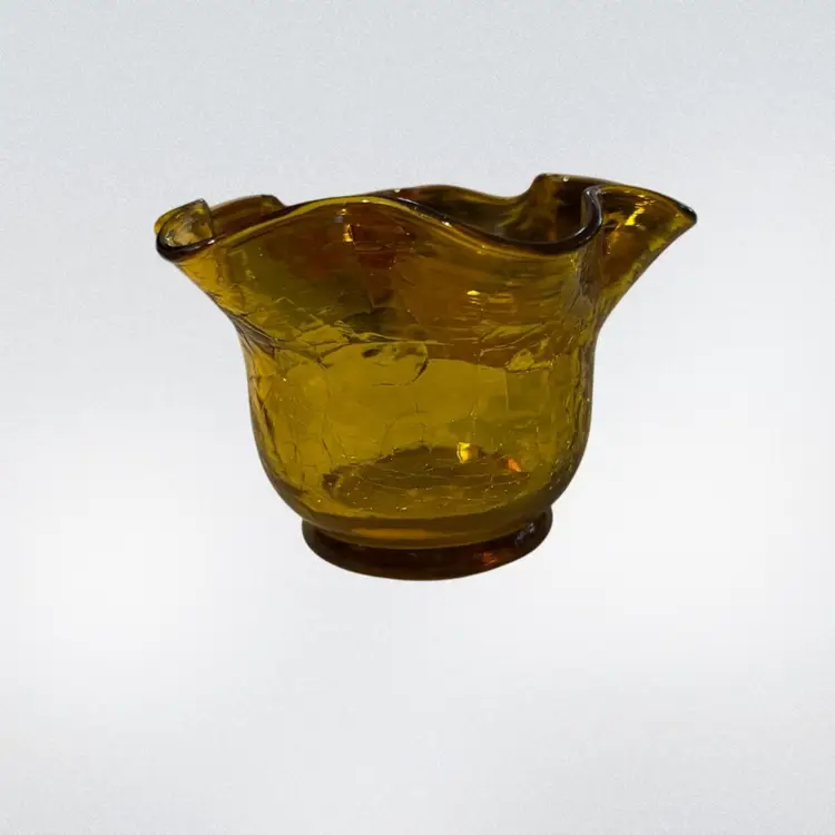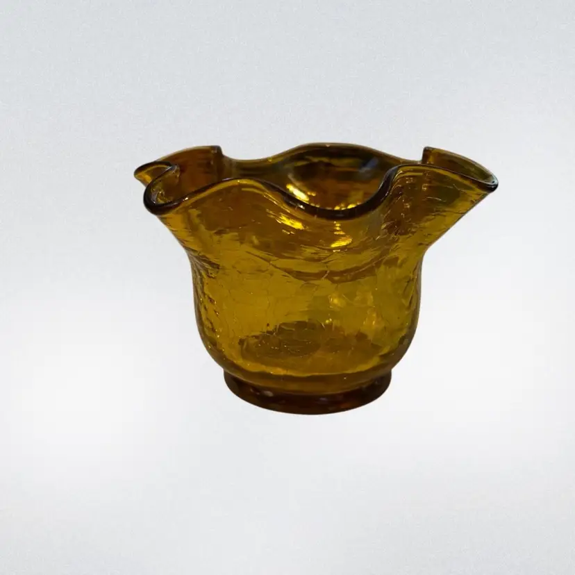This item is a vintage hand-blown amber crackle glass vase featuring a ruffled, fluted rim.