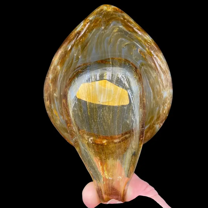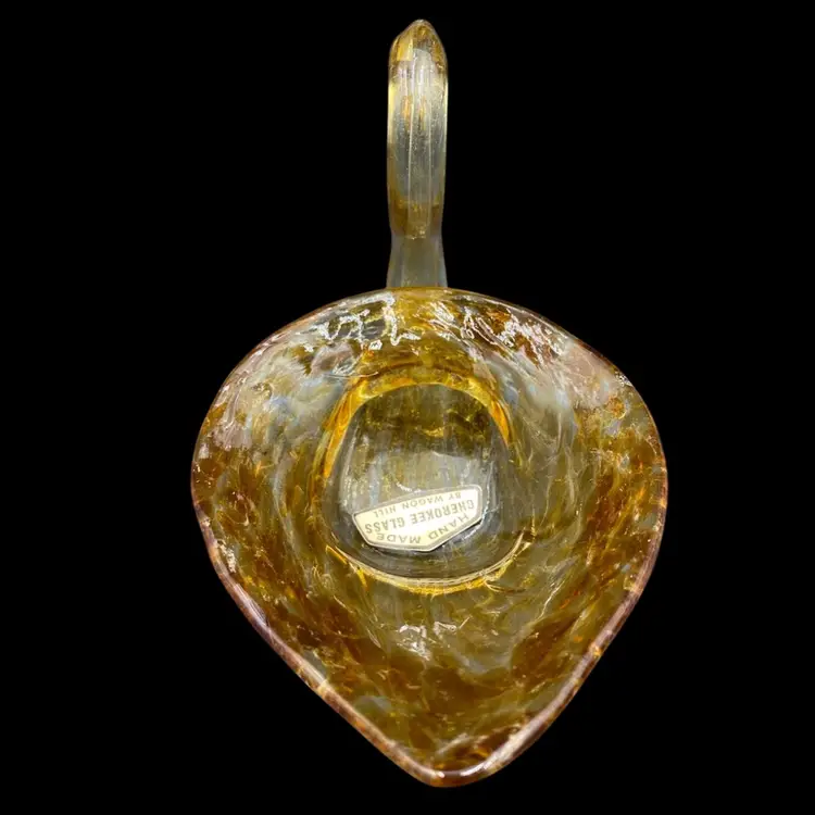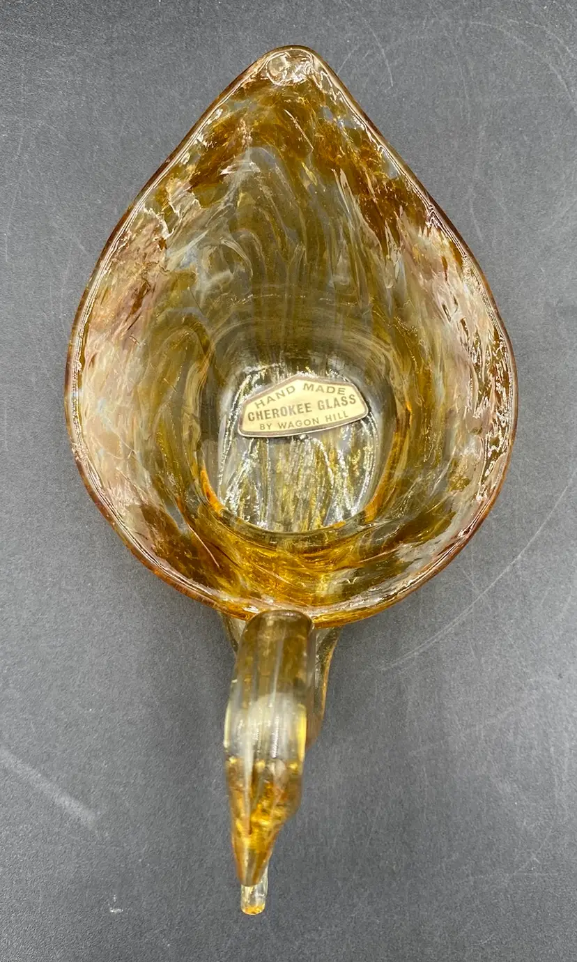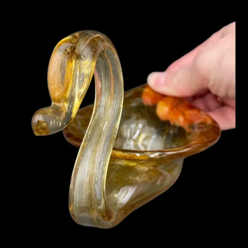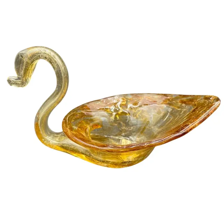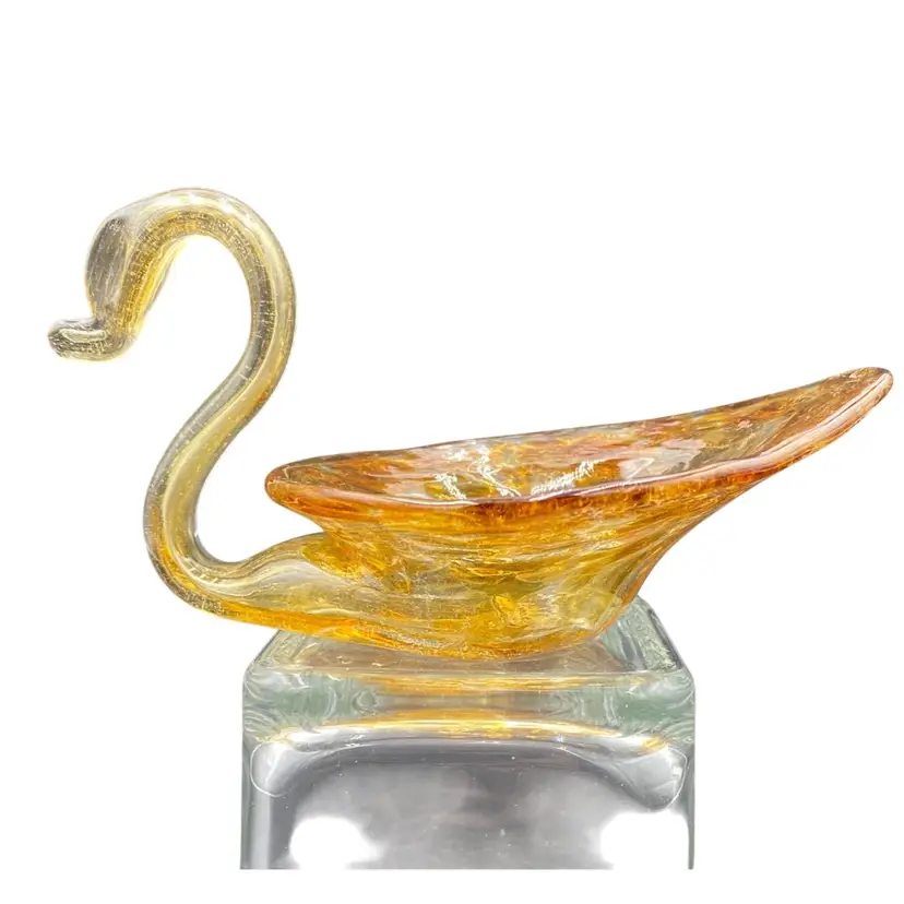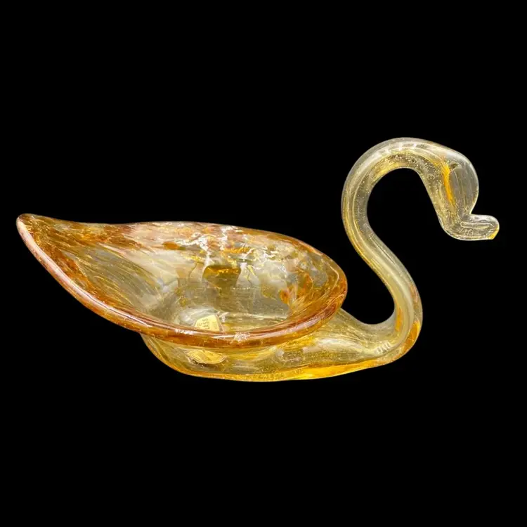 This vintage hand blown amber glass swan figurine is a unique addition to any collection. Crafted by Cherokee Glass by Wagon Hill in the 1970s, this original piece features an abstract pattern and a glossy finish. Measuring 3.5 inches in height, 6.25 inches in length, and 3.6 inches in width, this figurine weighs 5.9 ounces and has a printed label. This vintage piece is a great addition to your collection. It can also be used to hold small items.