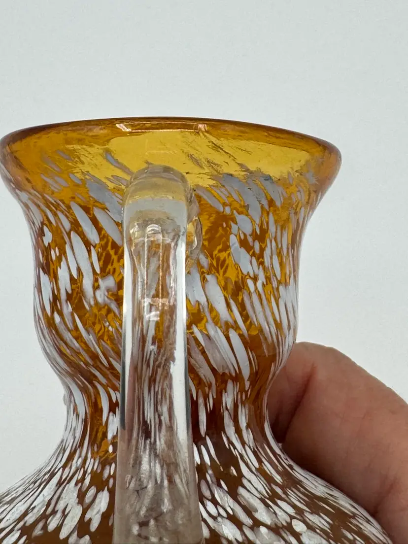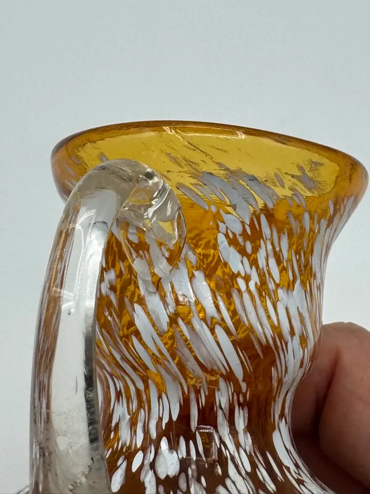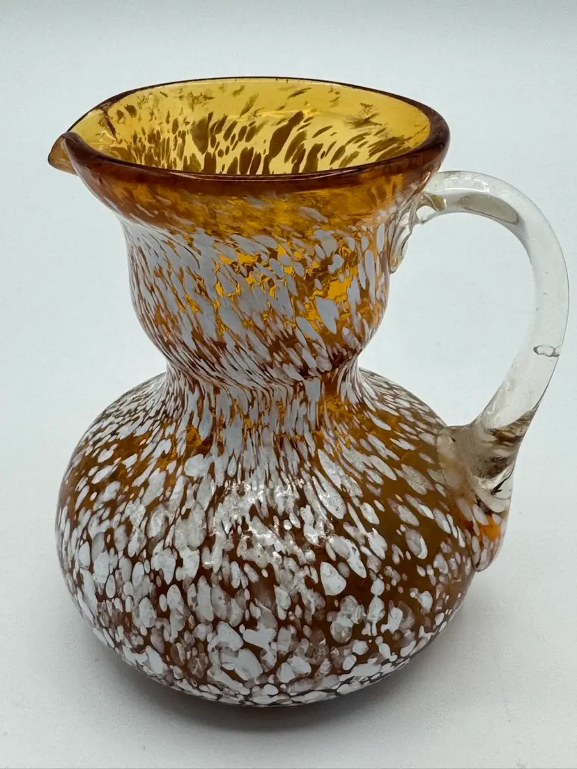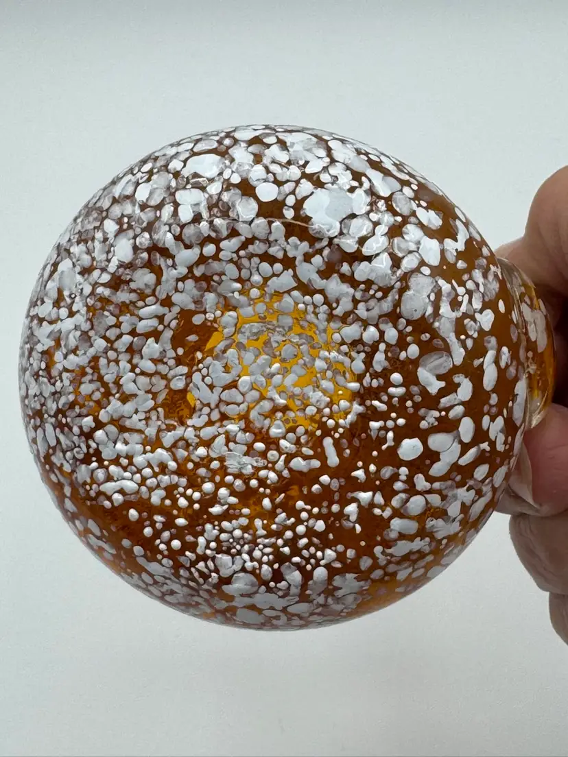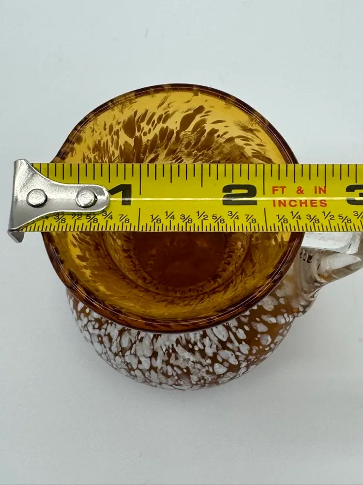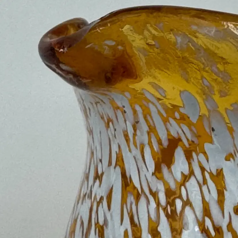 Beautiful amber glass with white speckles. 3.5 inches tall x 3 inches length x 3 inches wide.