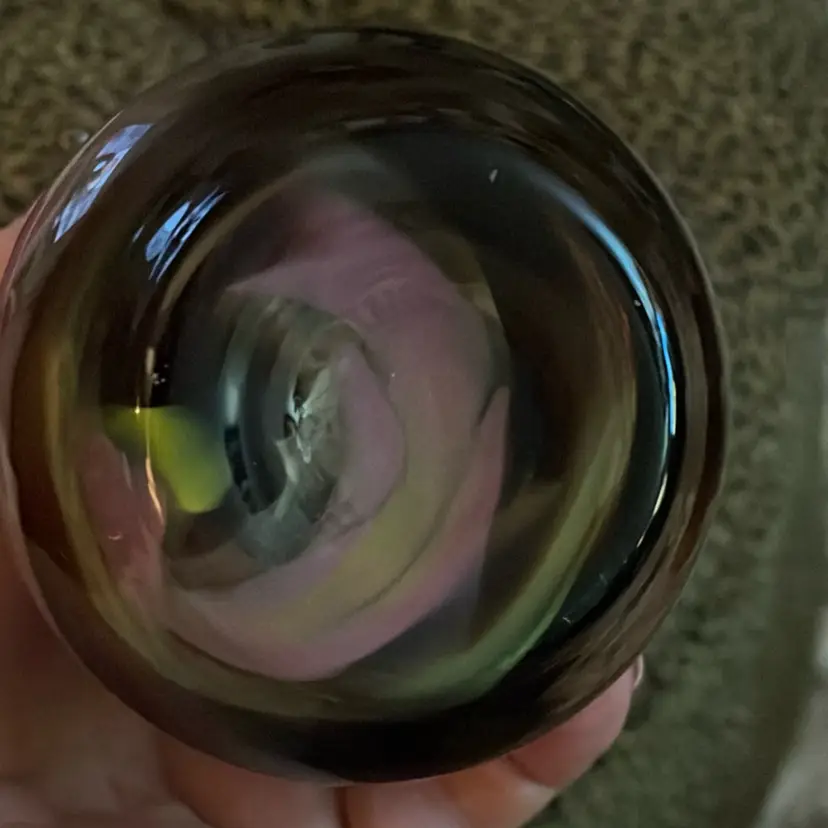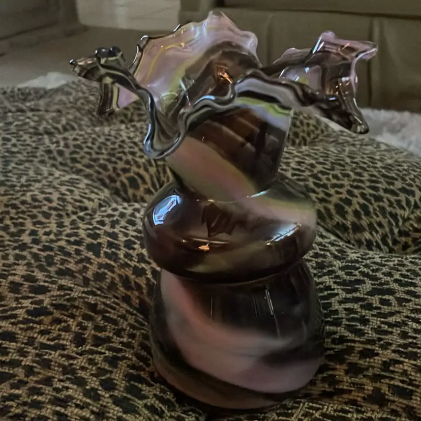 Heavily ruffled top with swirled colors from dark purple, pale blue to pink. Nice smooth pontil mark.