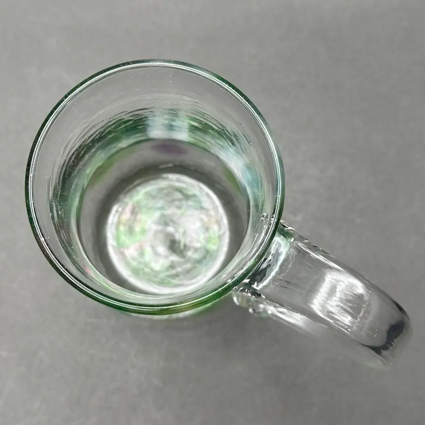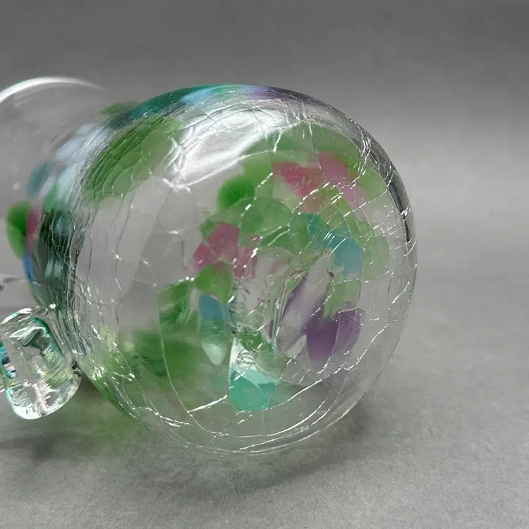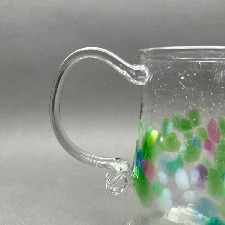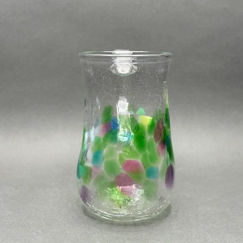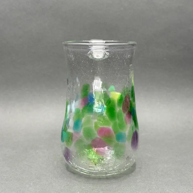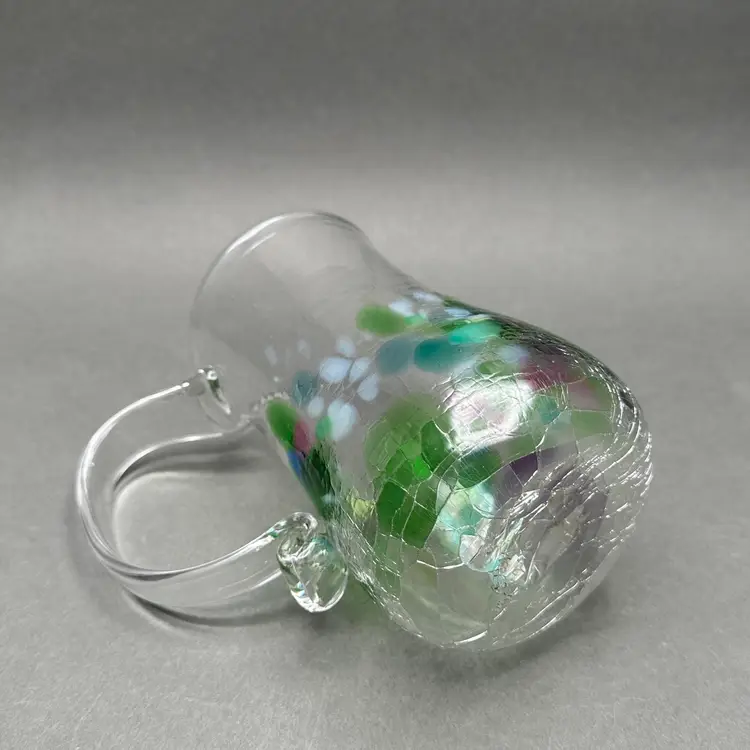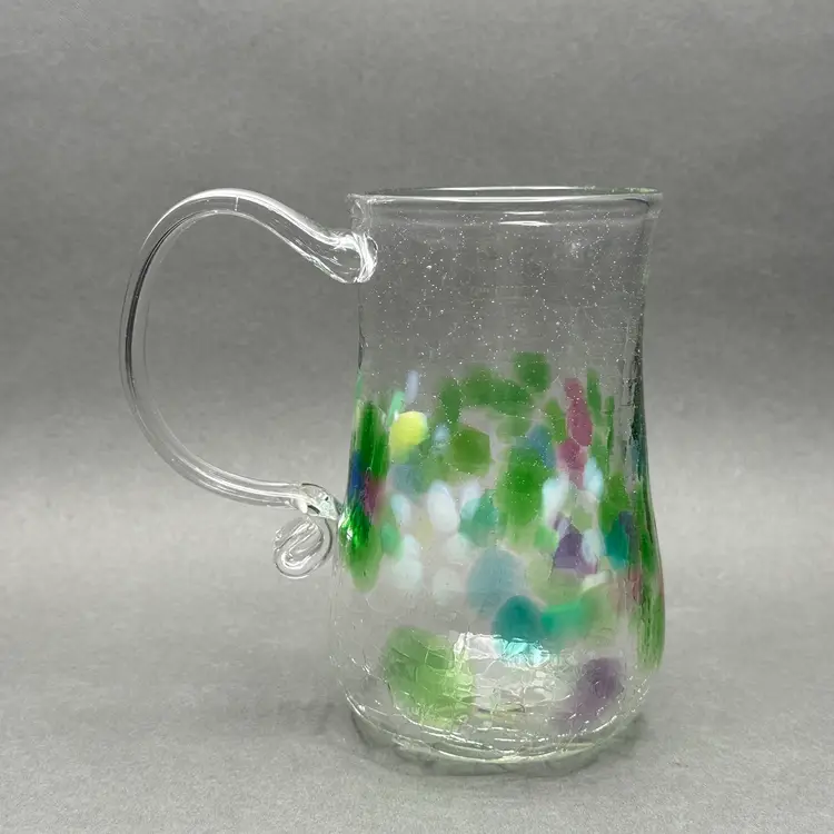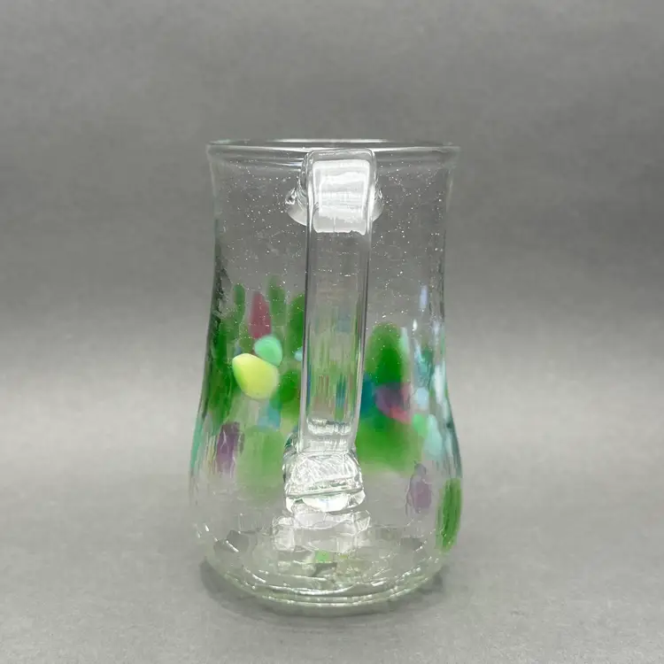 Vintage hand blown clear crackle glass mug with confetti of green, pink, purple and yellow.