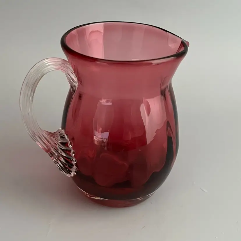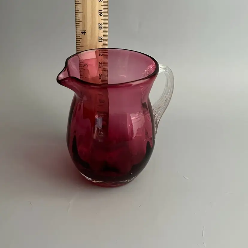 This vintage cranberry glass pitcher is a beautiful addition to any collection. The clear swirl applied handle adds a unique touch to this hand-blown glass piece. Measuring at 3.5 inches in height and 3 inches in diameter, this small pitcher is perfect for serving drinks or as a decorative piece. Its glossy finish and solid pattern make it a timeless piece that will complement any decor.