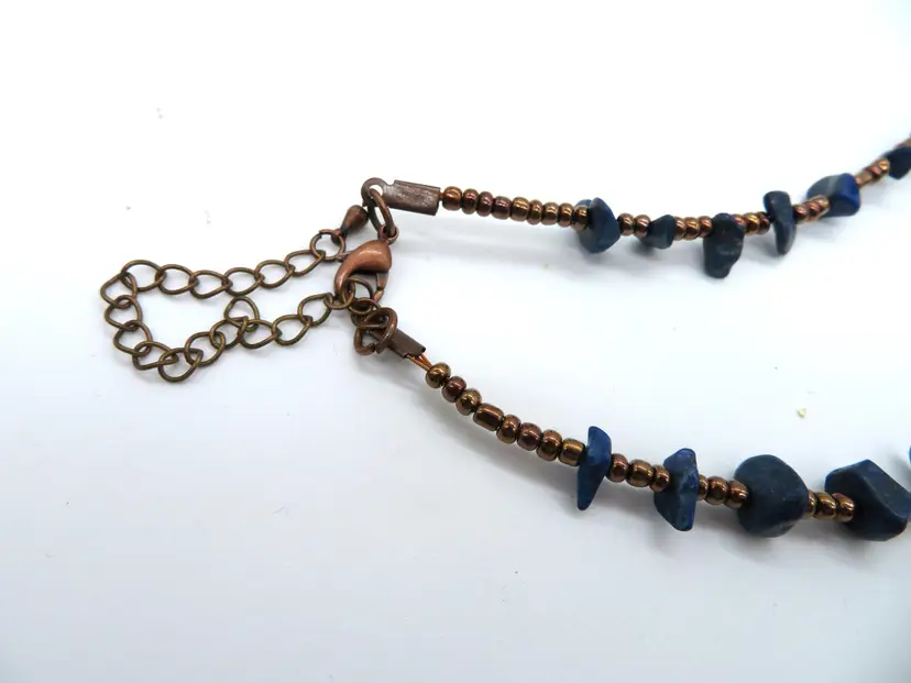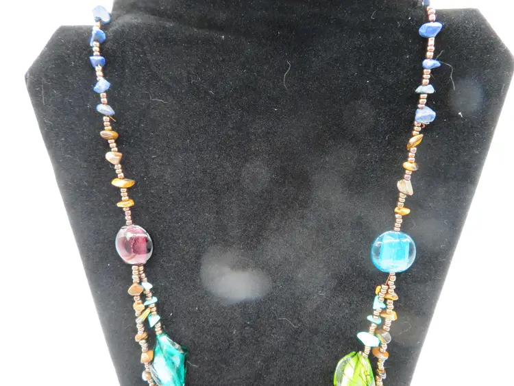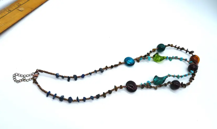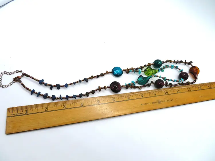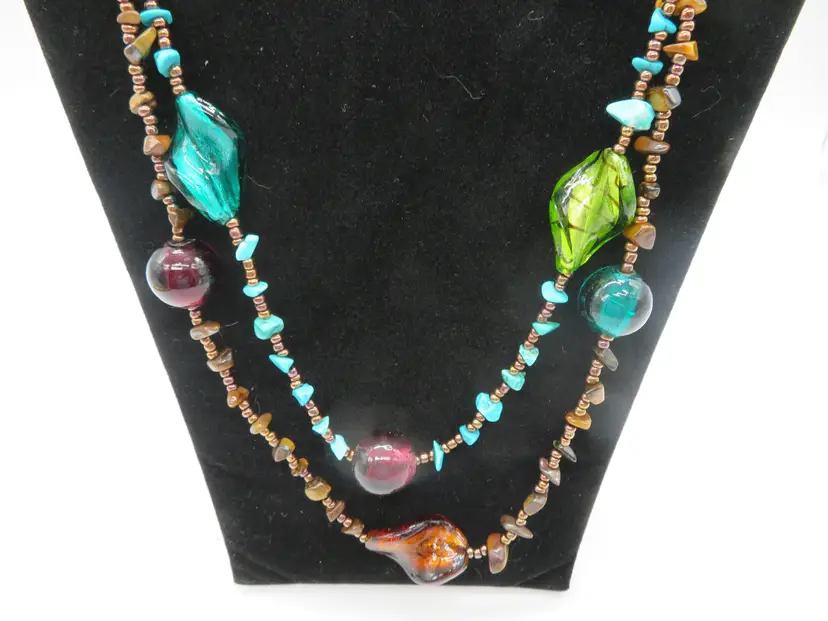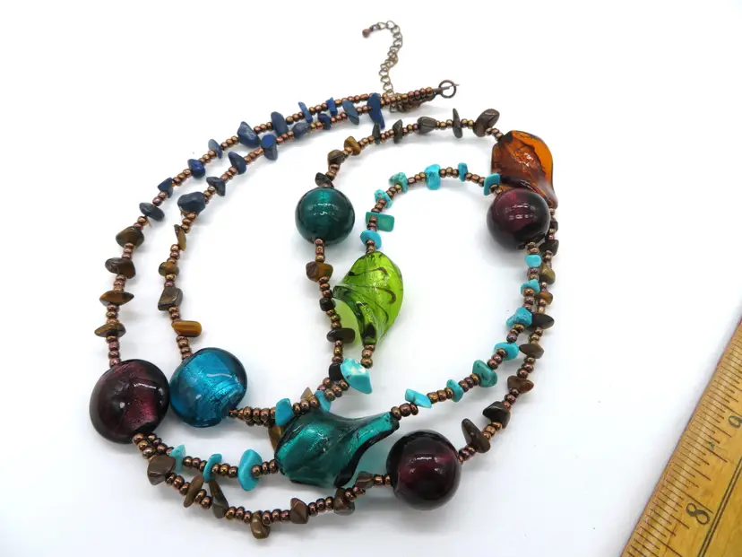 Item Description: For your consideration is a vintage 1990’s single strand with second strand mid-length, with hand-blown art glass beads. The other beads are a copper and turquoise color. The necklace is 13.5” long with a drop of 10” from the neck. It feels good on the neck, cold and smooth. The camera does not capture it’s beauty!