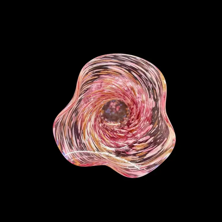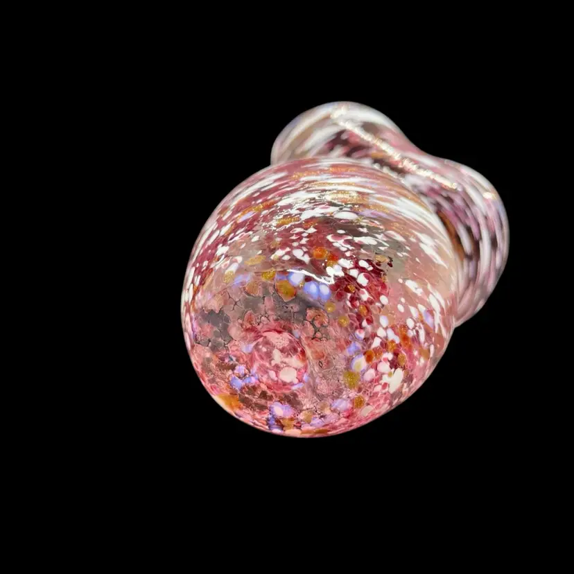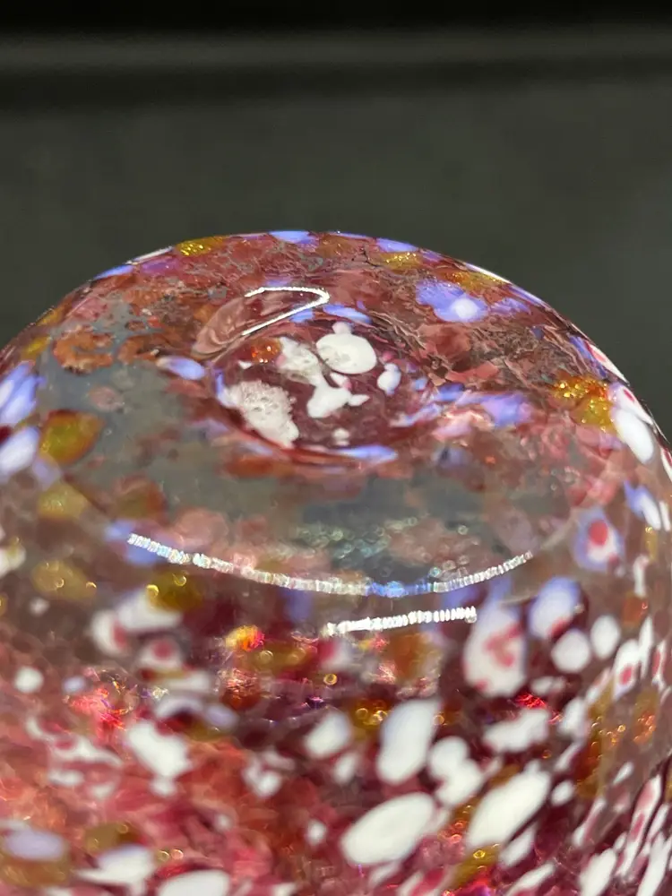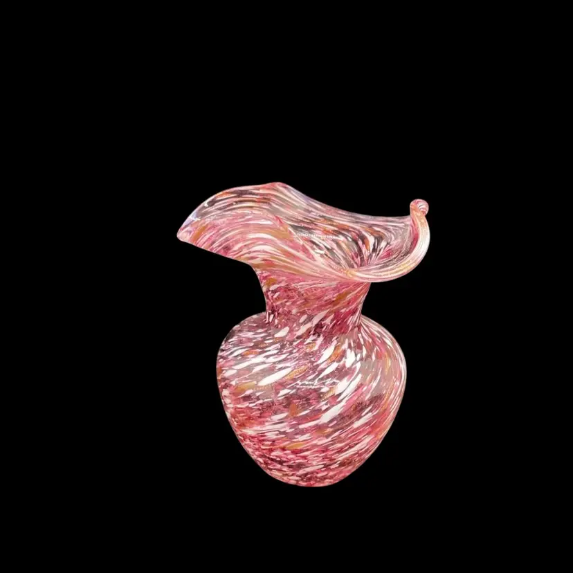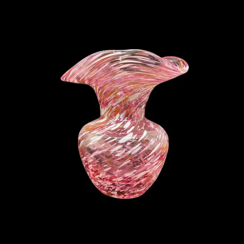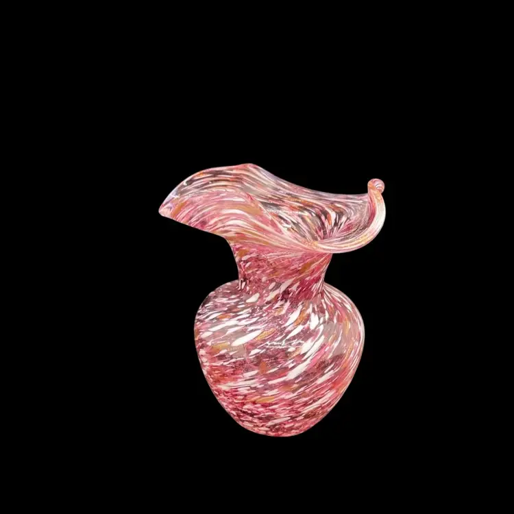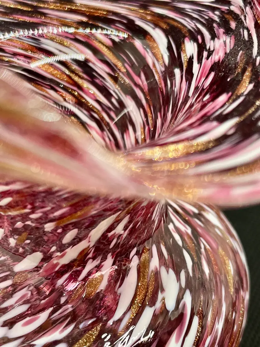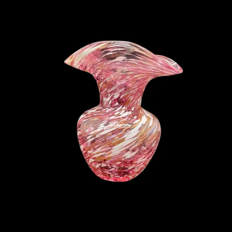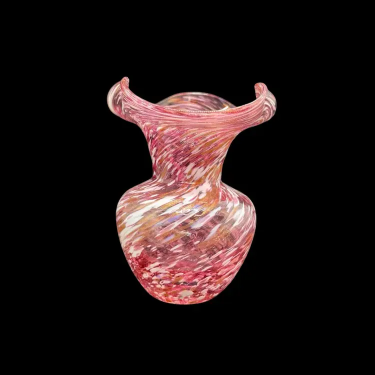 Beautiful vintage cranberry colored hand blown vase with white speckles and metallic copper swirl. Vase is in very good vintage condition with no chips or cracks; the base looks like it has some dark discoloration where it burned during manufacturing.