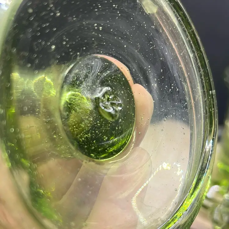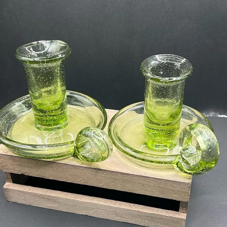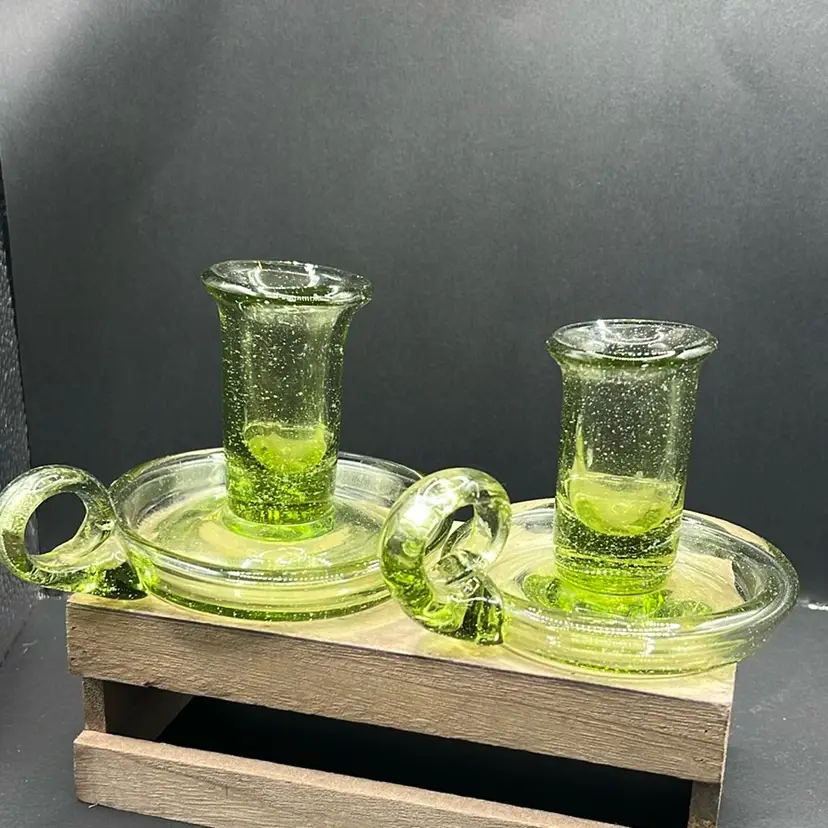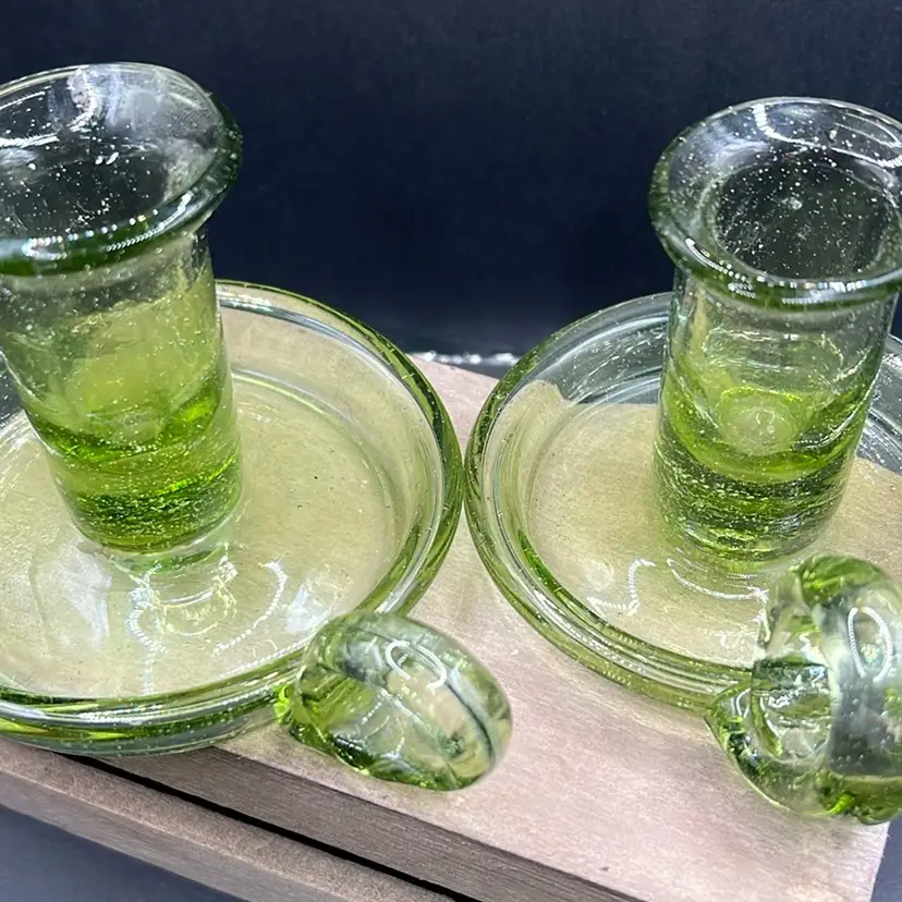 Vintage Hand Blown Green Candlesticks Set Of 2, Holder W/Handle & Air Bubbles. No chips or cracks. Set of two, not exact match but close for hand blown glass. Not uranium glass, yet beautiful! See pictures for details.