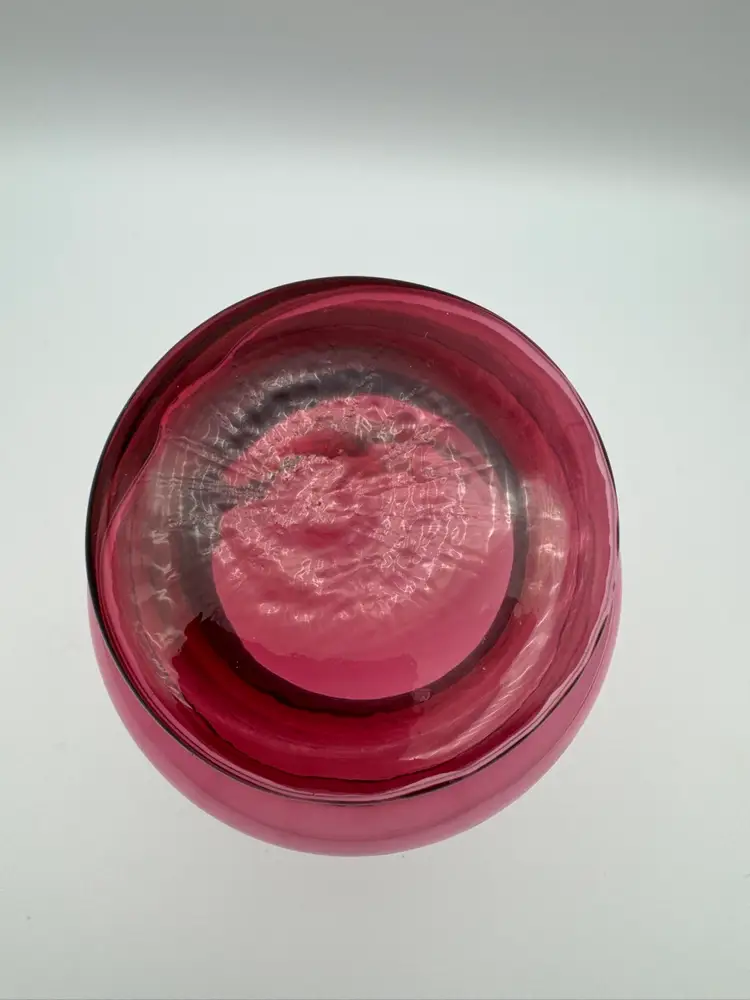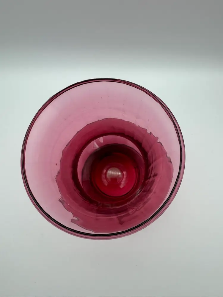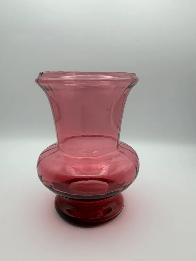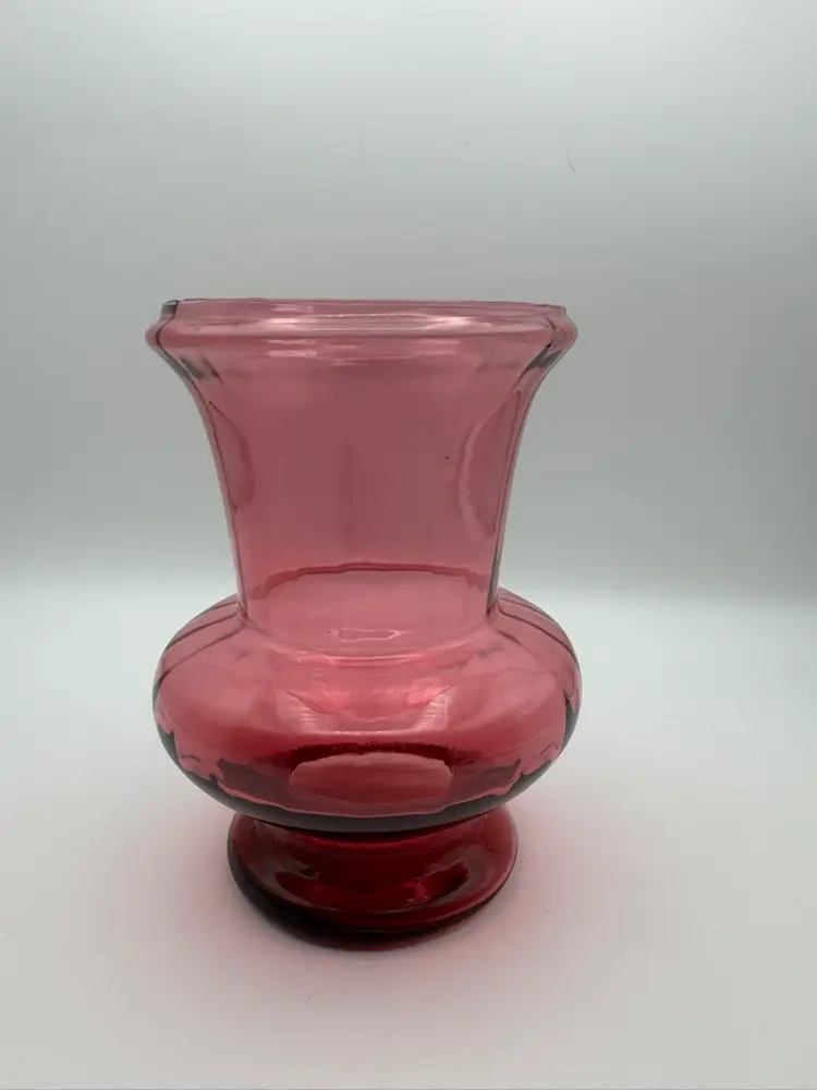 This beautiful vintage Pilgrim glass vase is a stunning piece of art, featuring a cranberry color and an optic ribbed design that adds an ornate touch to any space. Hand blown in the 1970s, this wide mouth vase showcases the craftsmanship and quality of Pilgrim glass. The unique combination of cranberry glass and the intricate ribbed pattern makes it a beautiful and classic addition to any decorative glassware collection. It exudes a sense of elegance and timelessness that is sure to enhance the aesthetic of any room. Excellent condition. No chips or cracks. Measures 6” X 5”