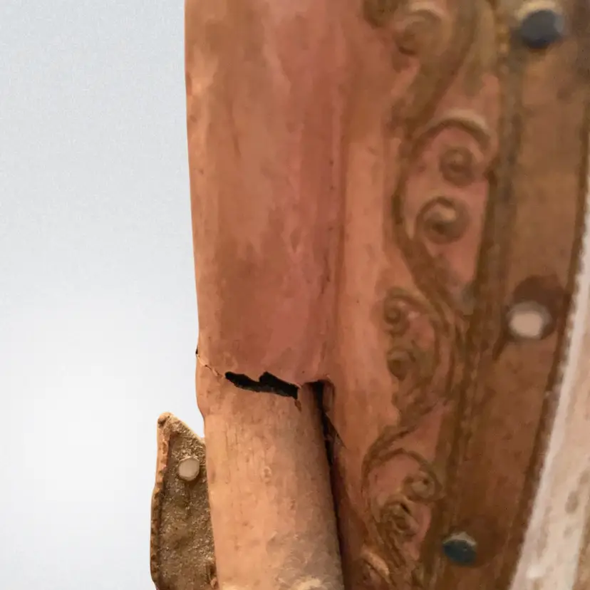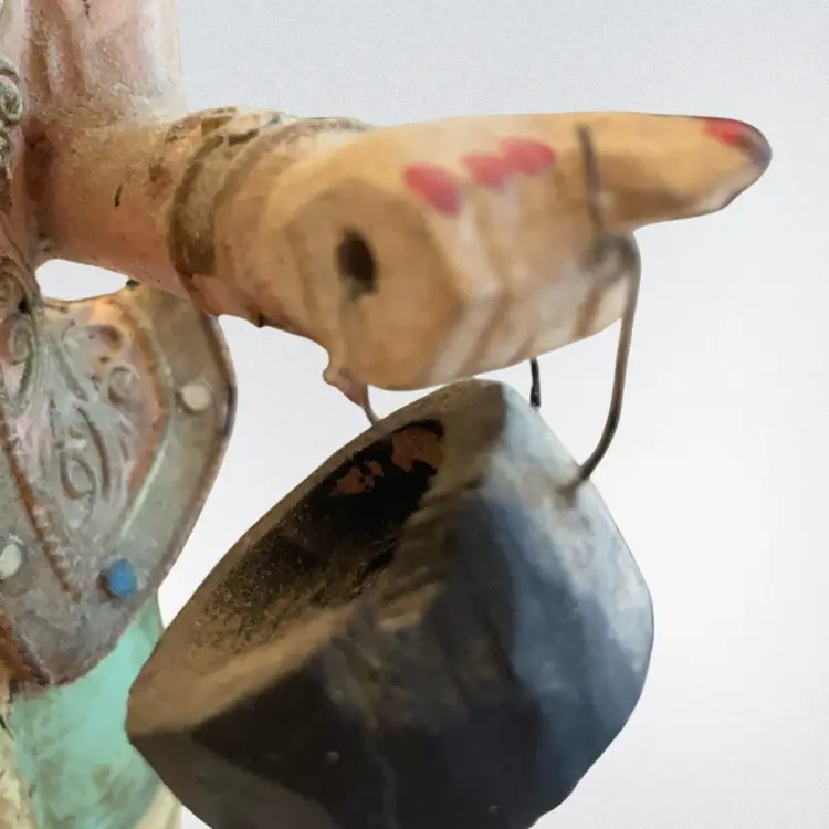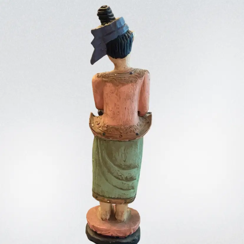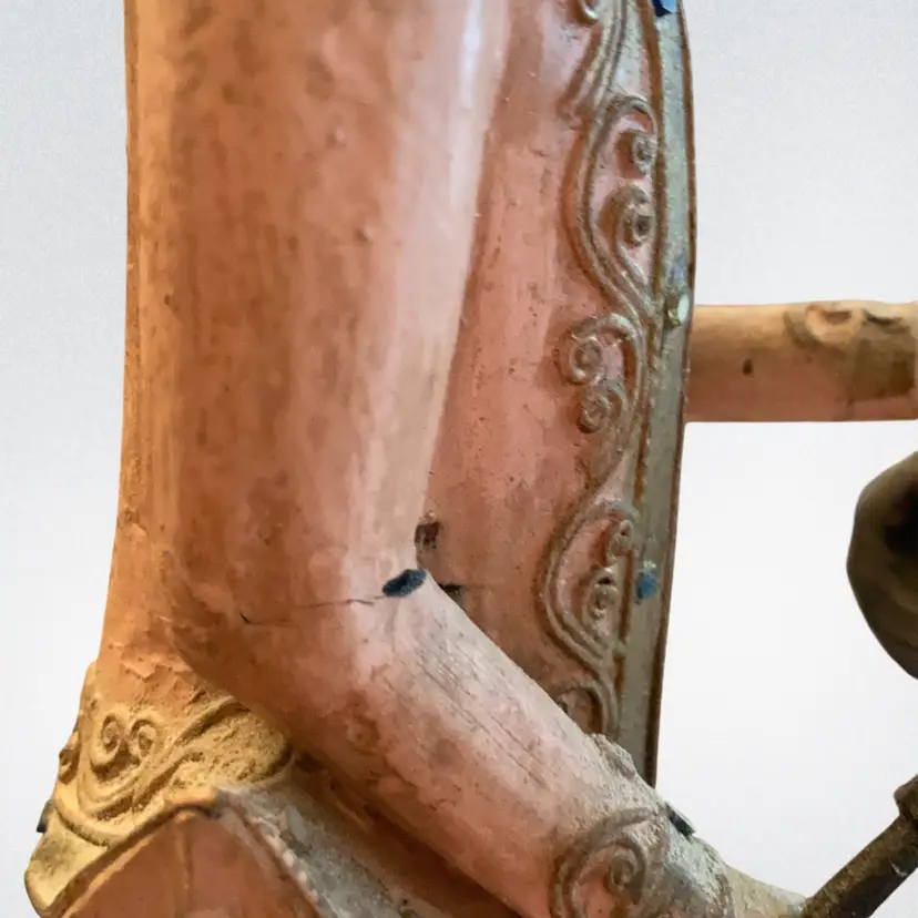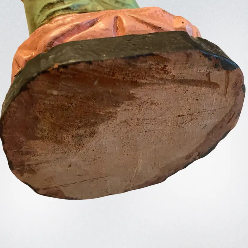 16” tall Figurine is playing an instrument. Two call outs as shown in last three pictures. Crack in elbow but arm in firm. Small chunk out of back of instrument.