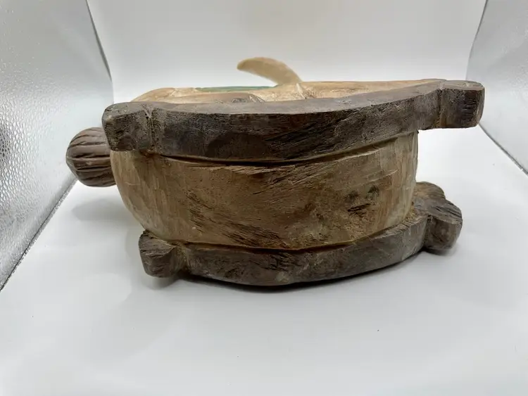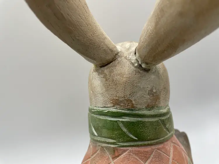 This vintage hand-carved painted wooden rocking bunny rabbit folk art piece is a charming addition to any room in your home. Made from wood with intricate carvings and hand-painted details, this unique sculpture features a rabbit theme that adds a touch of whimsy to any space. Standing at 11 inches tall with a 10-inch length and 4-inch width, this folk art piece is handmade and features a whitewash finish, making it a perfect decorative collectible for all occasions.