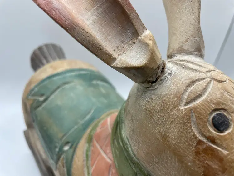 One ear is cracked where it meets the head. It is attached by a wire & could be easily glued. Chip on tail. Please review pictures closely, and msg me with any questions. Check out my other listings for more unique vintage items. Thanks for looking!