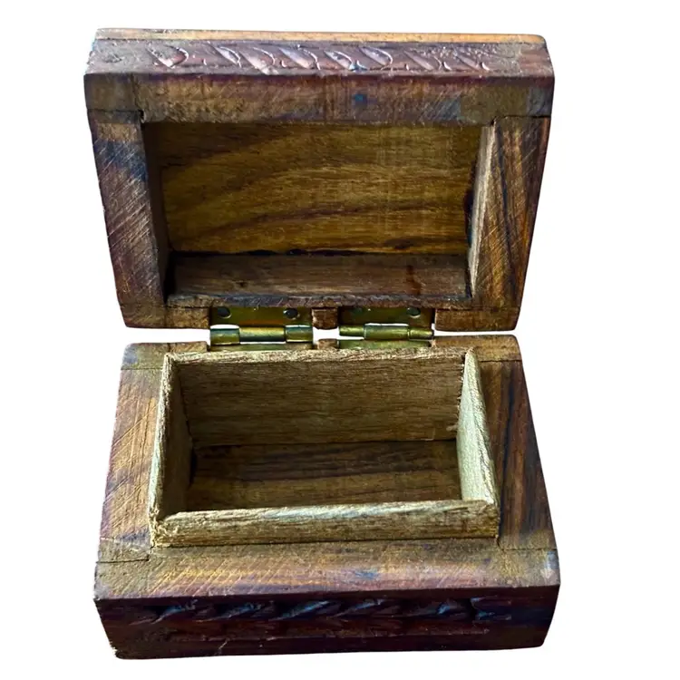Vintage sheesham wood box is a beautiful addition to any home decor Hand carved with intricate details, this box is perfect for storing small items such as jewelry or keepsakes Measuring 2.75”x 2” x 1.5 inches, it is the perfect size for display on a shelf or dresser Crafted by skilled artisans, this box is a unique piece The hinged lid allows for easy access to the contents inside Perfect for those who appreciate the beauty of handmade items I could not find one made identical to this one!