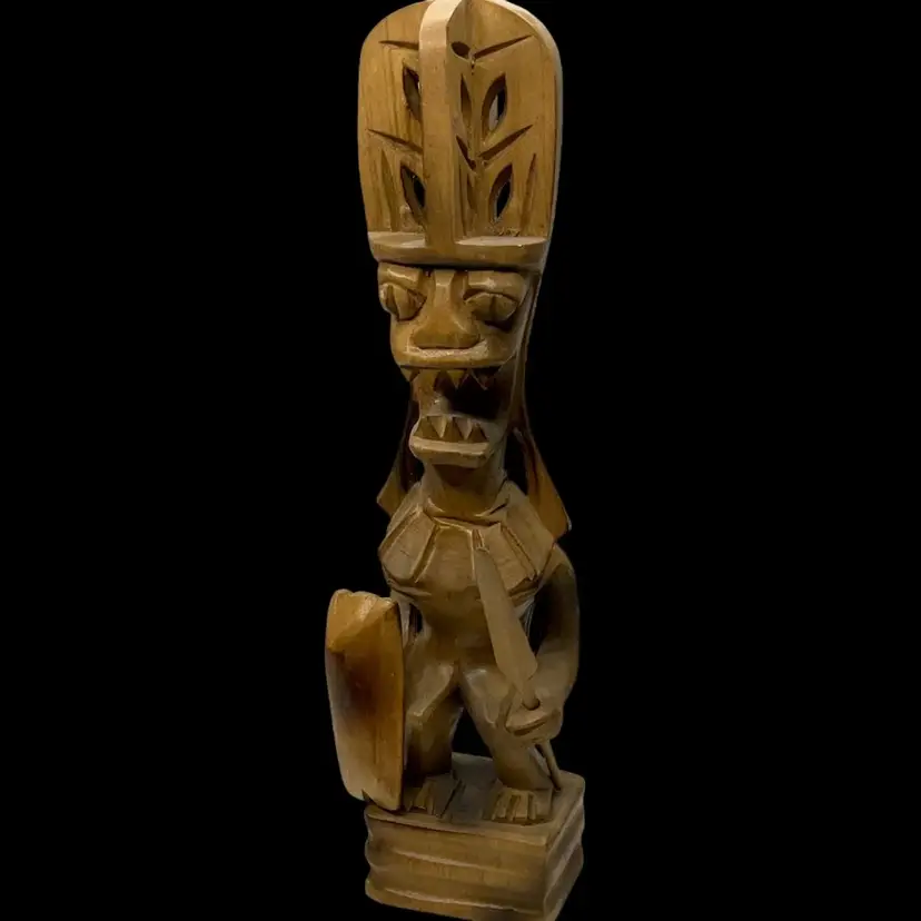 Intricately carved wooden Tiki warrior statue, perfect for adding a touch of island flair to your decor.