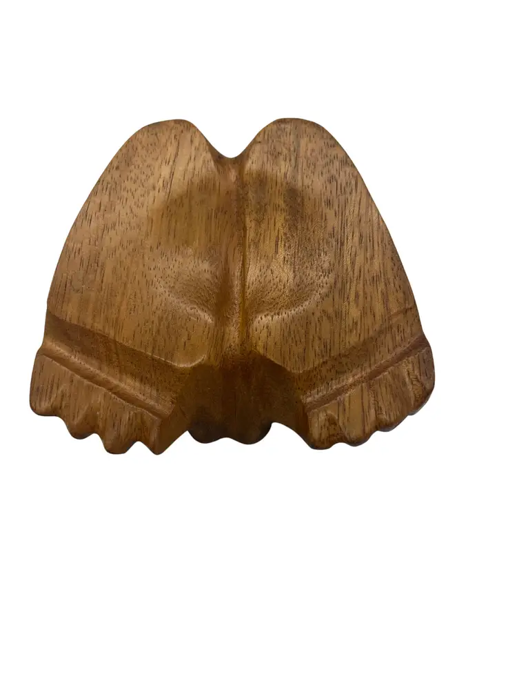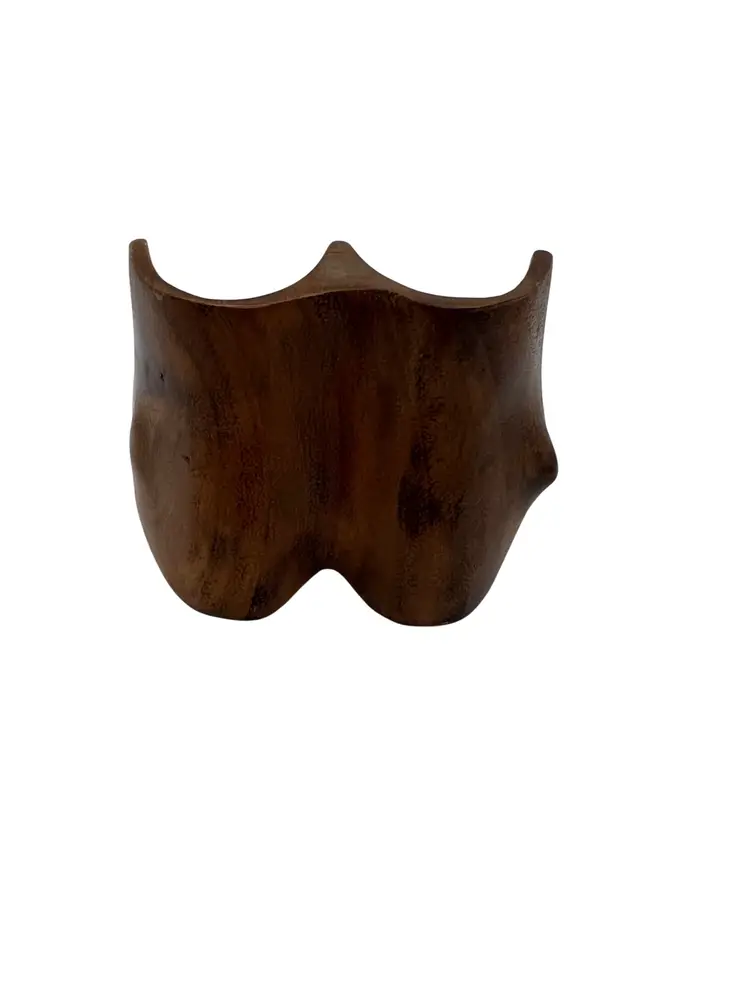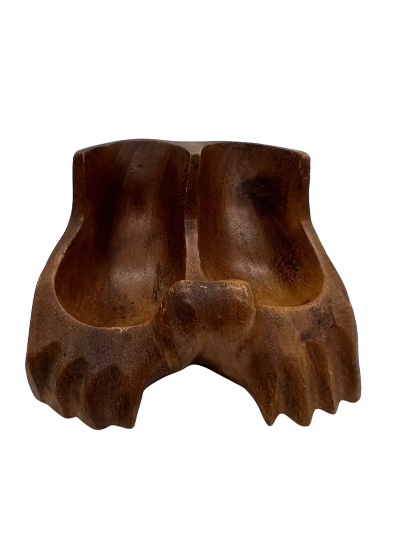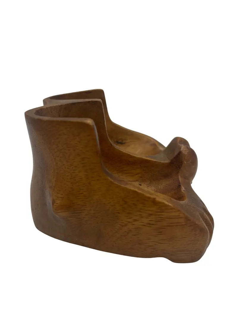 Whimsical double-foot ashtray/catchall, hand-carved hardwood in the monkey-pod/teak style, c. mid-century. Two deep wells with scalloped “toes” that act as rests. Looks like it could also be used as a pipe holder. Great as a tobacciana display, tiki bar accent, or a desk catchall. Approx. 5" x 4.5" x 3" H.