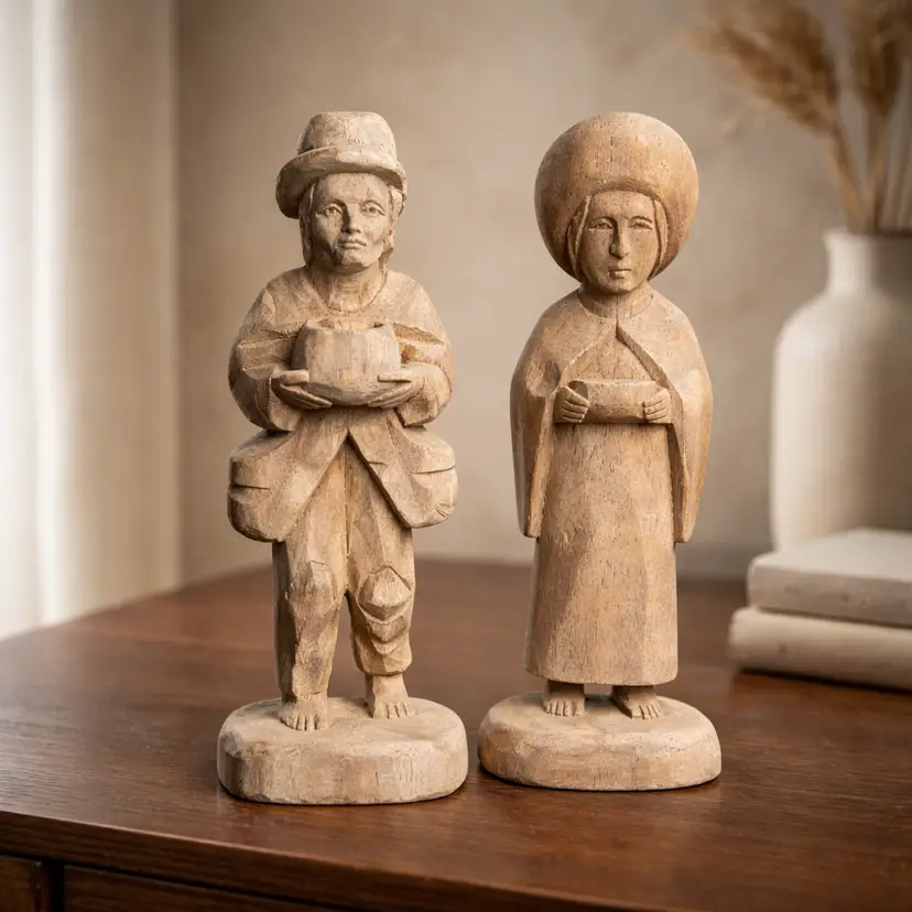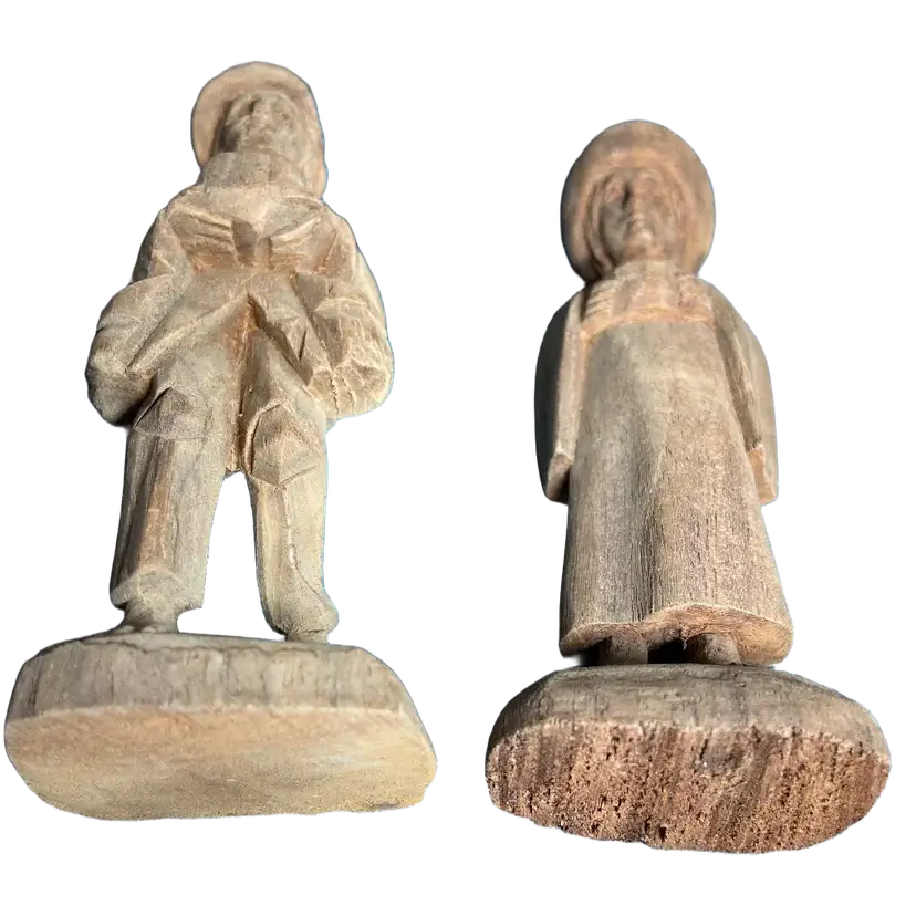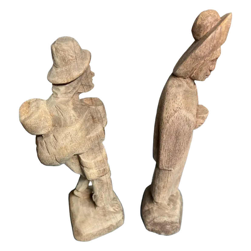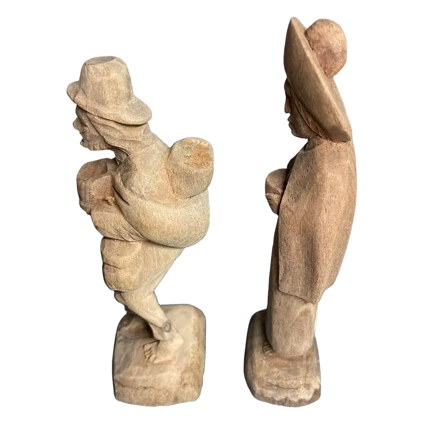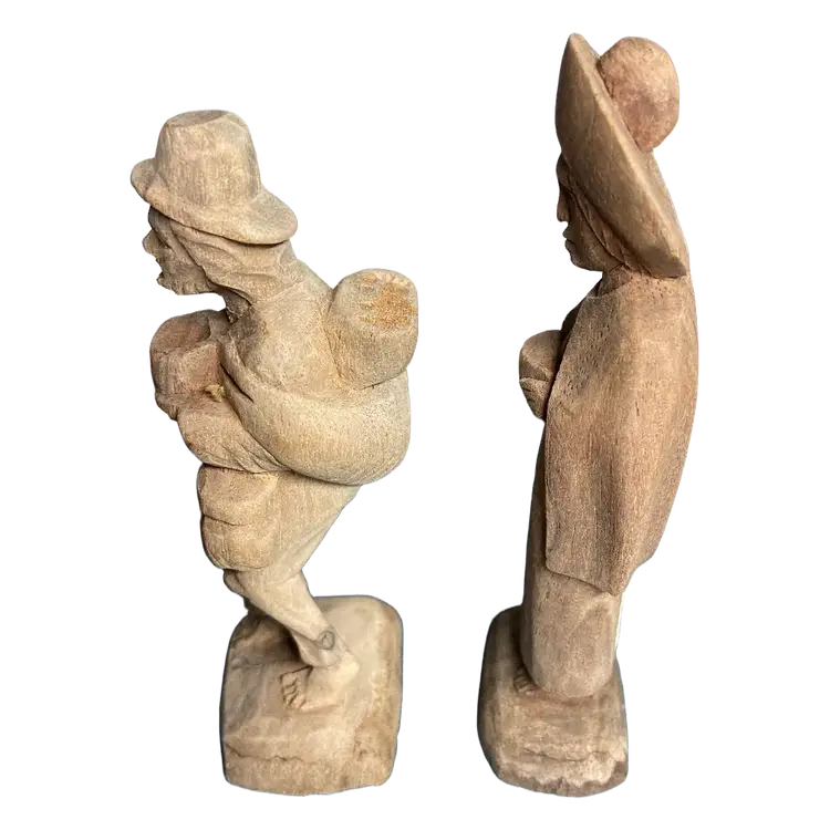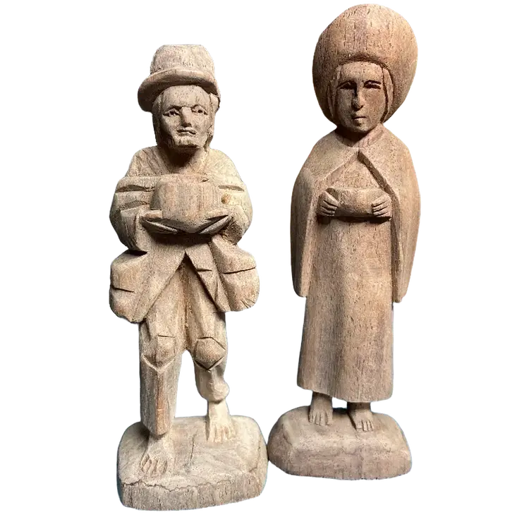 Vintage Hand Carved Wood Figurine of a Barefoot Traveler Man & Woman w/ Bowl, 4.5" Tall