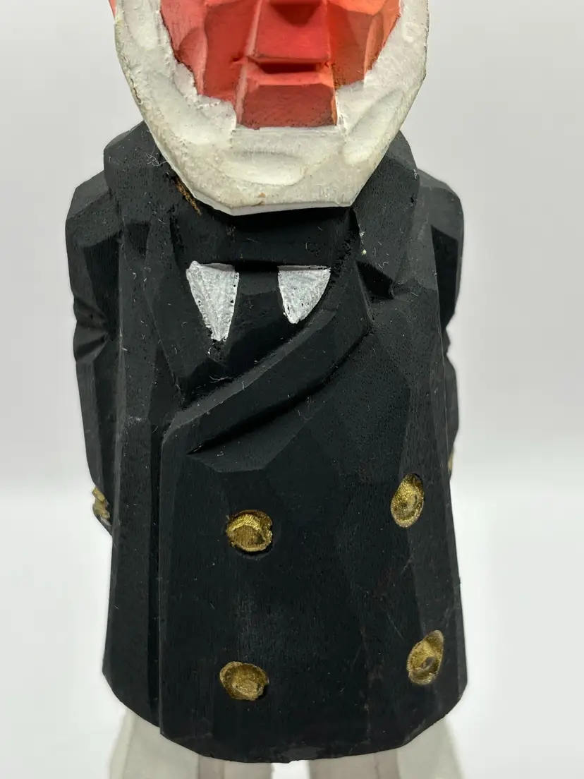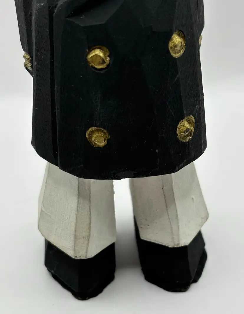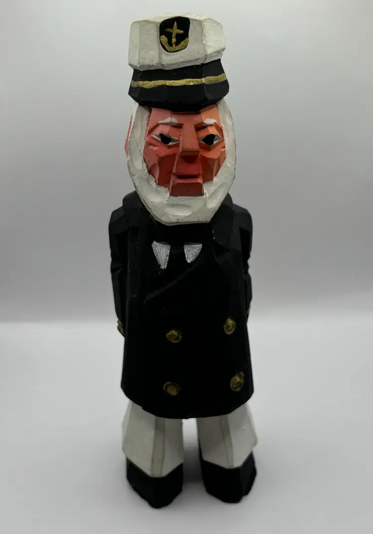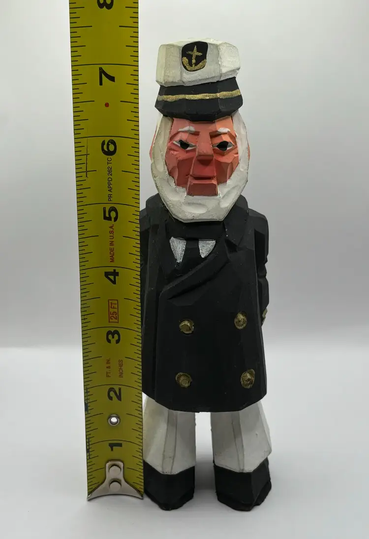 Vintage hand carved wood sea captain figurine. He is wearing a black jacket and a black and white hat with gold accents. Maker's label on bottom and Made in Taiwan. The figurine is a little under 7.5 inches tall. It is in good vintage condition with some light paint wear due to age.