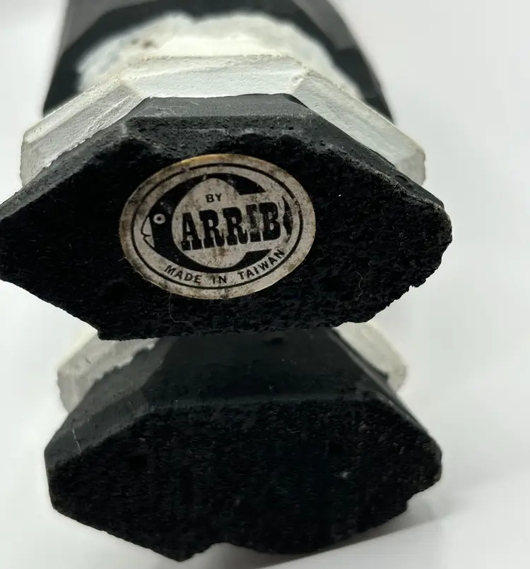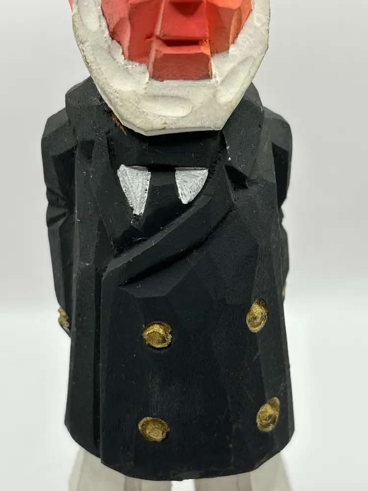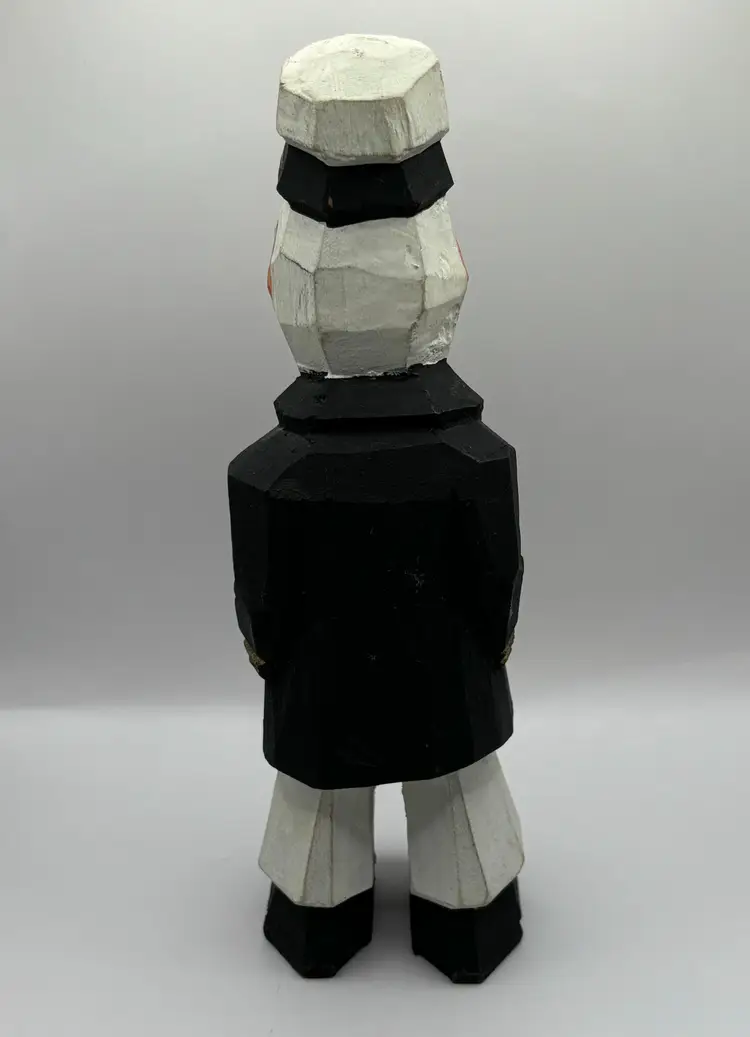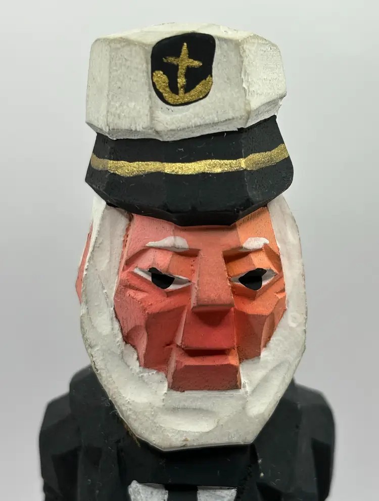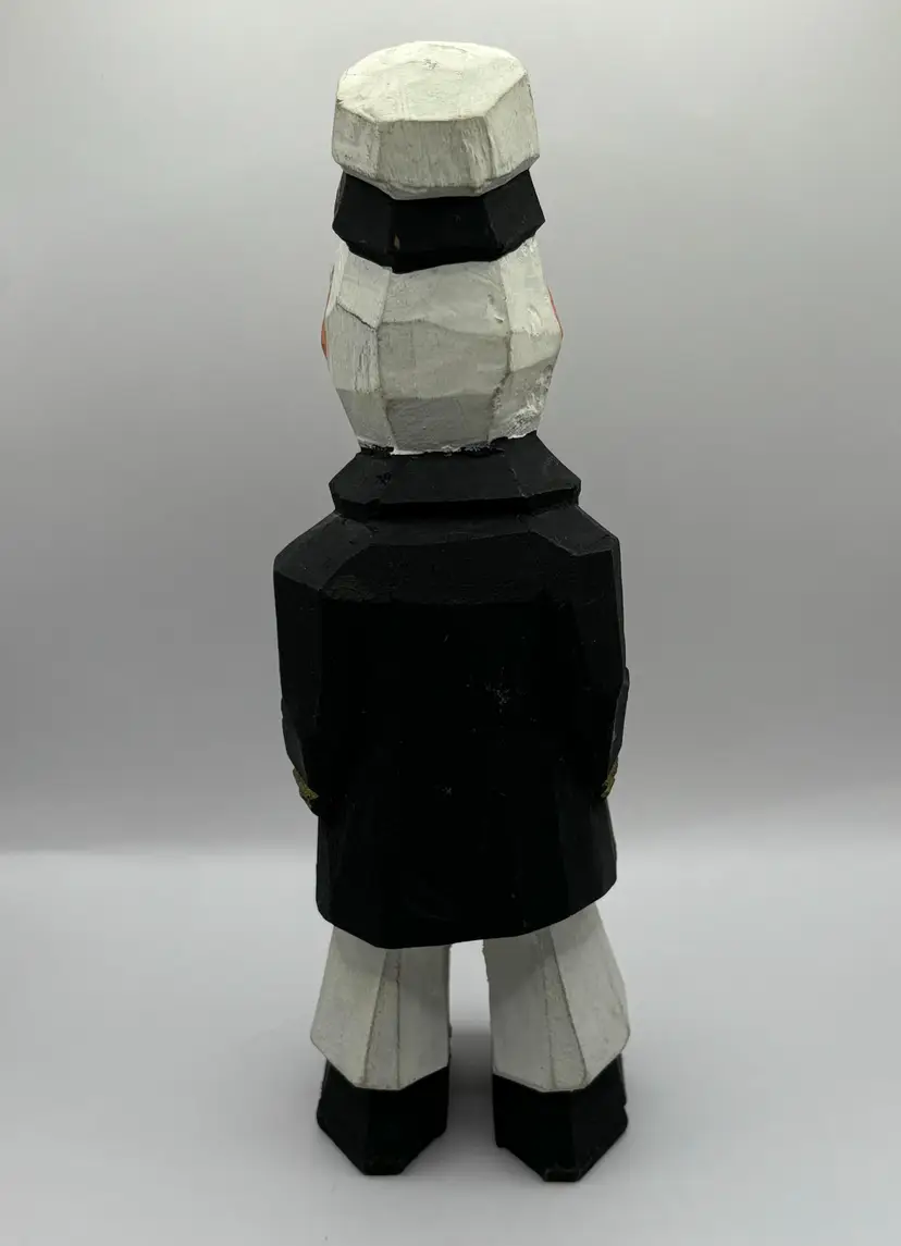 Vintage hand carved wood sea captain figurine. He is wearing a black jacket and a black and white hat with gold accents. Maker's label on bottom and Made in Taiwan. The figurine is a little under 7.5 inches tall. It is in good vintage condition with some light paint wear due to age.