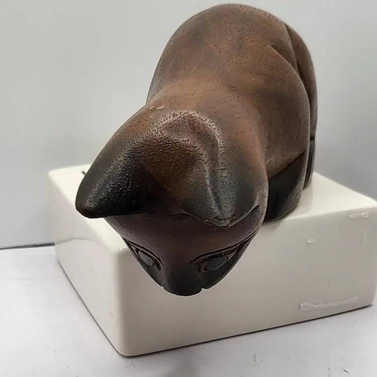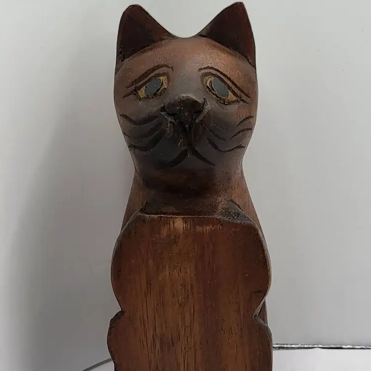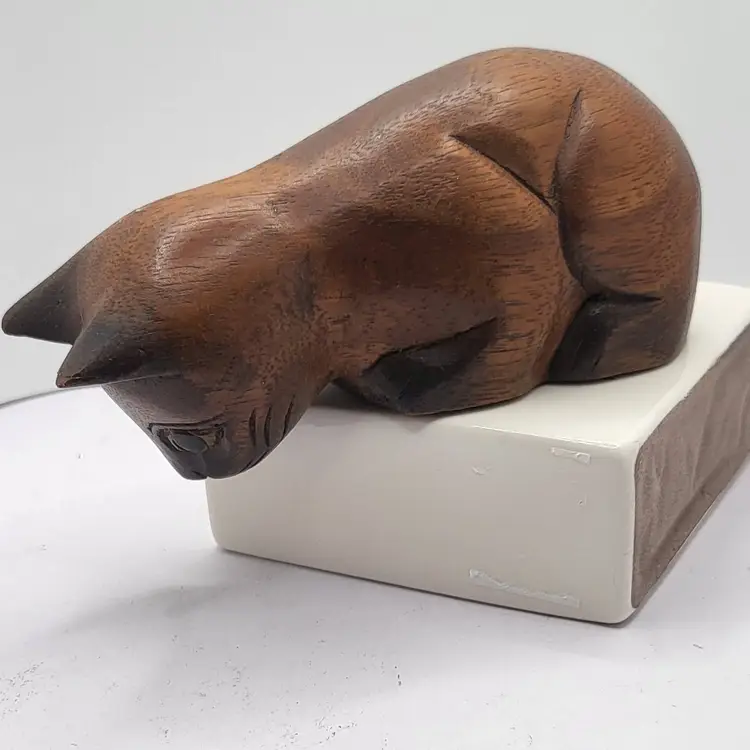 Charming hand-carved wooden cat figurine with a rustic finish. Perfect for adding a touch of whimsy to your shelf or desk! (B7)