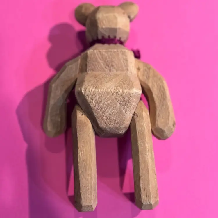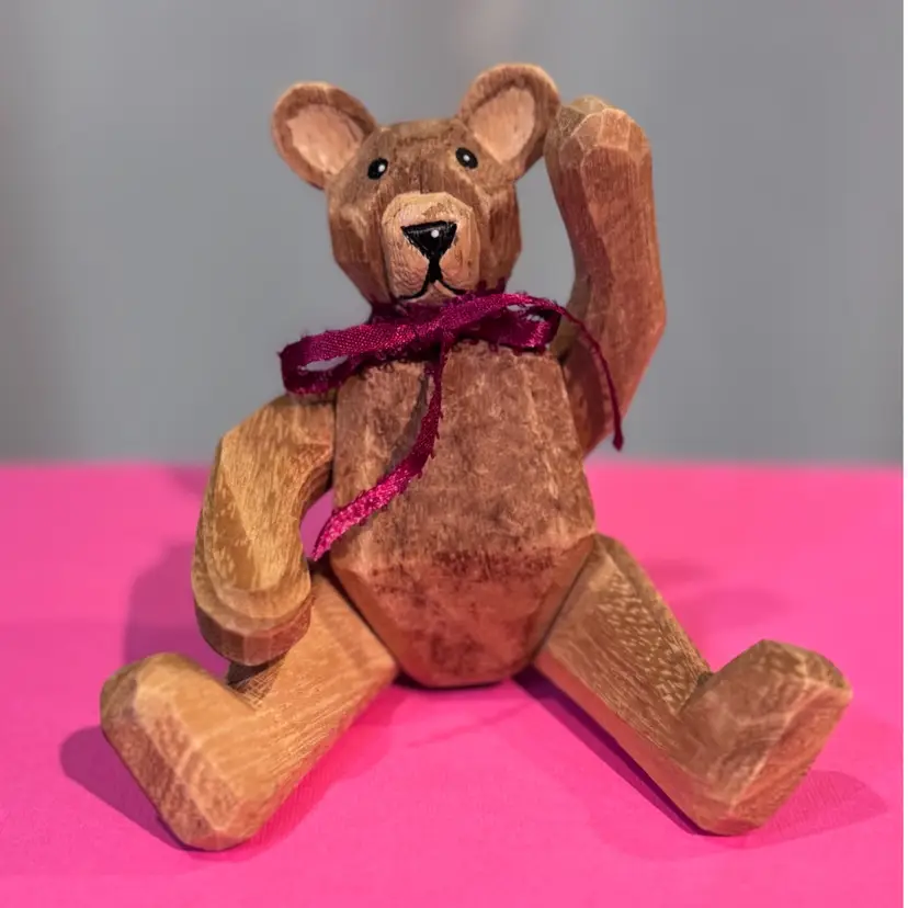Wooden articulated hand carved teddy bear. Great for Valentine’s Day or folk art decor. Measures 4 inches tall.