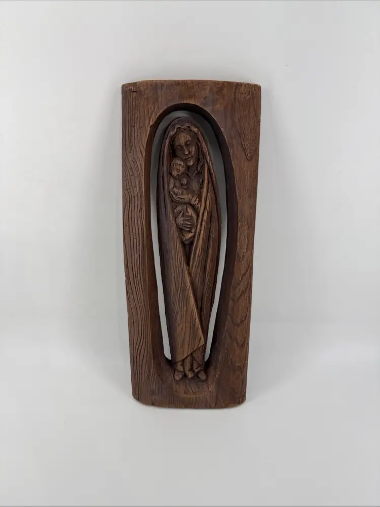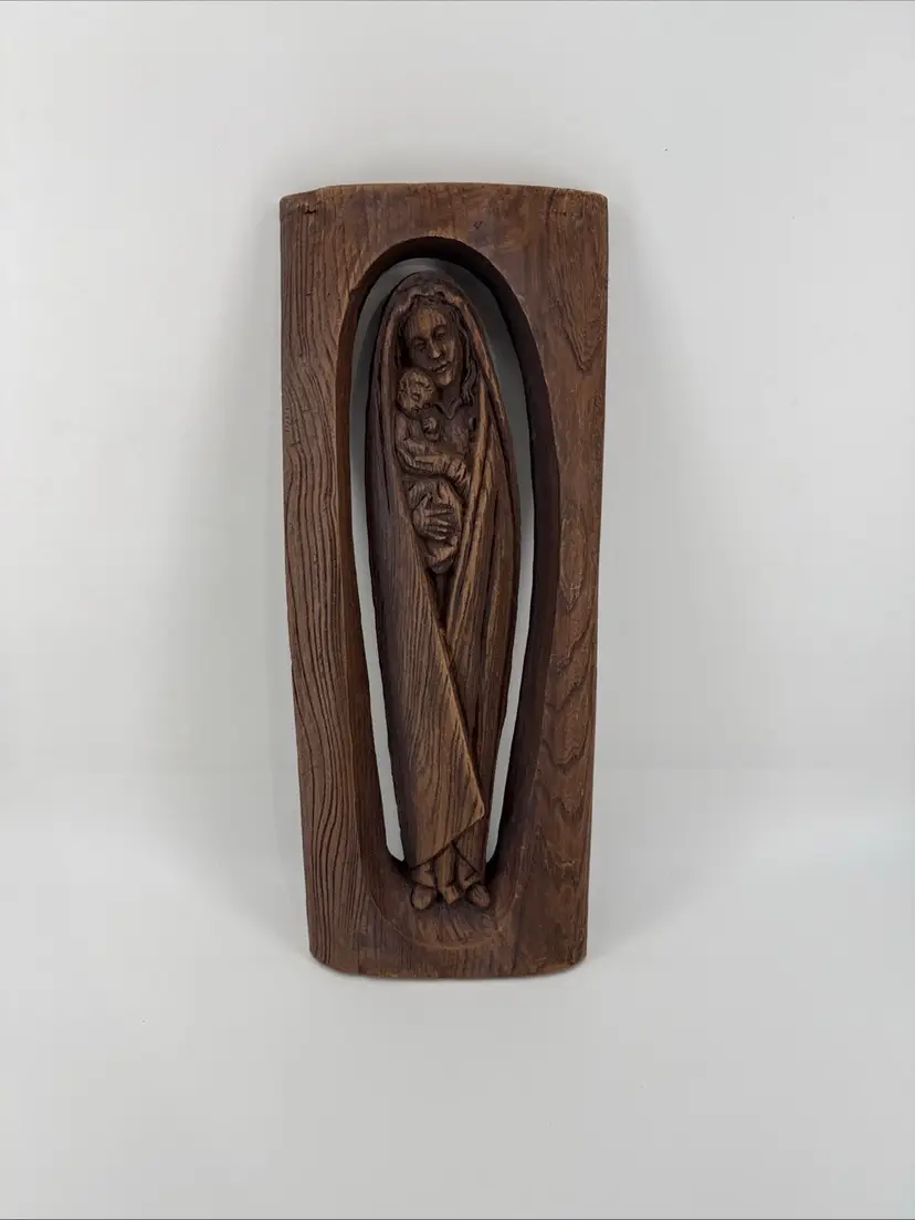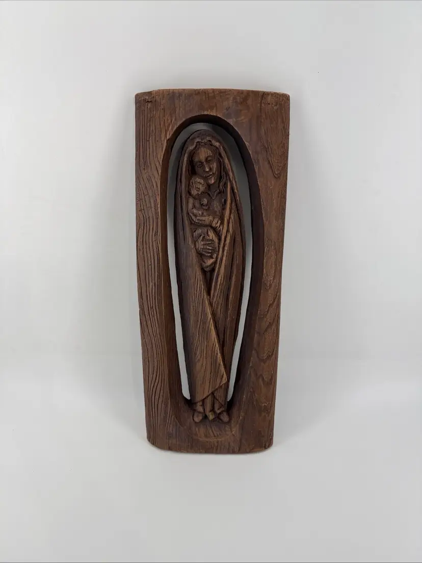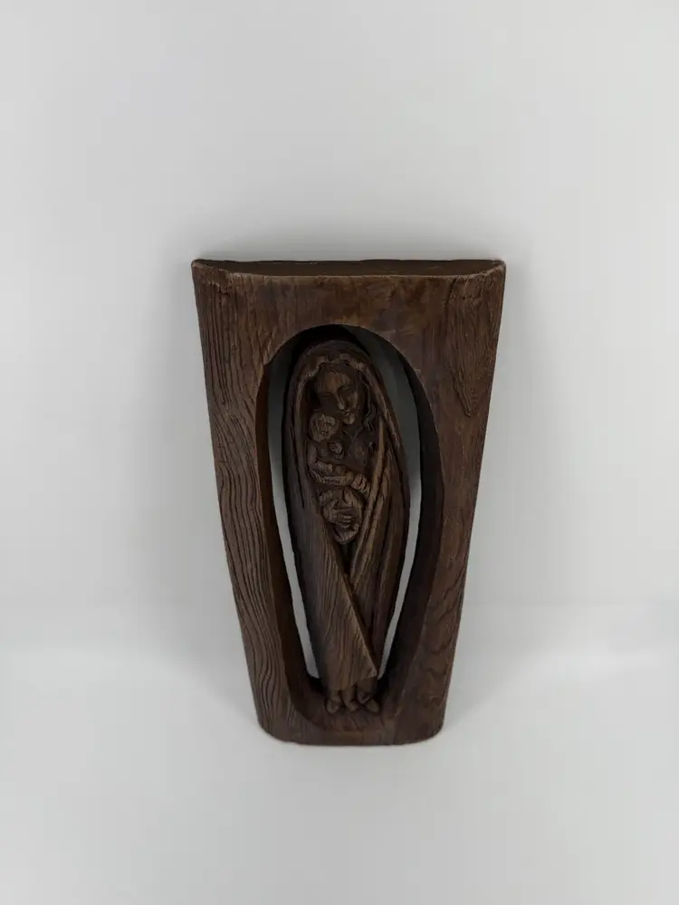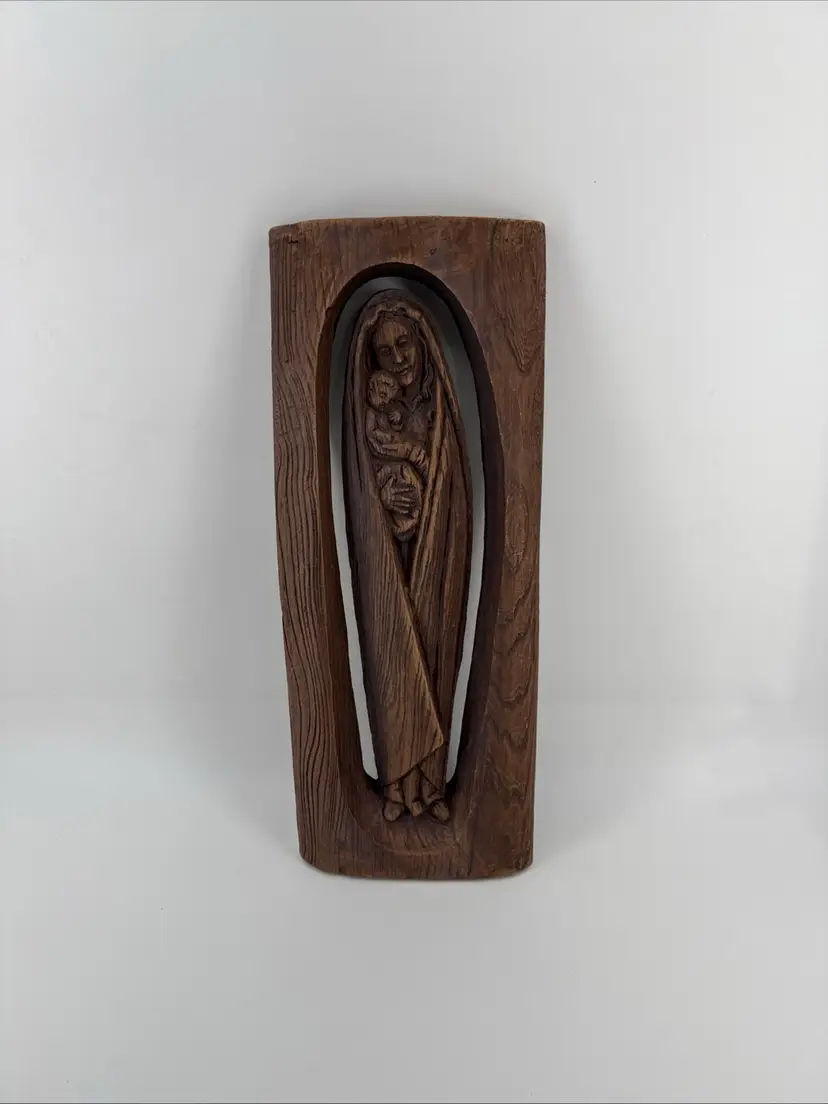 This vintage hand-carved wooden sculpture of the Virgin Mary (Madonna) with Baby Jesus is a traditional and religious piece showcasing intricate 3D carvings with a natural wood grain finish. Measuring 23 inches in height, 9.5” long, 3” wide and weighs 2 lbs & 4 oz. This large sculpture is perfect for any room in the house, including the bedroom, living room, study, or dining room. Hand-painted and textured, this original piece is a unique addition to any art collection, especially for those interested in religious figures and Nativity scenes. Made with quality craftsmanship, this sculpture is a beautiful representation of faith and tradition.