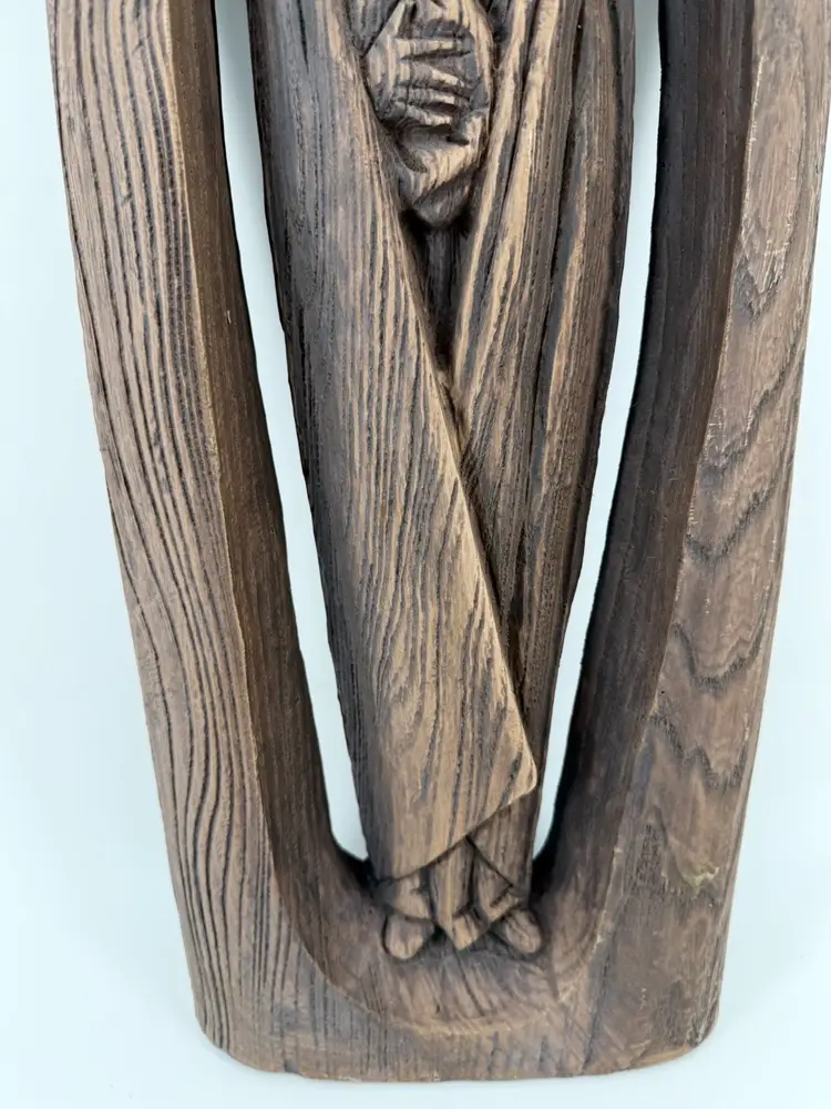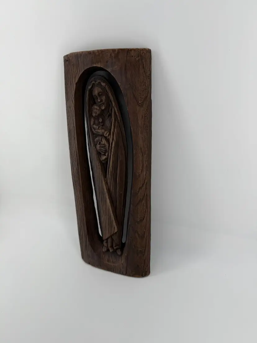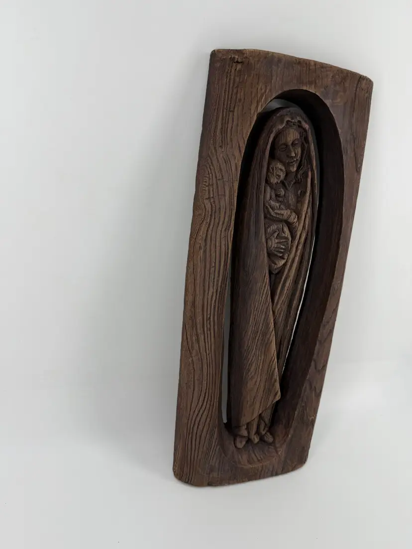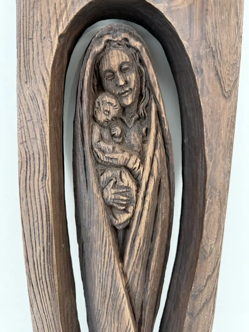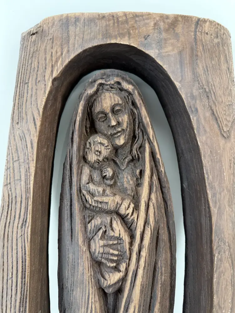 This vintage hand-carved wooden sculpture of the Virgin Mary (Madonna) with Baby Jesus is a traditional and religious piece showcasing intricate 3D carvings with a natural wood grain finish. Measuring 23 inches in height, 9.5” long, 3” wide and weighs 2 lbs & 4 oz. This large sculpture is perfect for any room in the house, including the bedroom, living room, study, or dining room. Hand-painted and textured, this original piece is a unique addition to any art collection, especially for those interested in religious figures and Nativity scenes. Made with quality craftsmanship, this sculpture is a beautiful representation of faith and tradition.