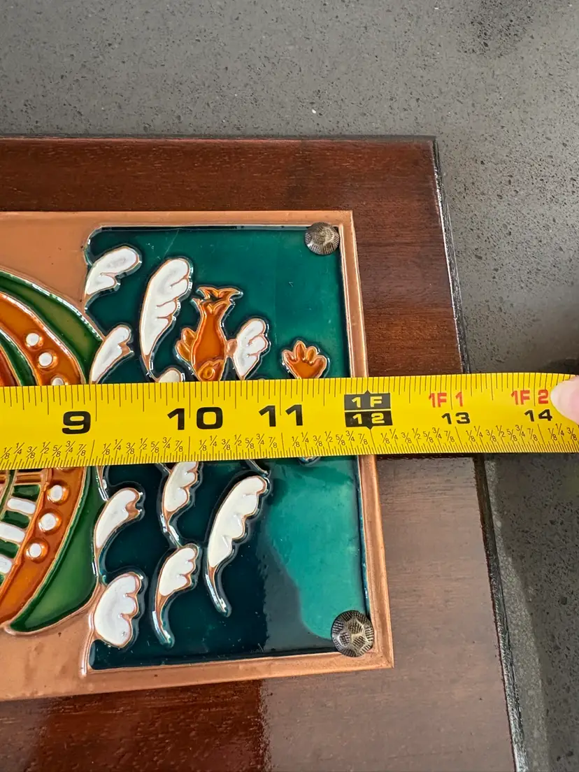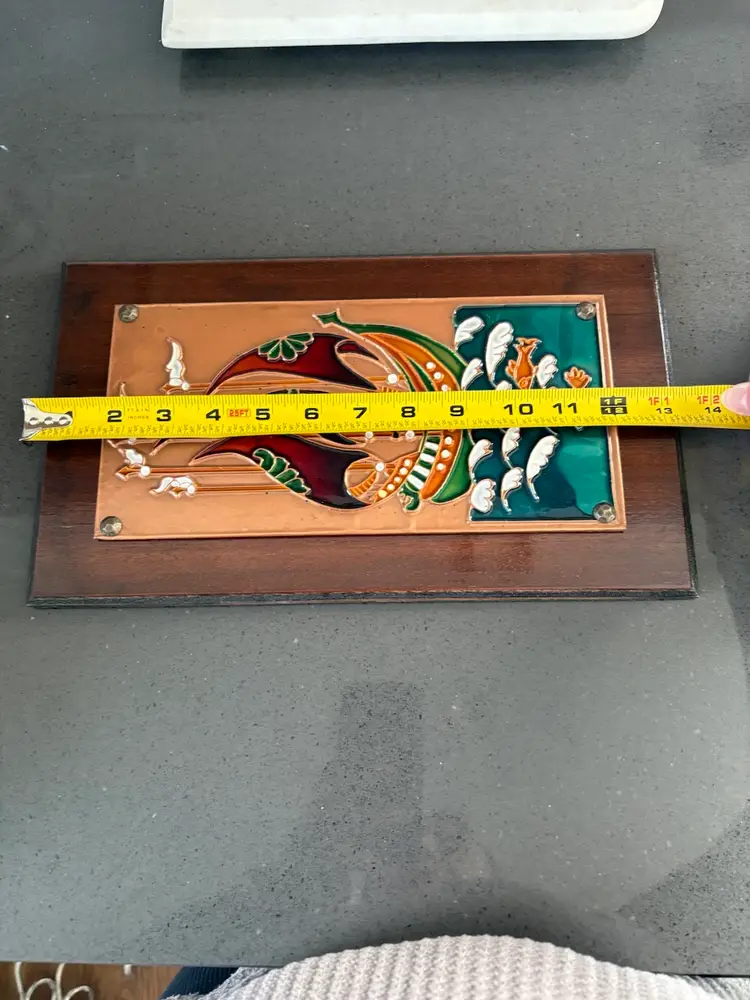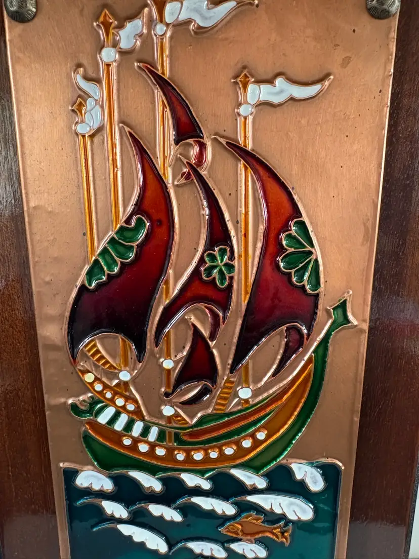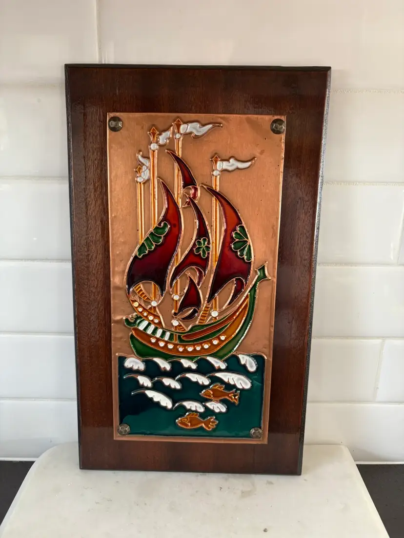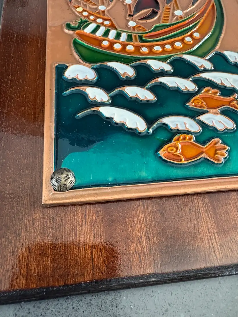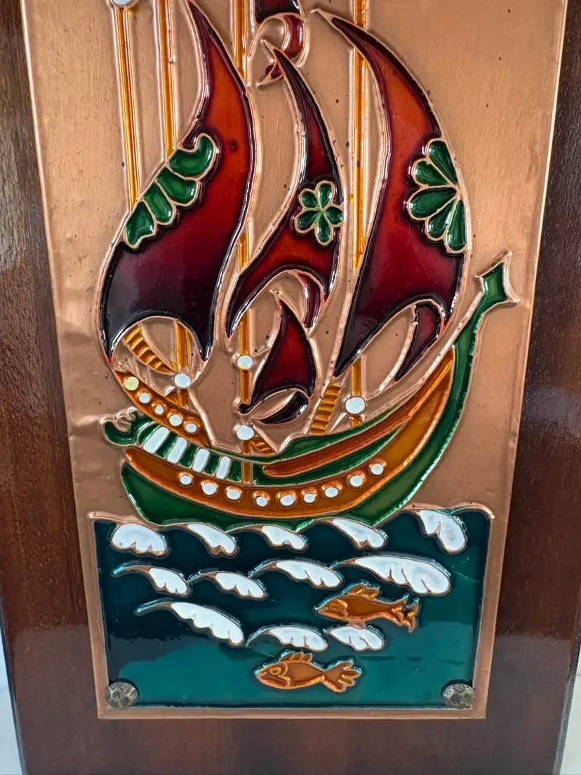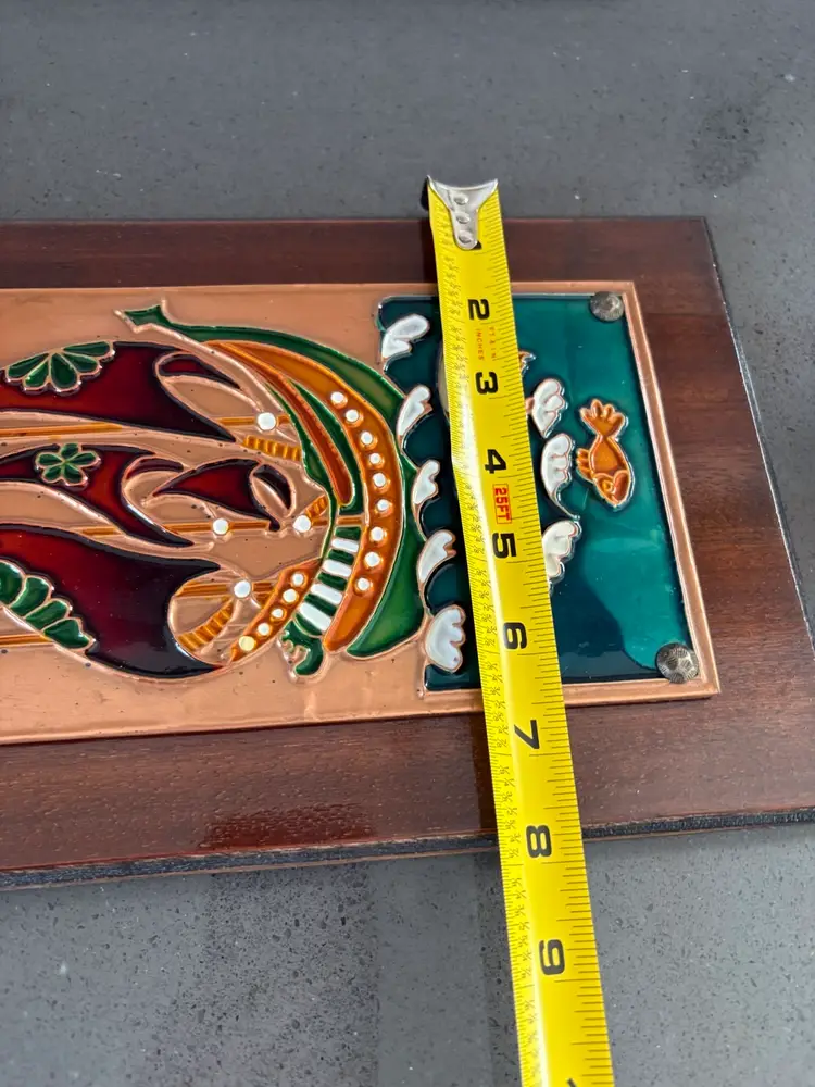 Vintage Hand Crafted Enamel On Copper On Wood Art Plaque