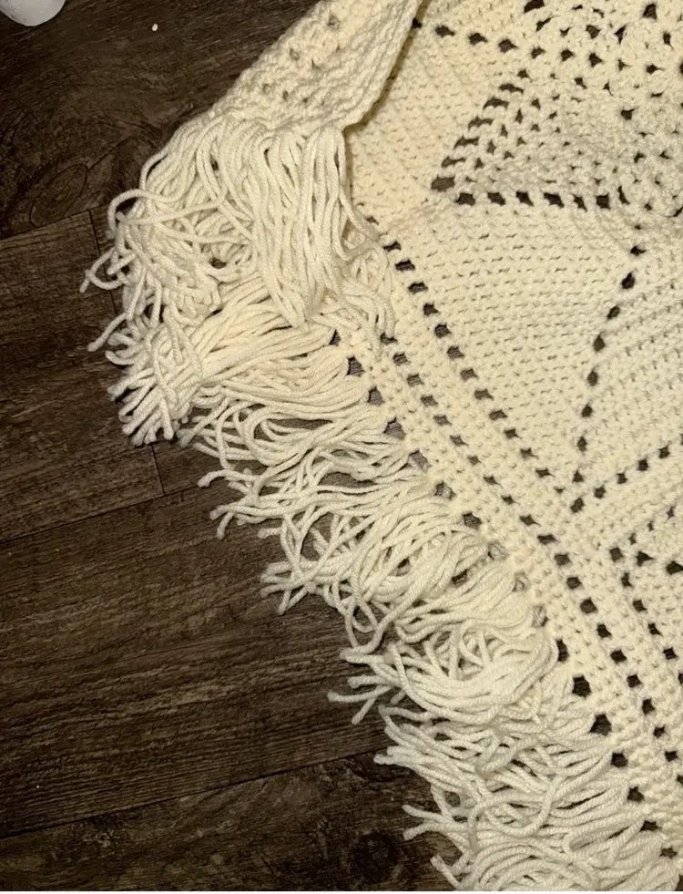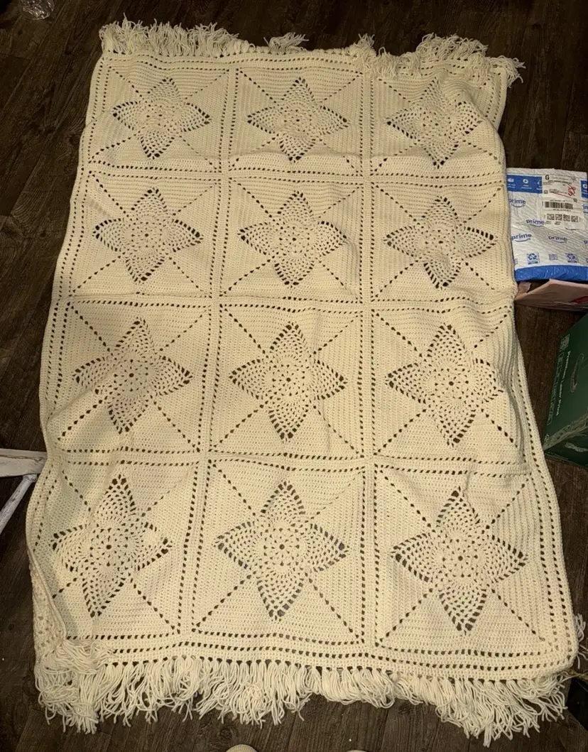 This Vintage Hand Crocheted cream star patterned afghan is a handmade blanket featuring a charming star pattern in a pretty cream . The granny star pattern make it a cozy and versatile piece for any country/cottagecore-themed room. Measuring 70 inches in length and 48 inches in width, this lightweight 3 pound afghan is the perfect addition to any home looking to add a touch of vintage charm and warmth.