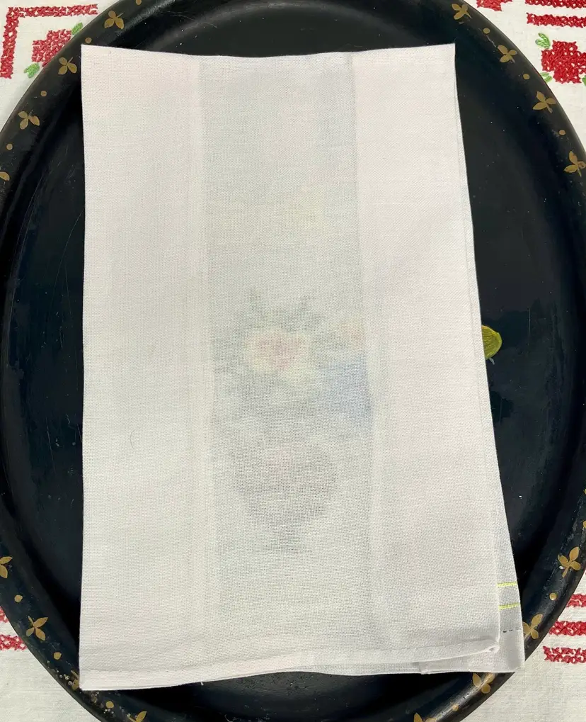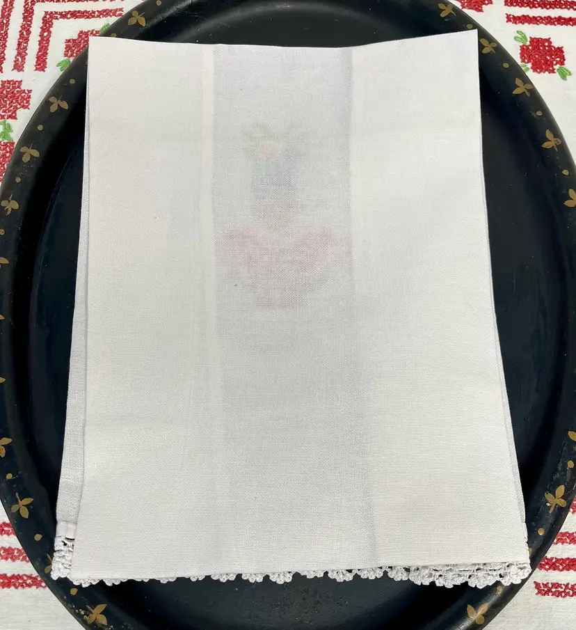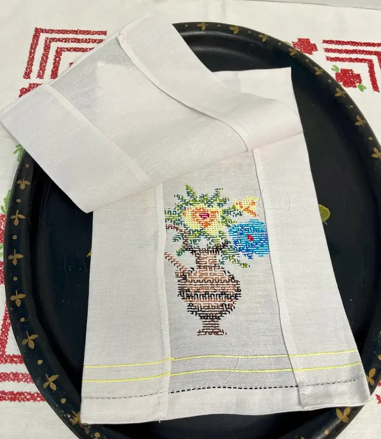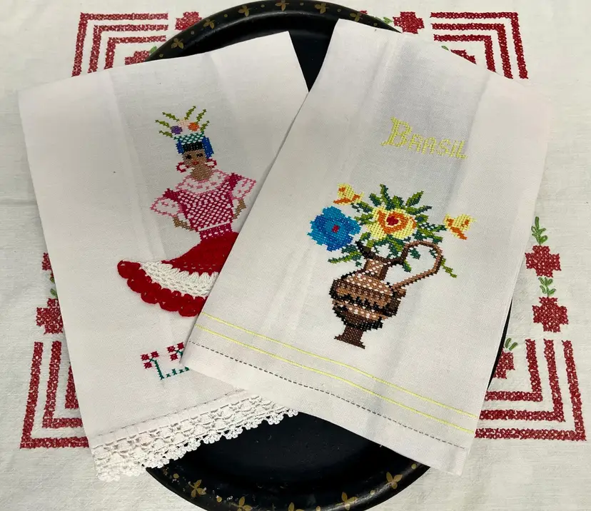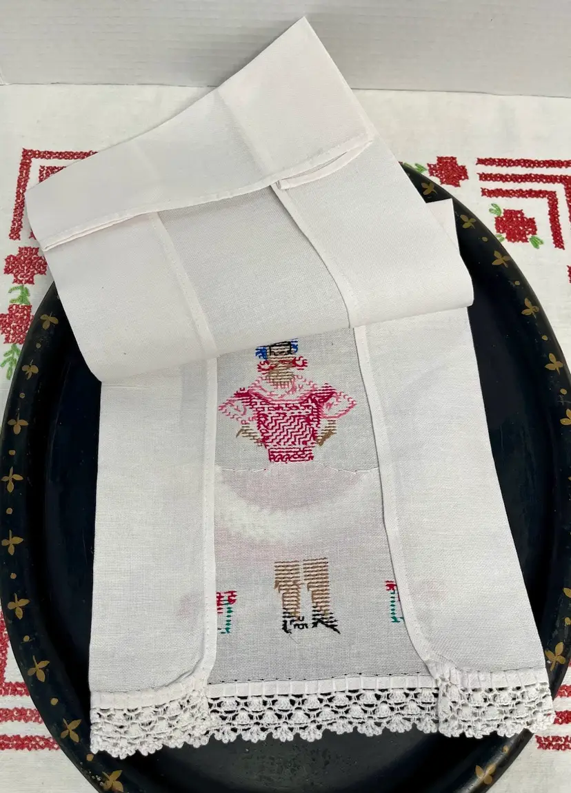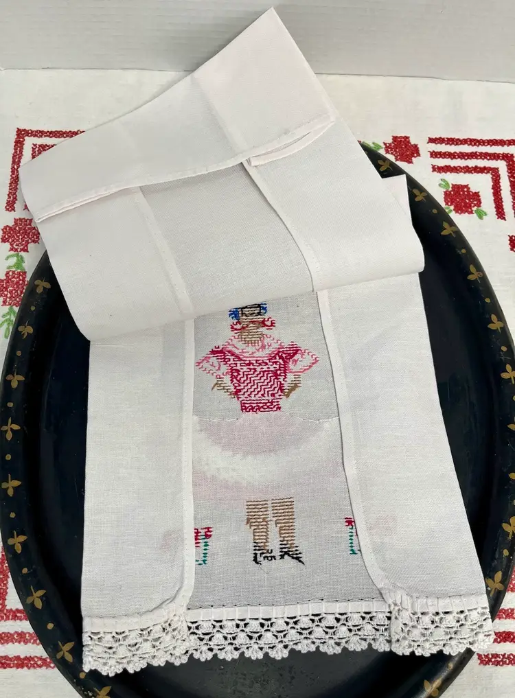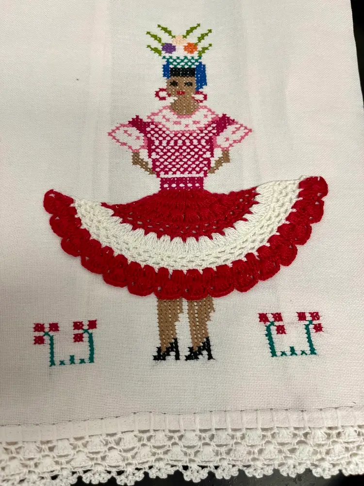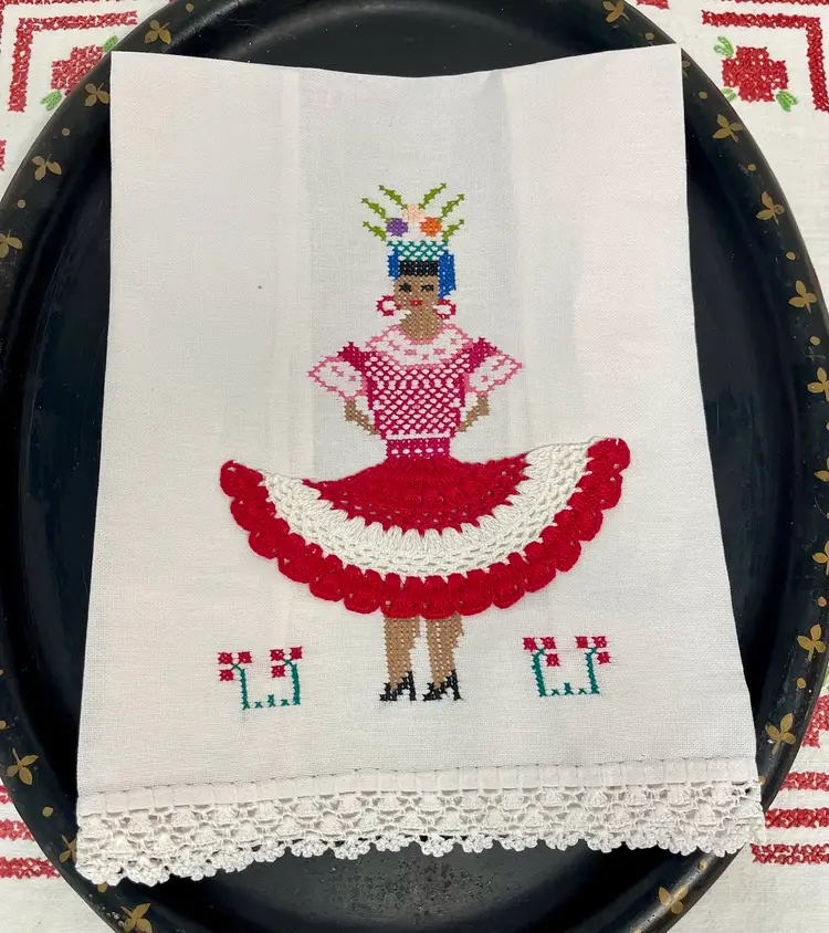 Hand - embroidered tea towel or decorative cloth featuring a woman in traditional attire, likely a folkloric dancer.
