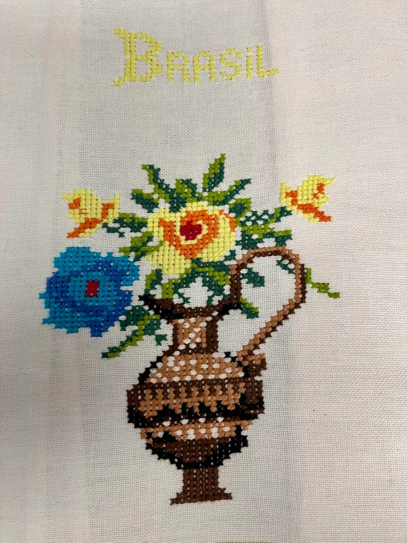 Vintage hand-stitched linen tea towel featuring a cross-stitched design of a basket of flowers and the word "BRASIL" embroidered in yellow thread.