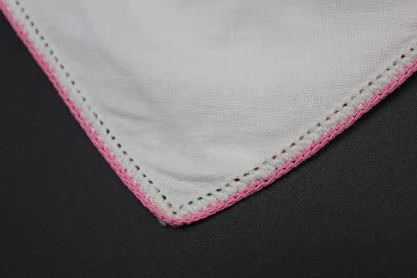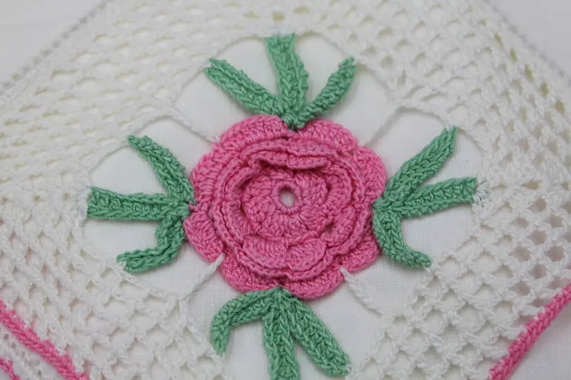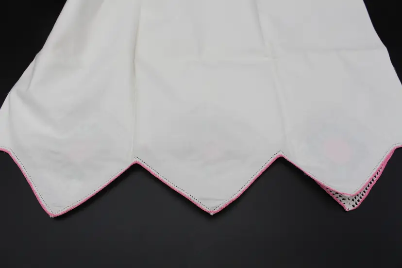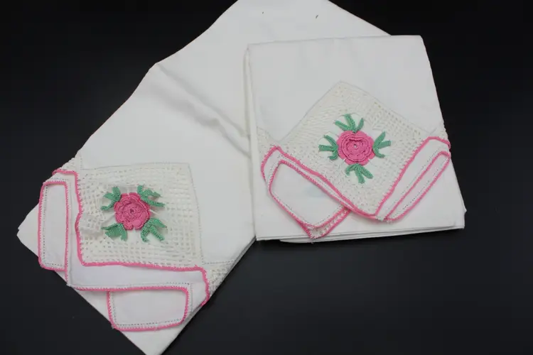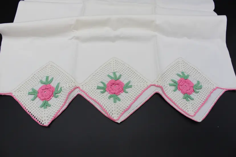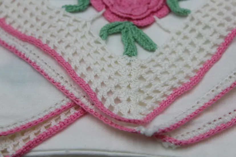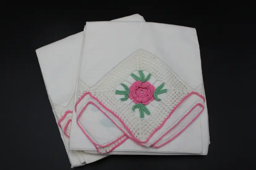 Vintage Hand Embroidered Crocheted Pillowcases - pair. They have a lovely pink flower/rose with green stems. Pillowcases are in excellent used condition (EUC). Size is 30x22, at the tip of the zig zag. Check out that pink detail on the zig zag edges. Just lovely.