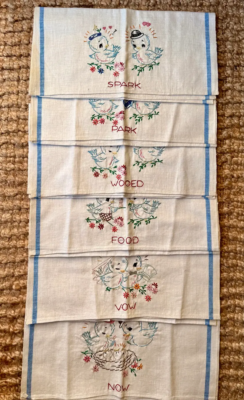 Charming set of six vintage hand-embroidered tea towels featuring sweet lovebird scenes that tell a story: Spark, Park, Wooed, Food, Vow, Now. Beautiful mid-century style embroidery on soft linen/cotton fabric with classic blue woven stripes at the edges.