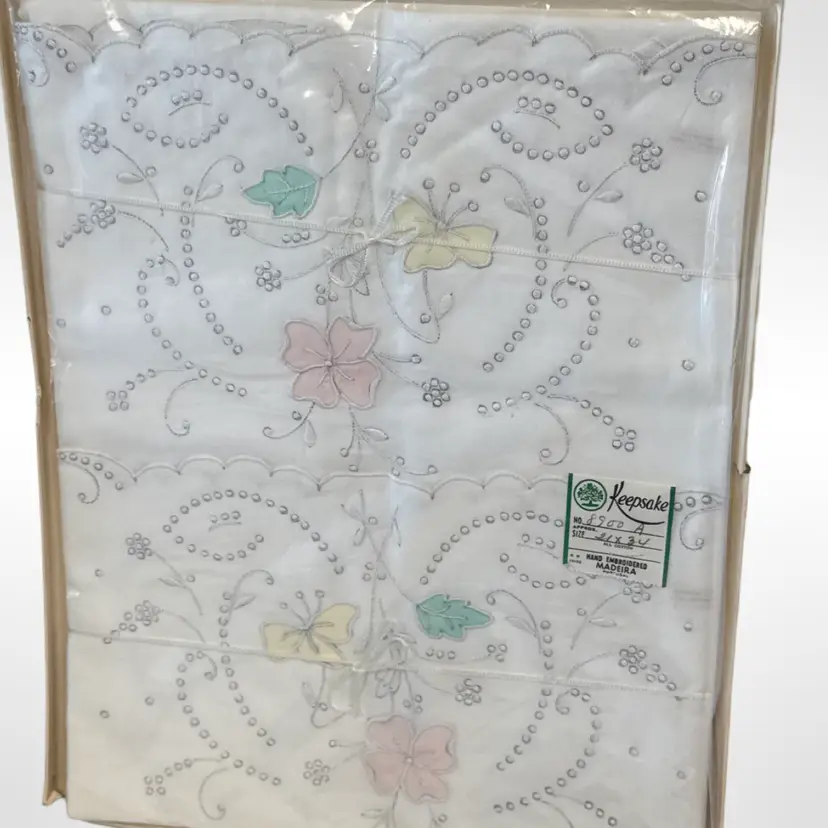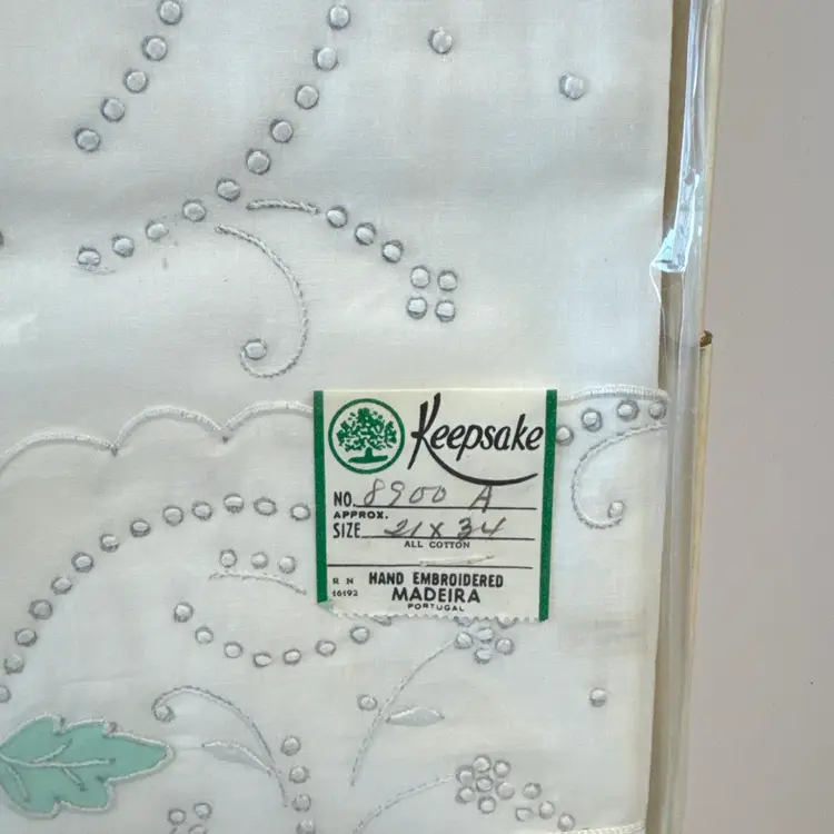 Beautiful vintage pair of hand embroidered all cotton pillowcases made in Madeira Portugal. Still sealed with bottom half of original box. Pillowcases measure 21x34