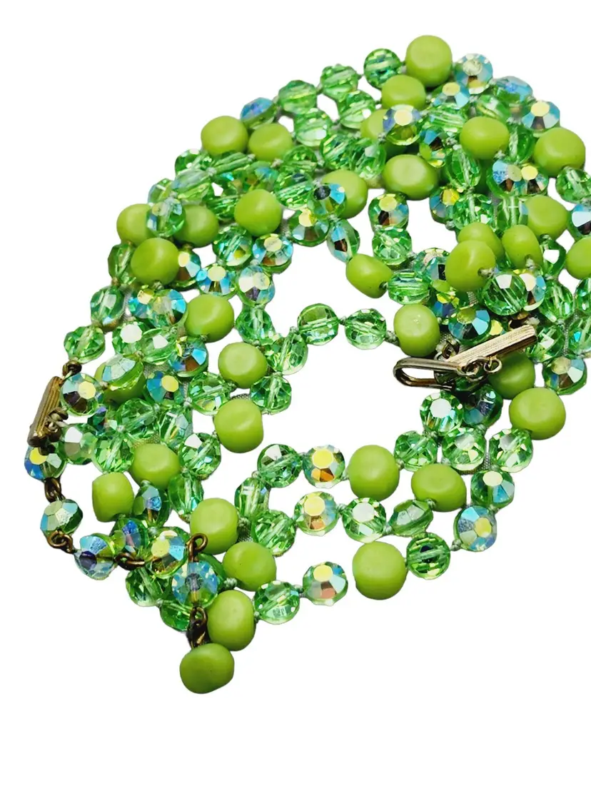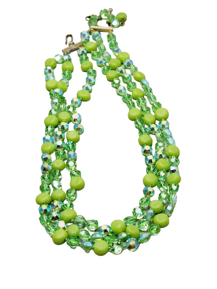 Absolutely gorgeous three-strand necklace made with green colored glass beads and crystal.