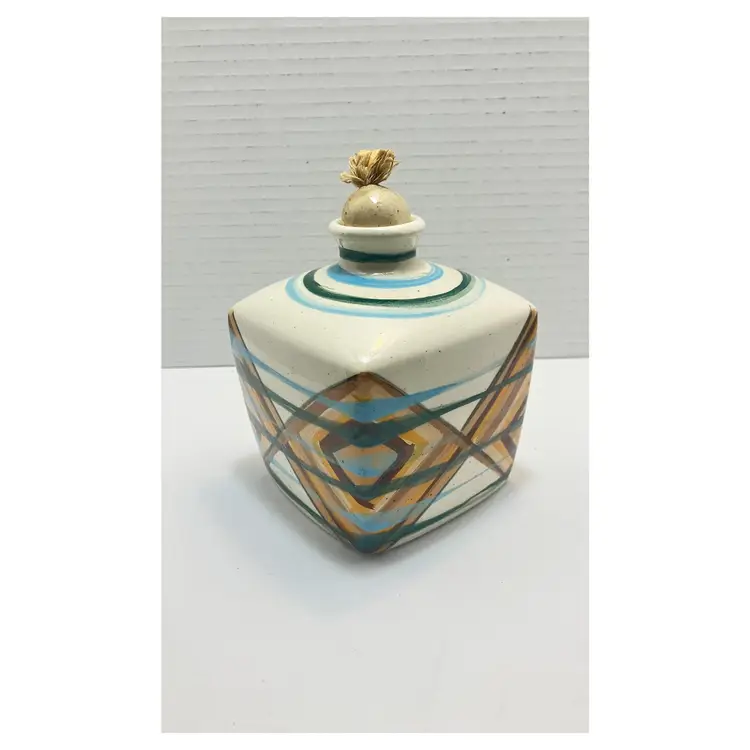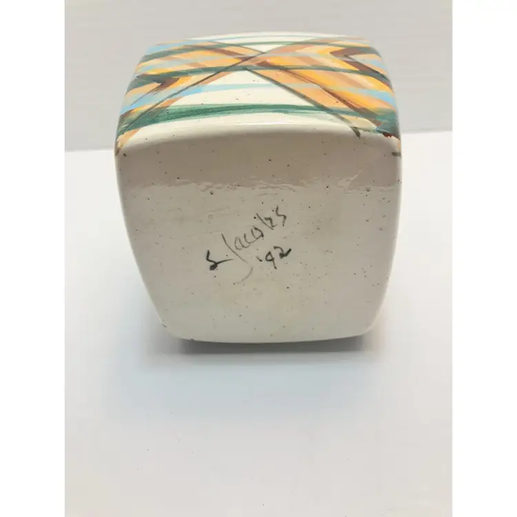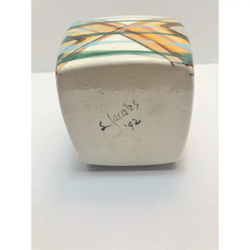 This hand-made pottery oil lamp is in never used condition with no chips or cracks or signs of wear. Has a pottery bead top threaded with lamp wick! Signed Jacob’s ‘92 on the bottom. Measures approximately 5” tall x3 1/2 inches wide and 41/2 inches from corner to corner.
