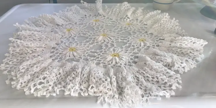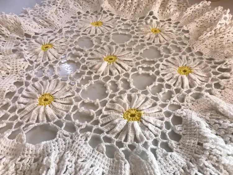This vintage handmade white doily is a charming addition to any table setting, featuring delicate daisies and ruffles. The round shape and 21” size make it versatile for various uses, while the lace material and crochet design add a touch of elegance. Perfect for collectors or those looking to add a unique and handmade touch to their home decor, this doily is sure to be a lovely and timeless piece for any kitchen or dining room.