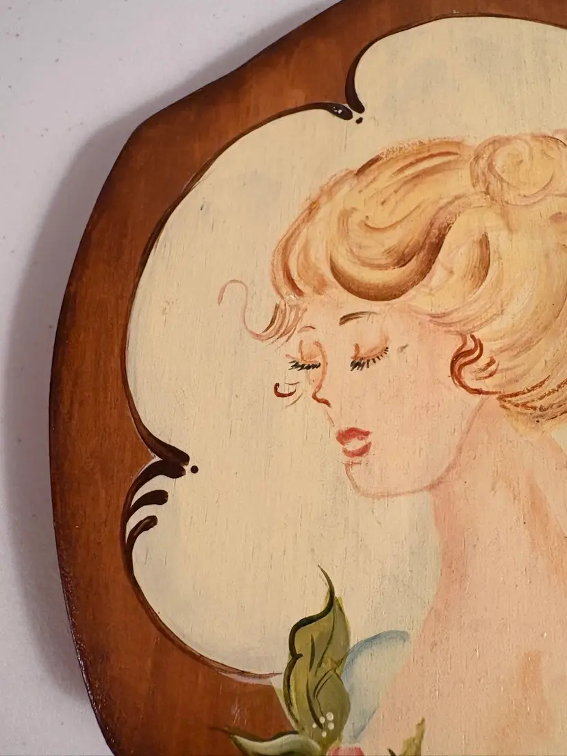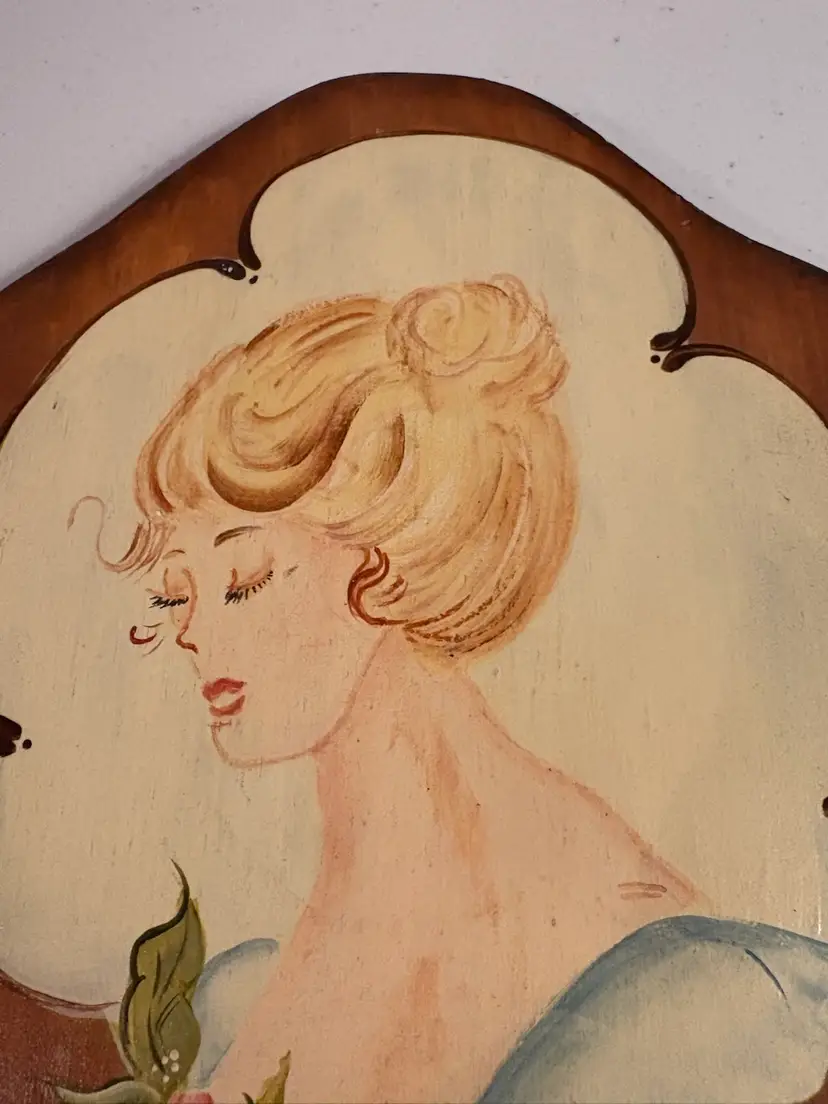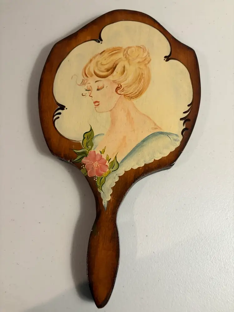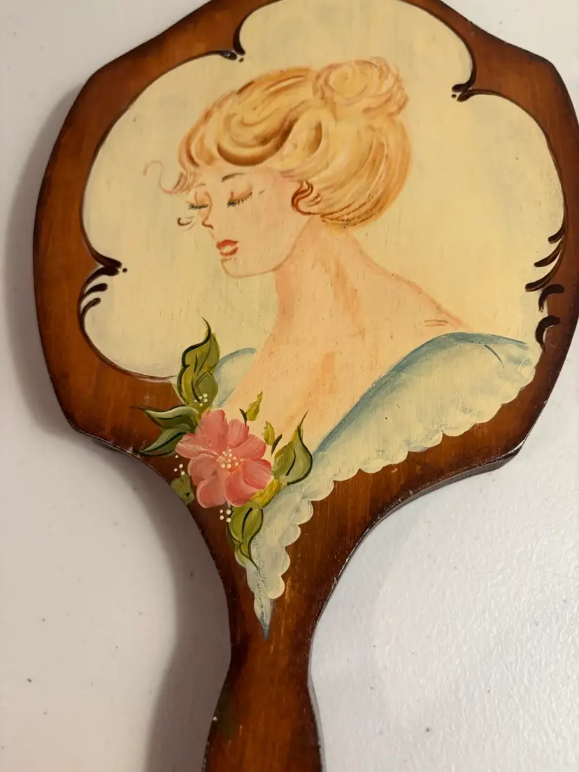This is a sturdy wood mirror with a delightful woman on the backside.