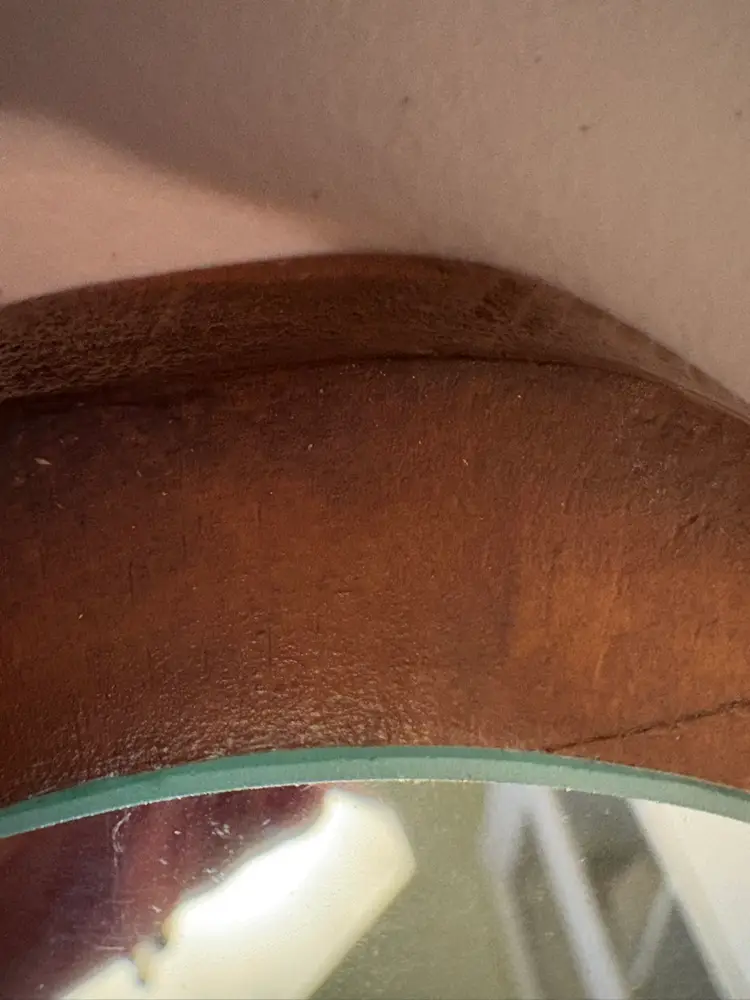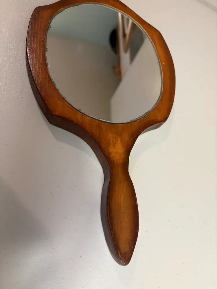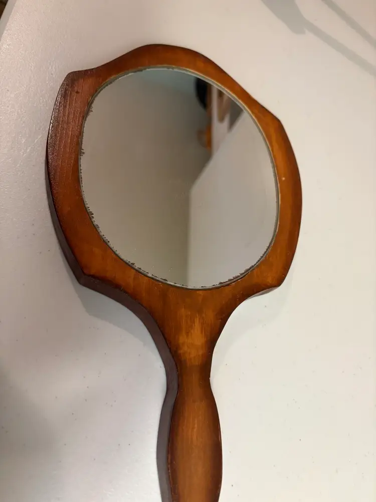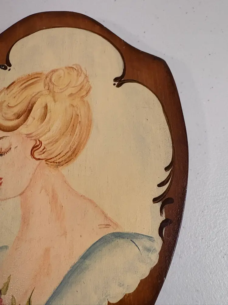 This is a sturdy wood mirror with a delightful woman on the backside.