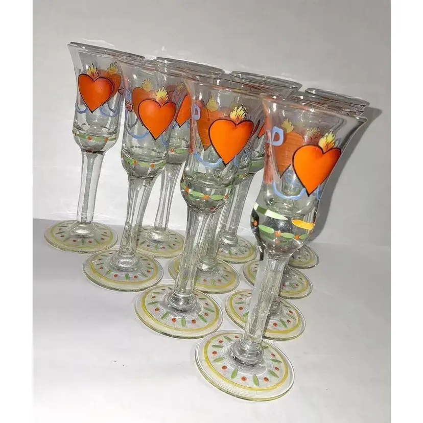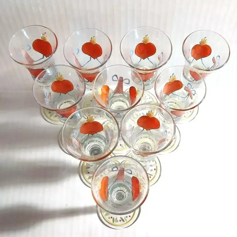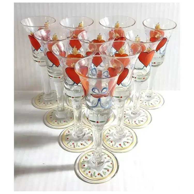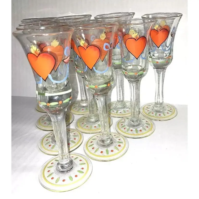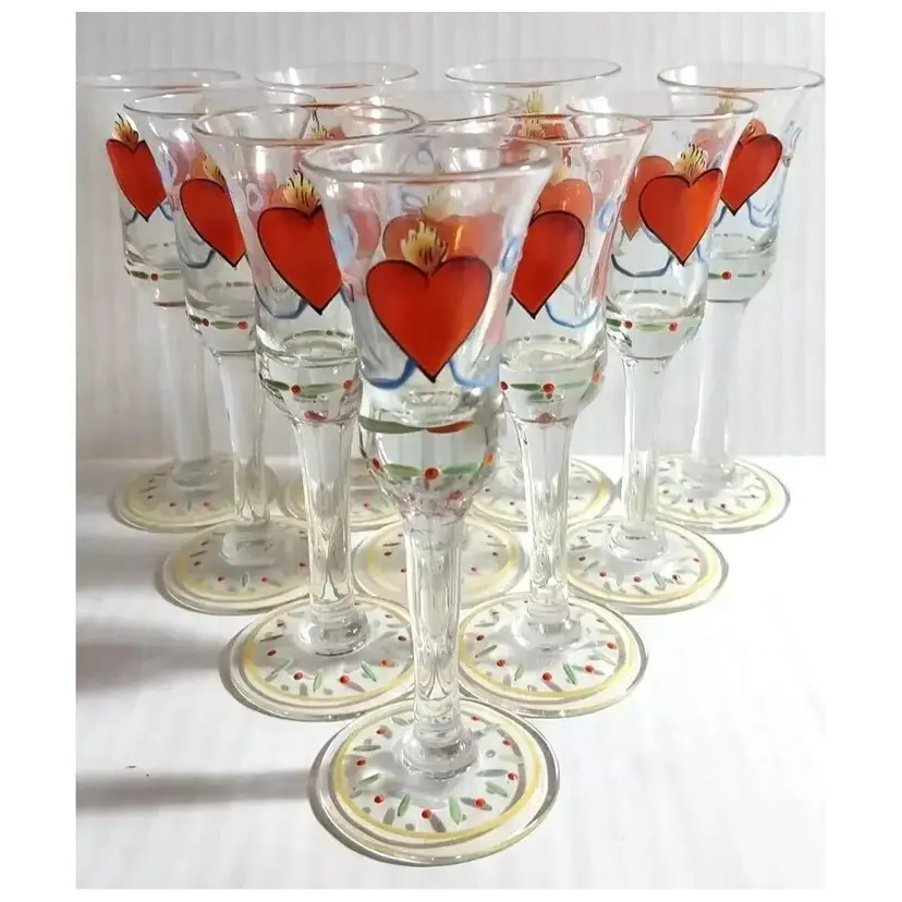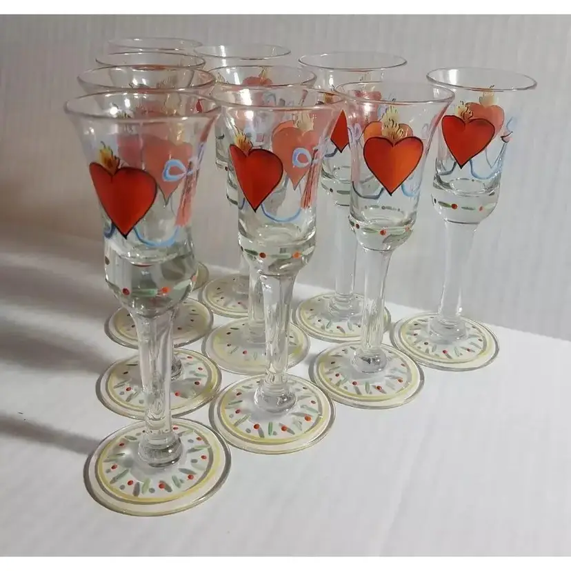 This is an AMAZING Set of 10, Vintage Folk Art, Hand-Painted, Burning Heart / Brinnande hjärta, Schnapps / Cordial Glasses / Shot Glasses, from Sweden or Denmark. Maker could be Holmegaard or Johansfors. They are very rare and especially RARE to find a set of 10 in such great condition!! They are hand-blown and hand-painted and feature not only the 'Burning Heart' design on each glass, but also, a wooden shoe and what looks like a sheaf of wheat, as well as other hand painted patterns/designs of ribbons, bows, dots, etc. around the glass and the on the base. They are approx. 5.75" high each-slight differences here and there because these were all hand-blown. 2.25" base diameter and 2.0" rim diameter. They are in GREAT CONDITION!!! Look at that PAINT!!!! These would stand out in any vintage barware collection!!! I recommend only gentle hand-washing of these, if used!!!