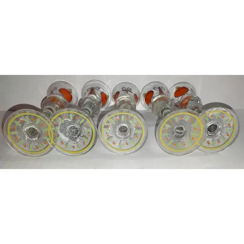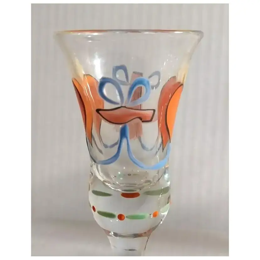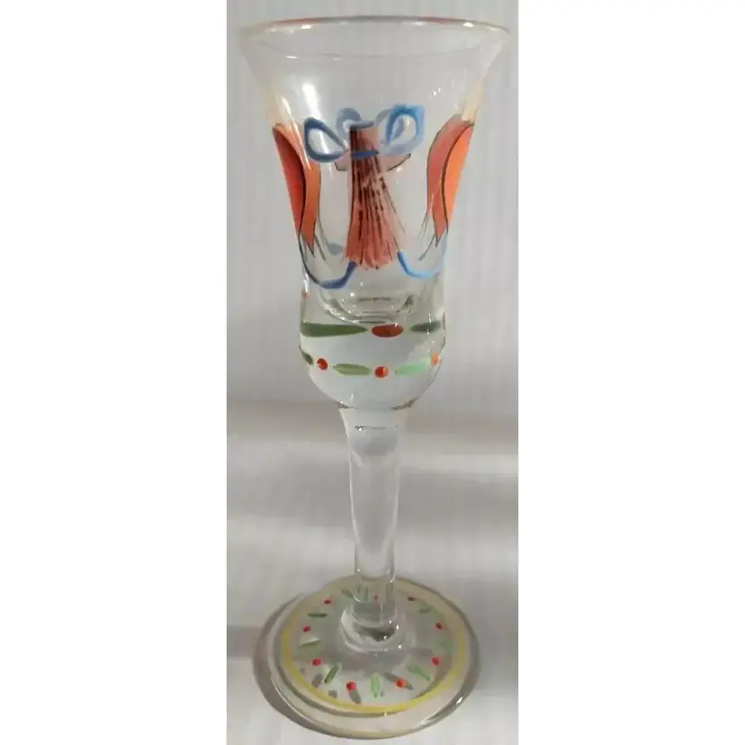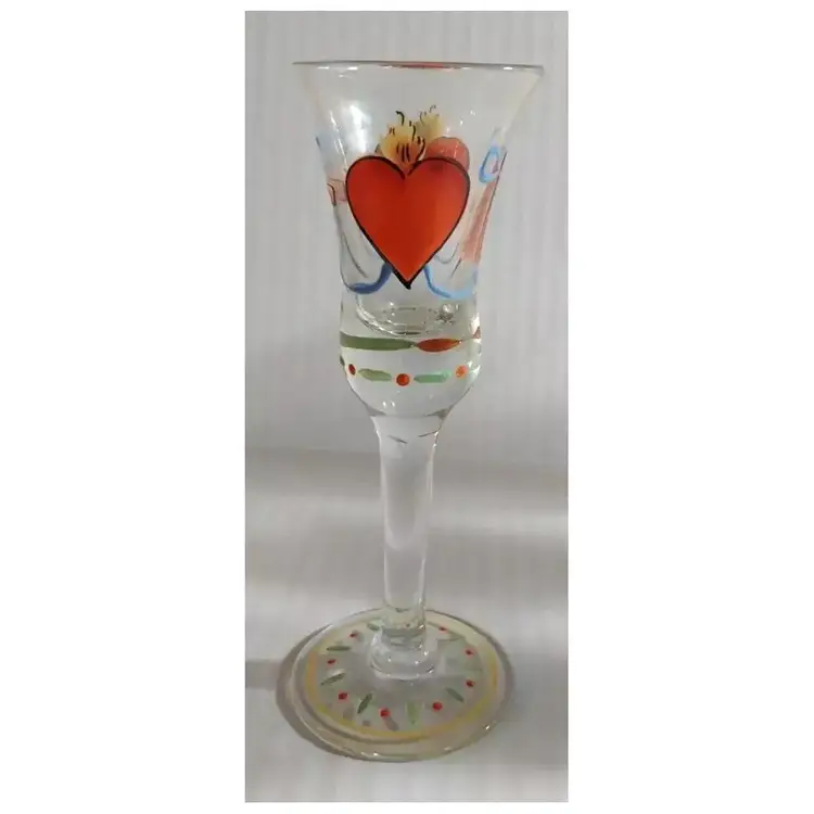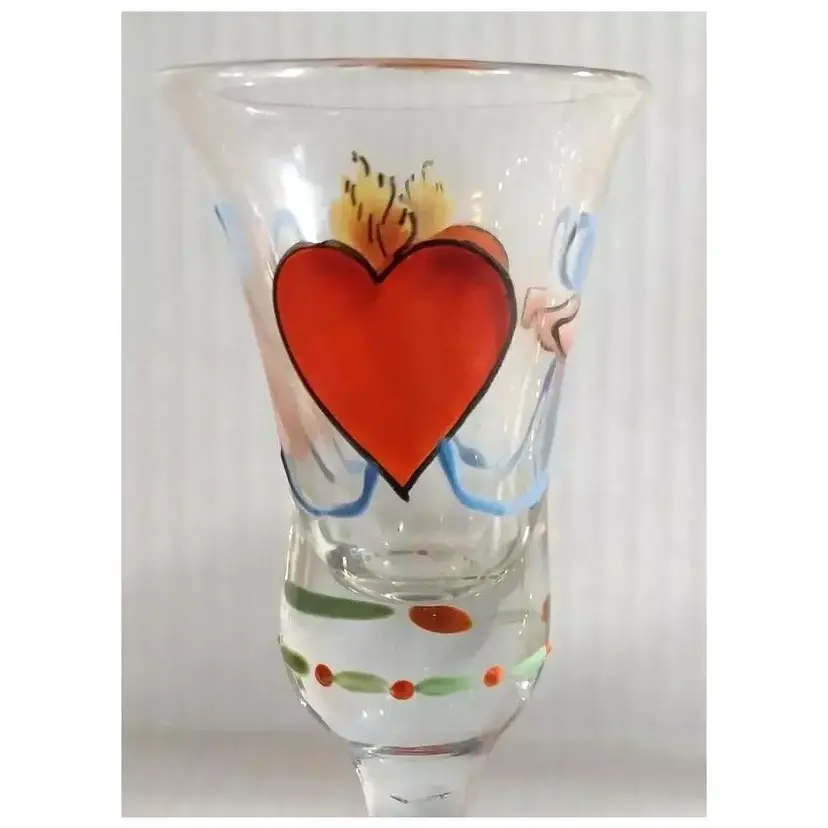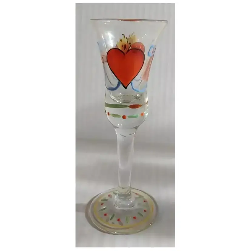 This is an AMAZING Set of 10, Vintage Folk Art, Hand-Painted, Burning Heart / Brinnande hjärta, Schnapps / Cordial Glasses / Shot Glasses, from Sweden or Denmark. Maker could be Holmegaard or Johansfors. They are very rare and especially RARE to find a set of 10 in such great condition!! They are hand-blown and hand-painted and feature not only the 'Burning Heart' design on each glass, but also, a wooden shoe and what looks like a sheaf of wheat, as well as other hand painted patterns/designs of ribbons, bows, dots, etc. around the glass and the on the base. They are approx. 5.75" high each-slight differences here and there because these were all hand-blown. 2.25" base diameter and 2.0" rim diameter. They are in GREAT CONDITION!!! Look at that PAINT!!!! These would stand out in any vintage barware collection!!! I recommend only gentle hand-washing of these, if used!!!