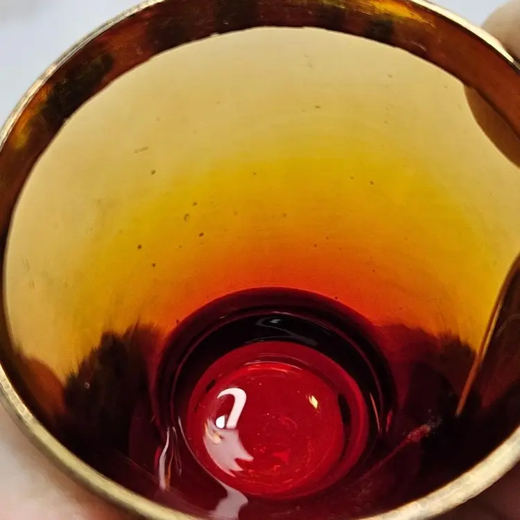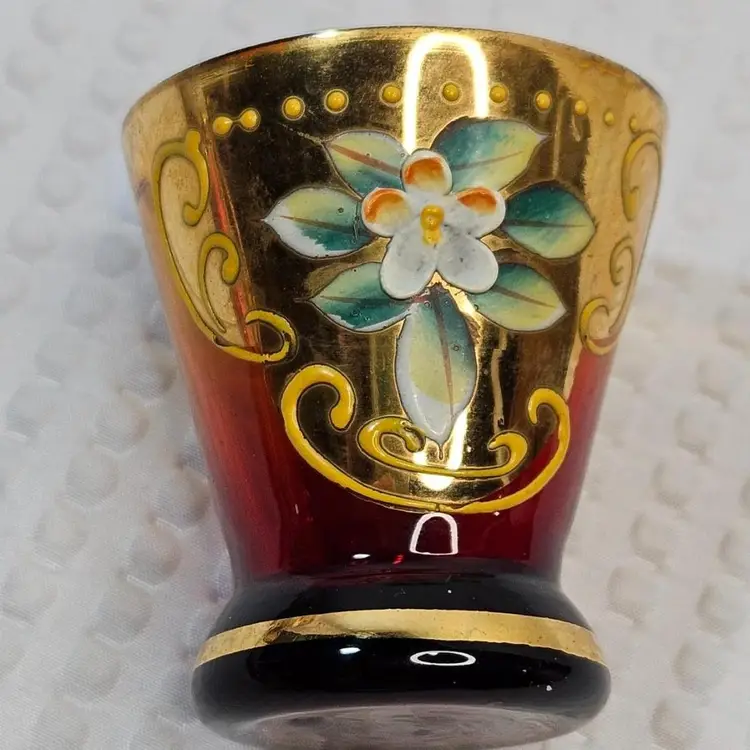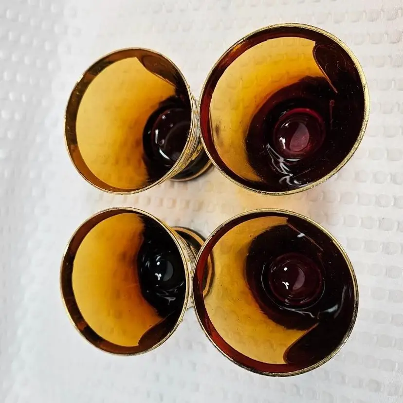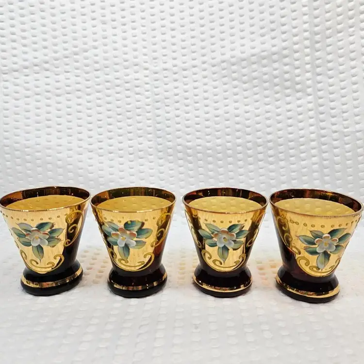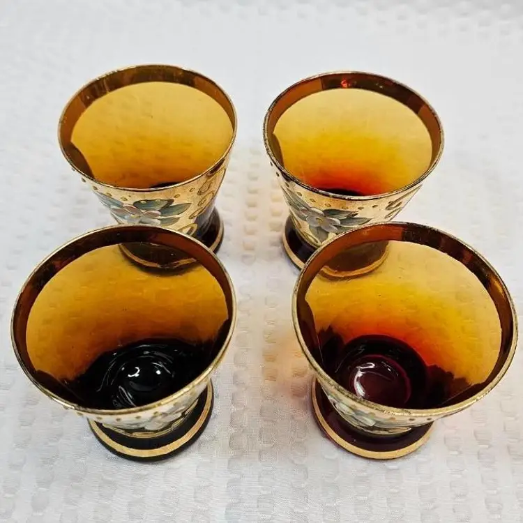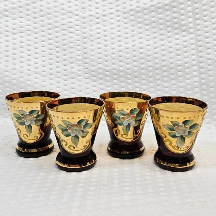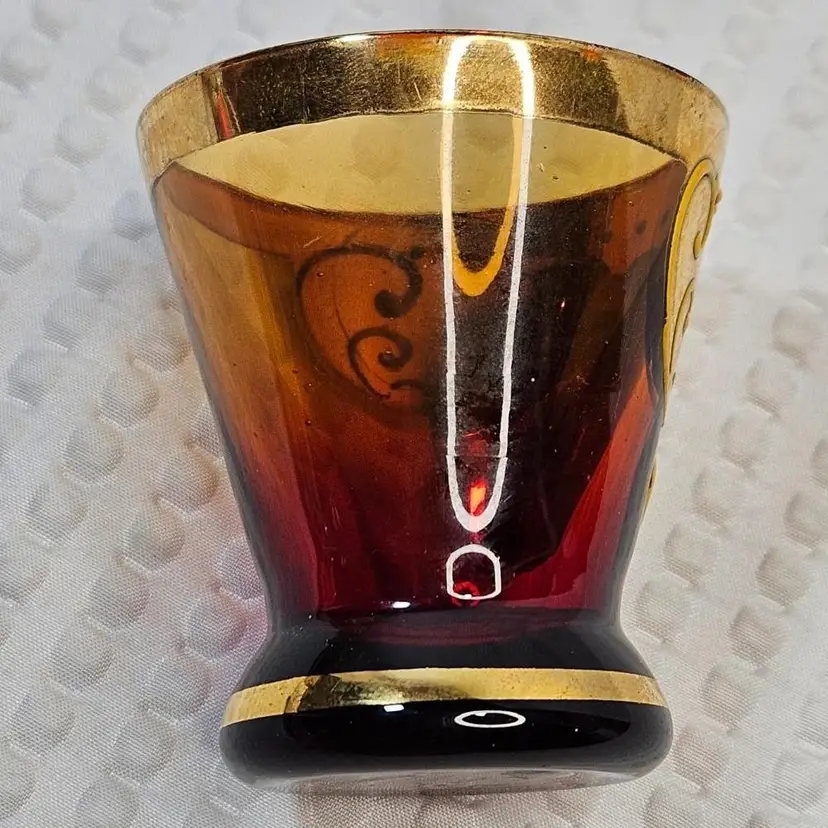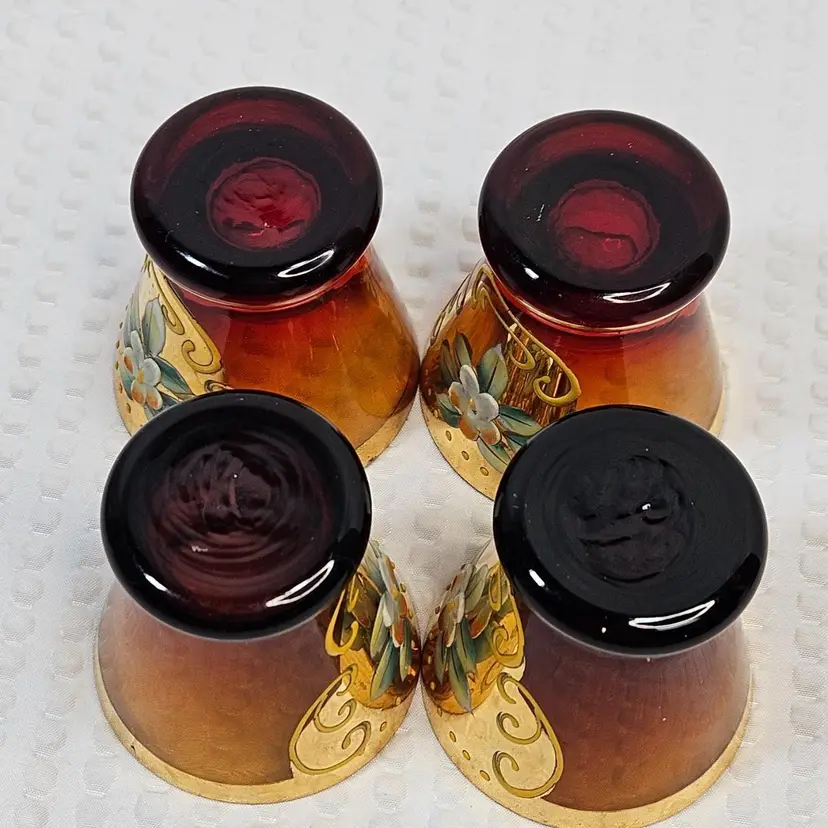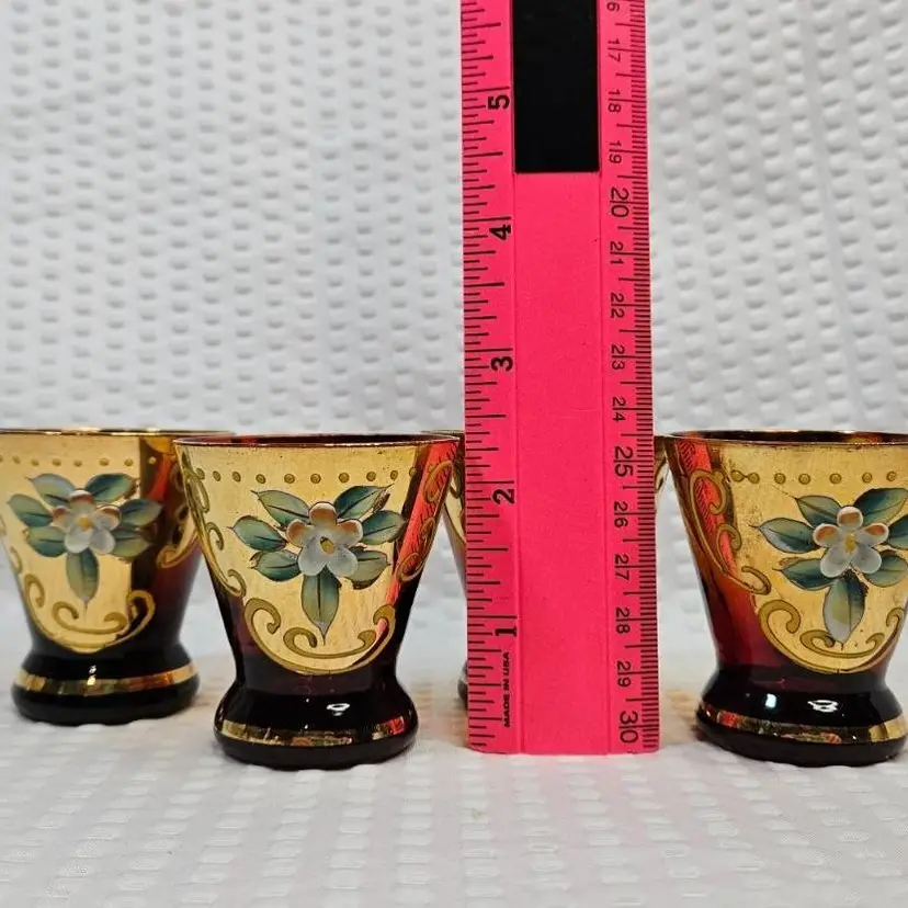 Item in good condition with minor signs of wear/age. There is slight wear, scratches, color loss to the gold gilding. Two of the glasses have more of a red hue or tint at the base. Each measures approximately 2.25 inches tall. Please examine all photos. Thank you.