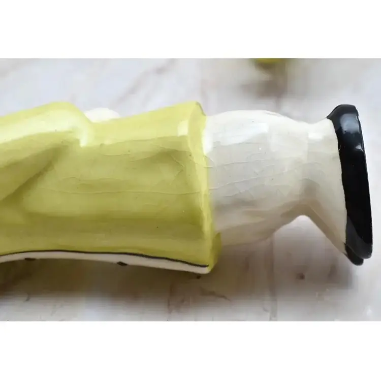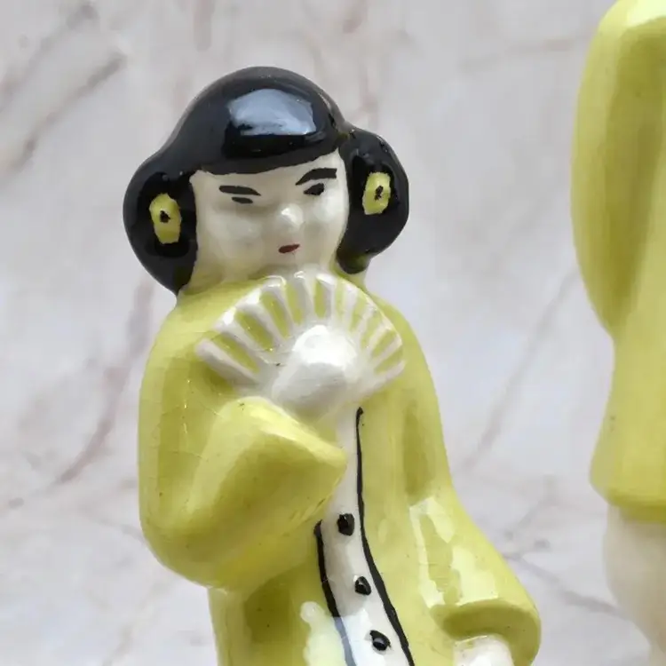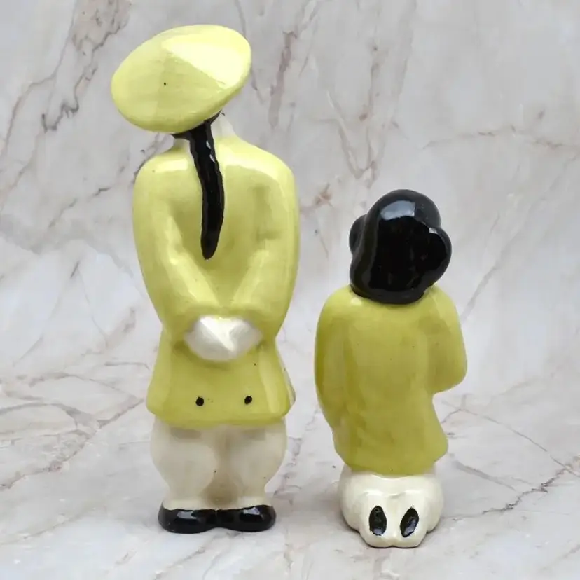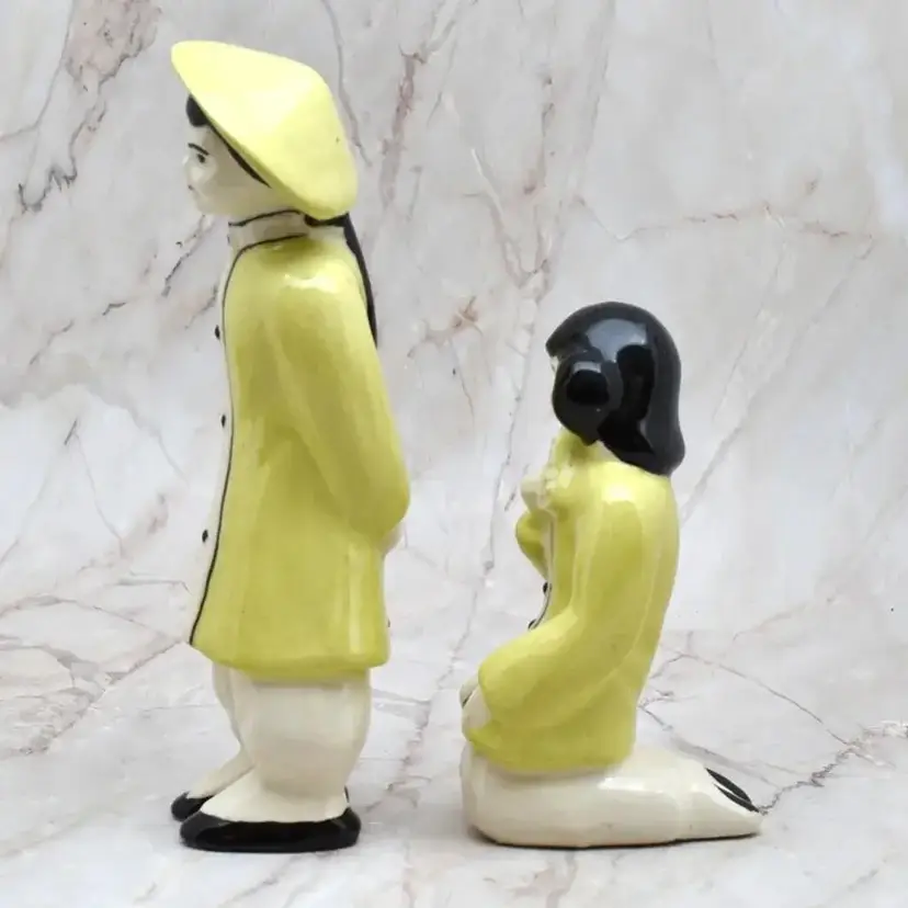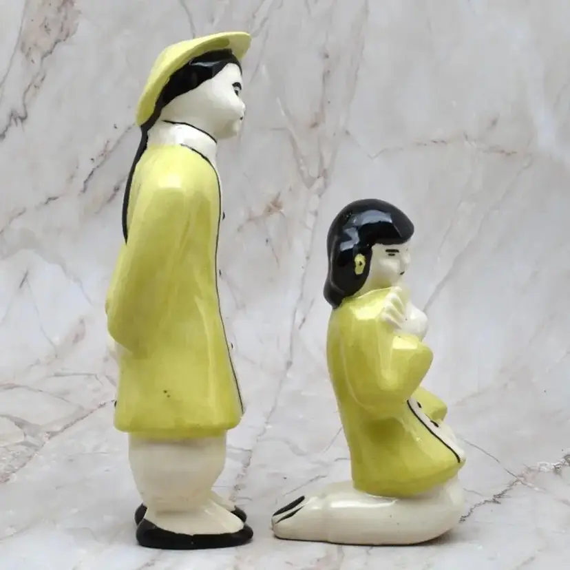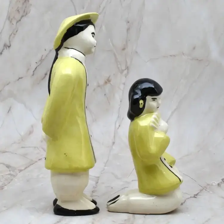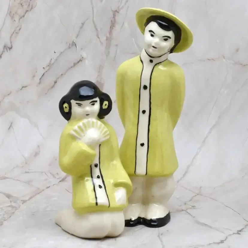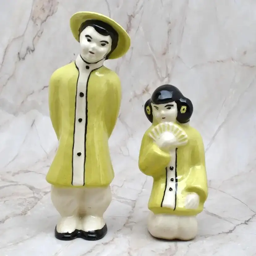 The woman is about 1.75" wide x about 2" deep x about 3.75" high. The man is about 5.5" high x about 1.75" wide x about 1.5" deep. They are ceramic.